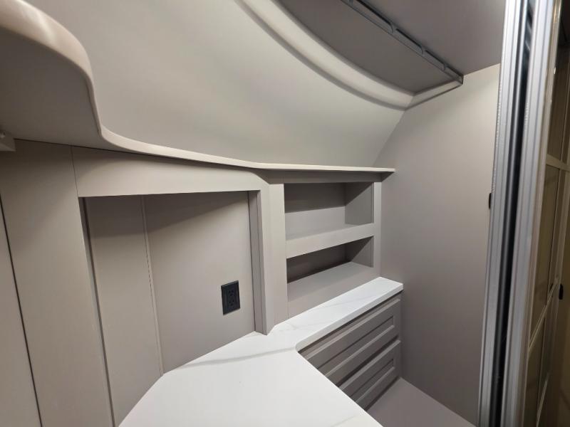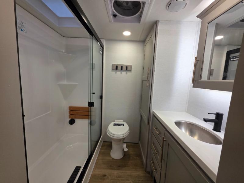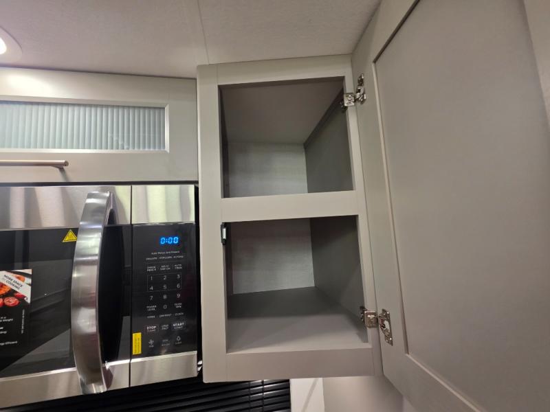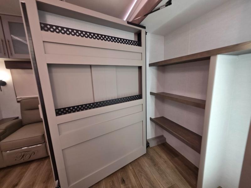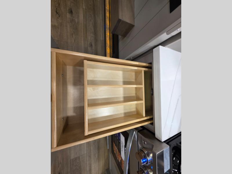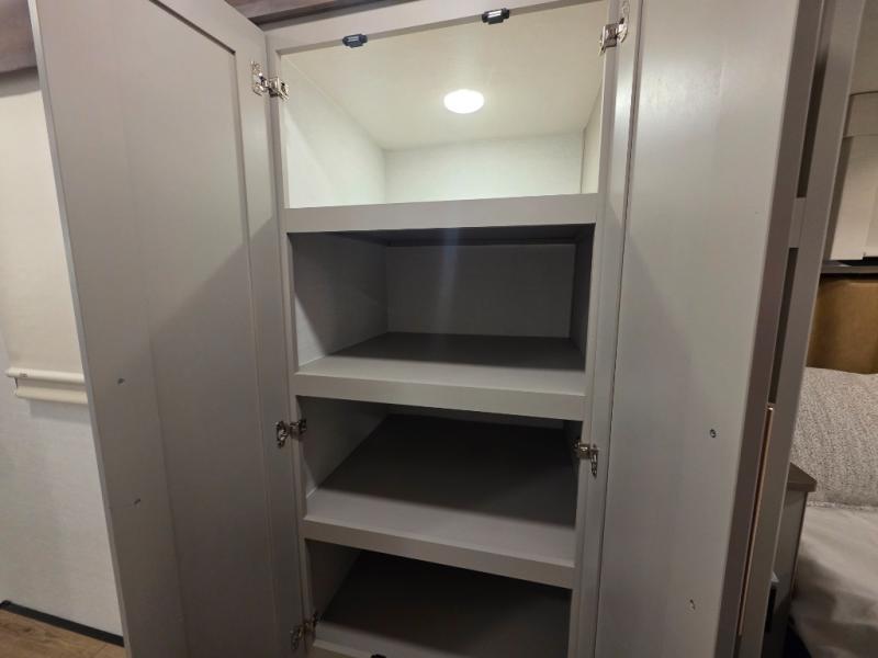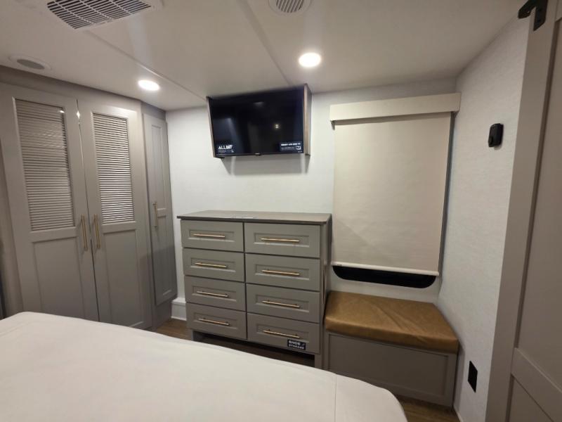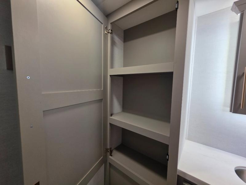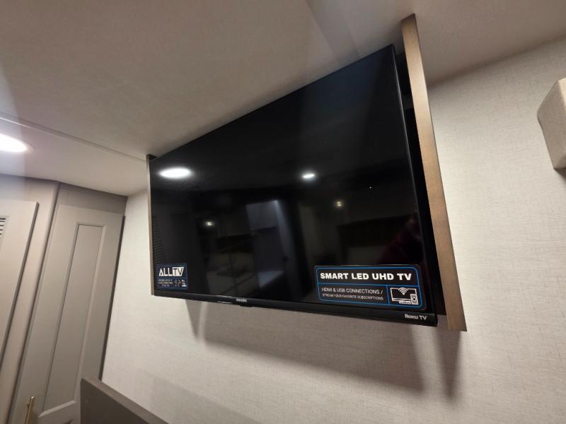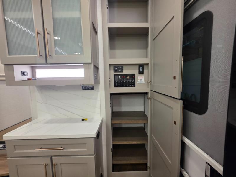 Travel to see family and friends while living in this RV or while on vacation! You will love the spacious rear living area thanks to the dual opposing slides which include the kitchen amenities and the 50" Smart TV with a fireplace. There is also a hidden pantry storage behind the TV for smart storage spaces! You can get comfortable on the dual recliner love seat or dine at the swivel table and desk. The kitchen island includes a sink and counter space to utilize many ways, plus there is dishwasher prep if you want to add that option. The full bathroom is up the steps towards the front bedroom and includes a spacious 61" x 30" shower. You even have more floor space in the hallway thanks to the third slide out which includes shelf storage, plus more shelves and a king bed in the bedroom.