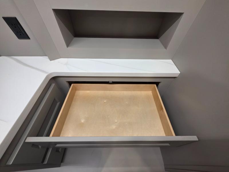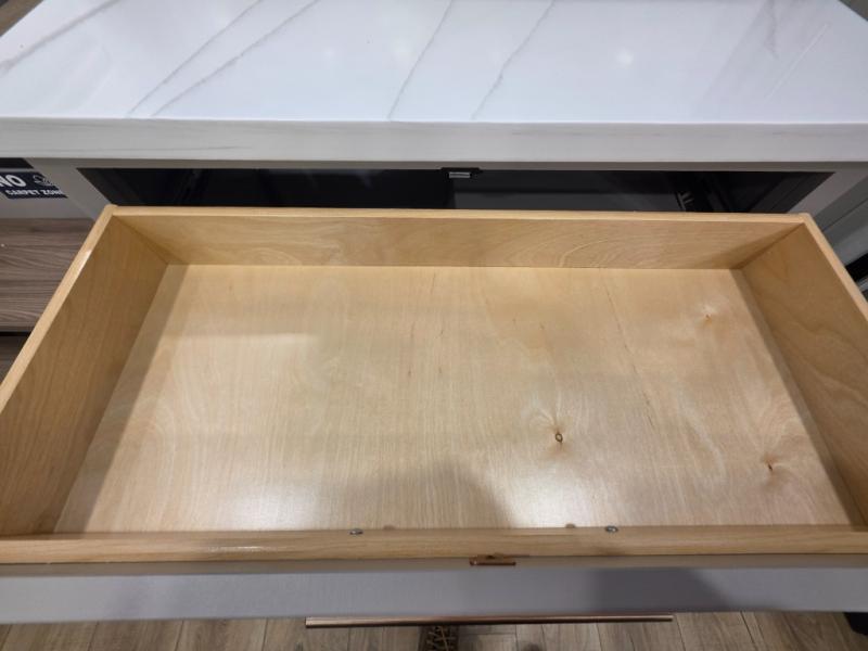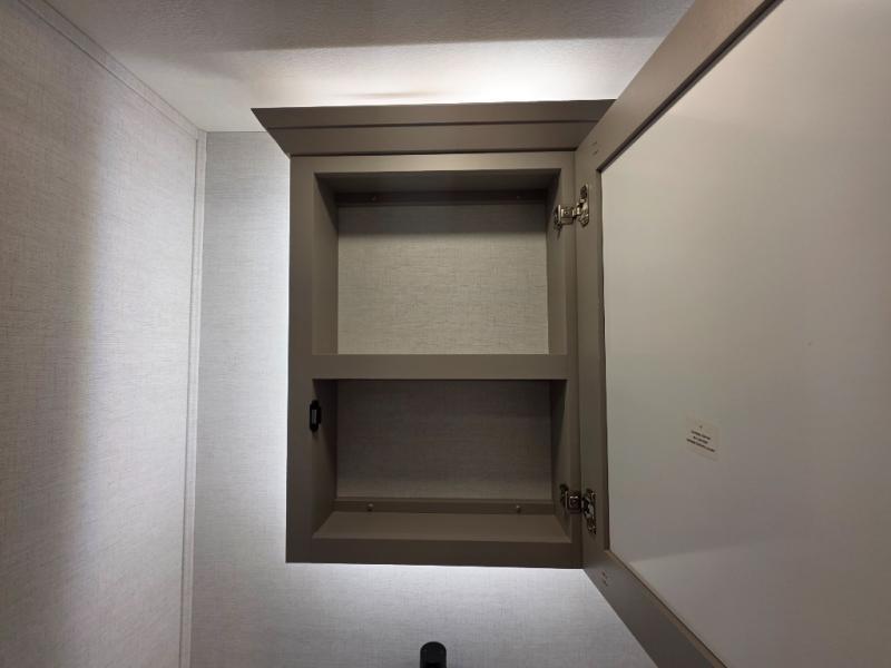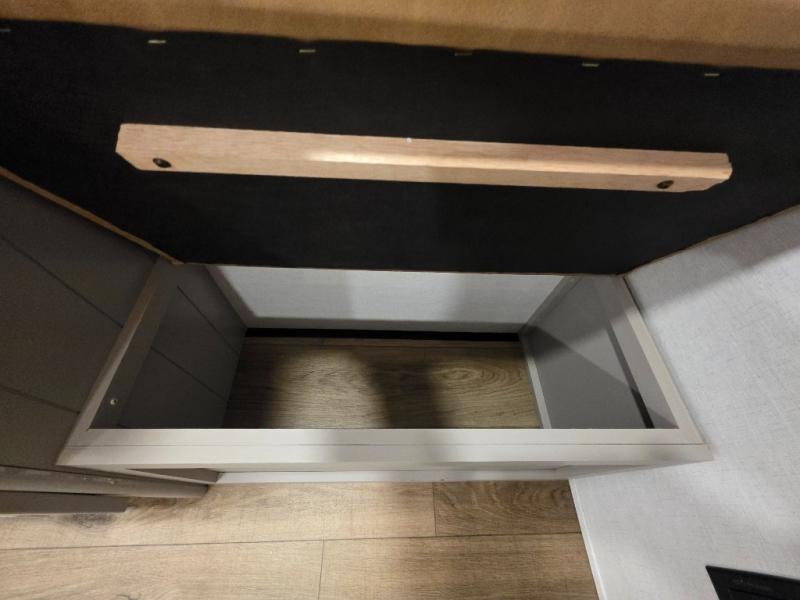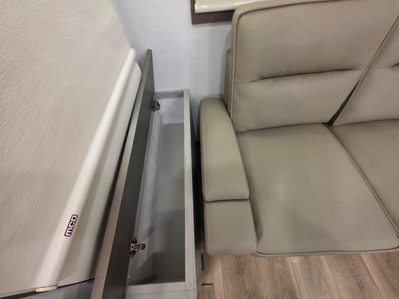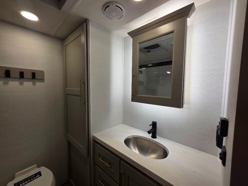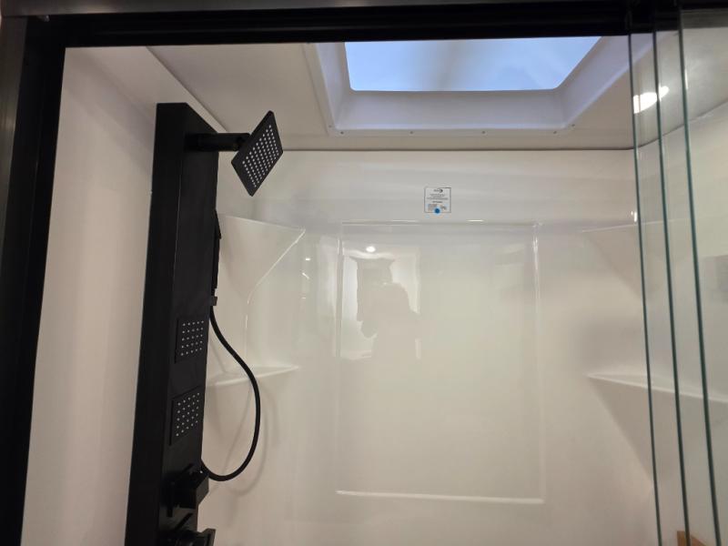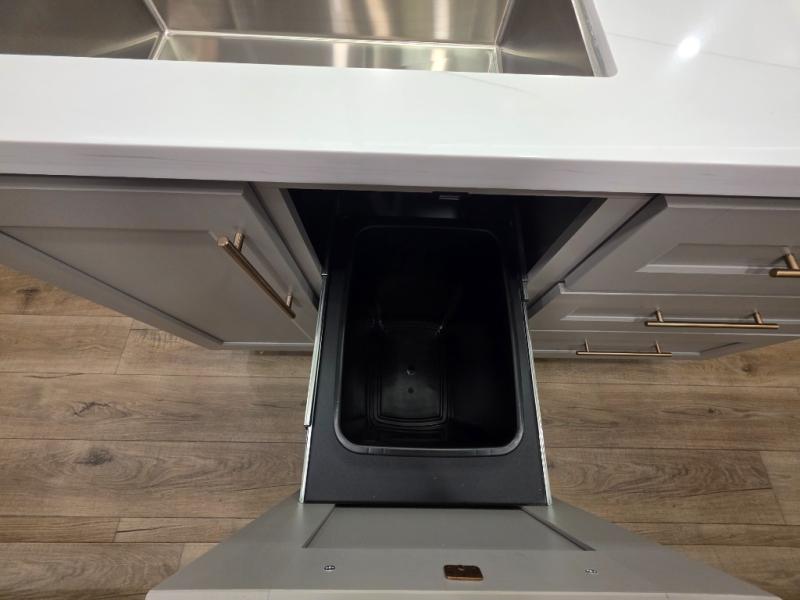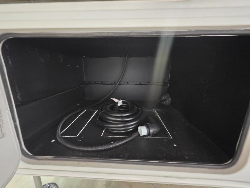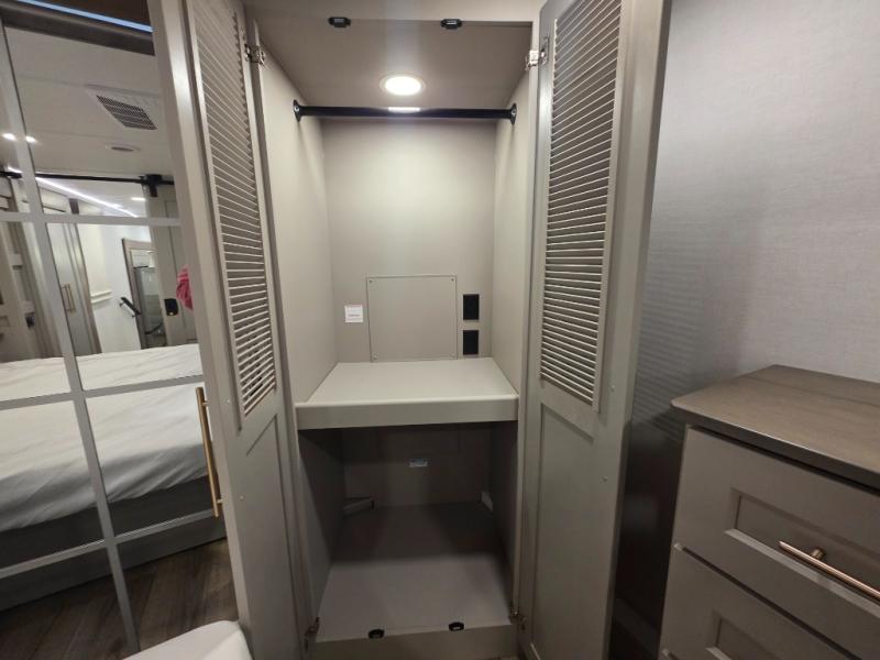 Travel to see family and friends while living in this RV or while on vacation! You will love the spacious rear living area thanks to the dual opposing slides which include the kitchen amenities and the 50" Smart TV with a fireplace. There is also a hidden pantry storage behind the TV for smart storage spaces! You can get comfortable on the dual recliner love seat or dine at the swivel table and desk. The kitchen island includes a sink and counter space to utilize many ways, plus there is dishwasher prep if you want to add that option. The full bathroom is up the steps towards the front bedroom and includes a spacious 61" x 30" shower. You even have more floor space in the hallway thanks to the third slide out which includes shelf storage, plus more shelves and a king bed in the bedroom.