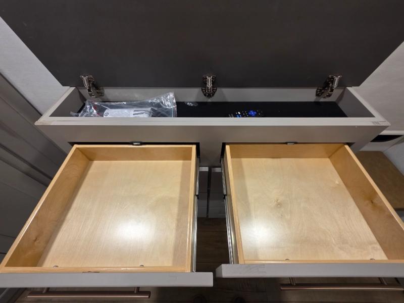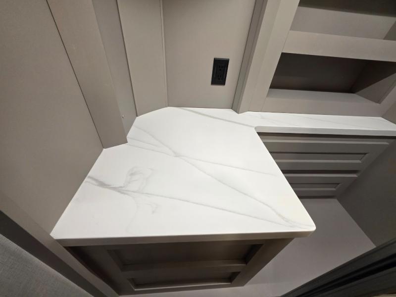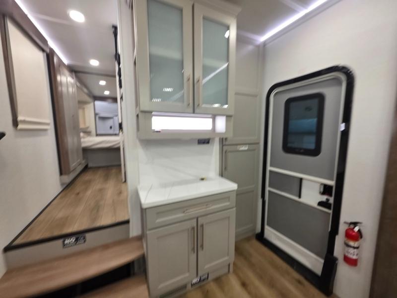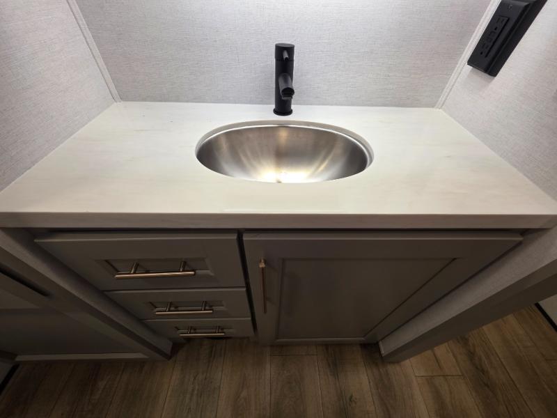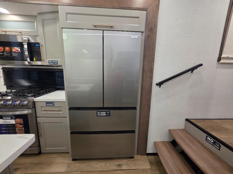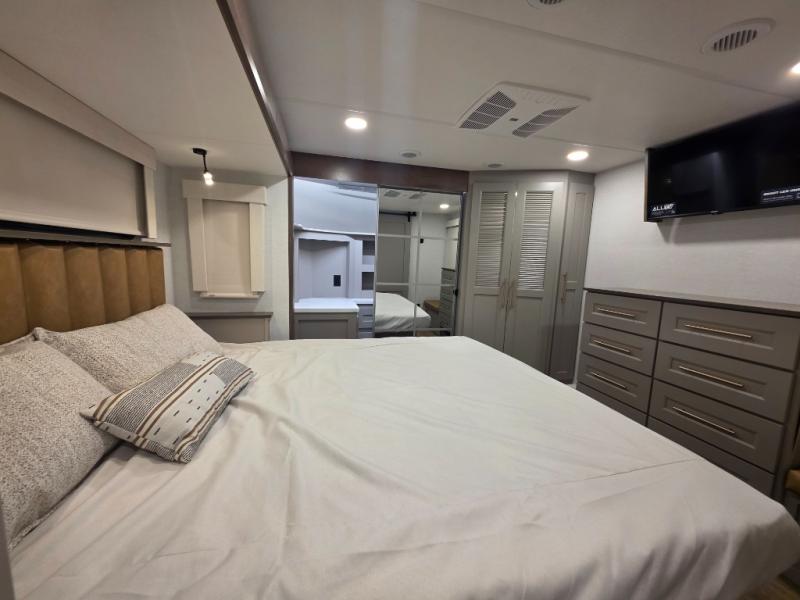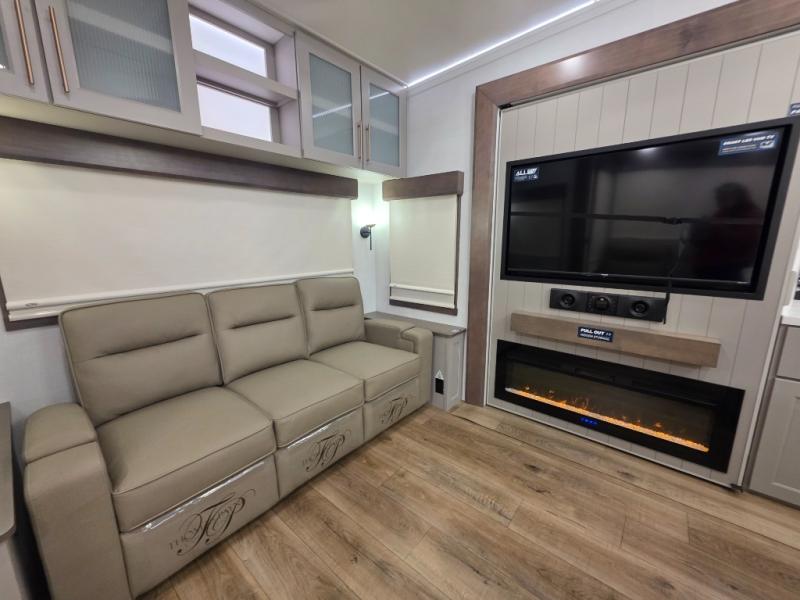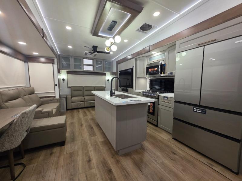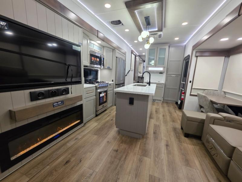 The Paradigm fifth wheels by Alliance RV are functional, high-quality, and luxurious for an unforgettable camping experience. There are three A/C units and a 40K BTU furnace to keep you comfortable year around, and you'll appreciate additional convenient amenities, like the all-in-one enclosed/heated utility center and the color coded and numbered wiring. A Helux Series coil spring pin box comes standard for hassle-free towing, along with Curt 8,000 lb. axles. You'll love the kitchen with its LG solid surface countertops and Lusso range, plus there is LED motion lighting in the pantry and a Maxx fan with a rain sensor to keep everything fresh when making dinner. Each model also includes an HD Smart TV in the living room and bedroom. And of course there are a variety of options you can choose from to further customize your fifth wheel; dual pane windows, Super Solar Plus, slide out awning toppers, and generator prep or a generator to name a few!