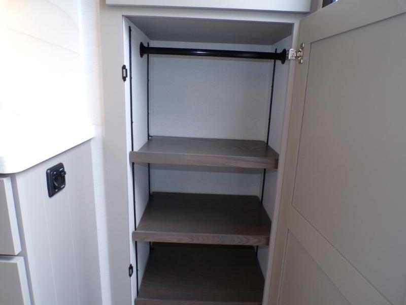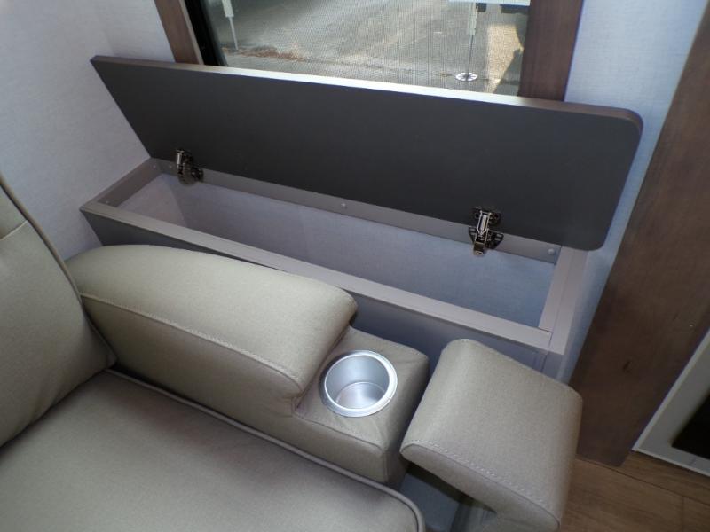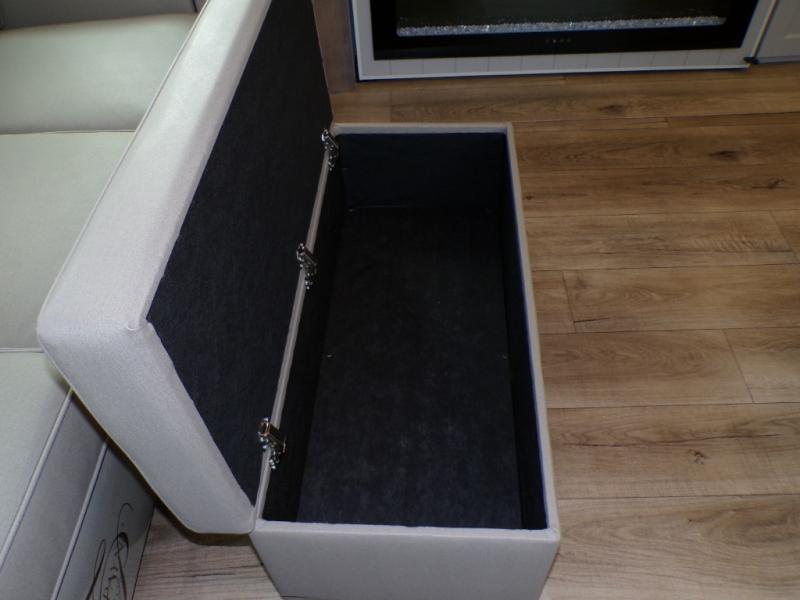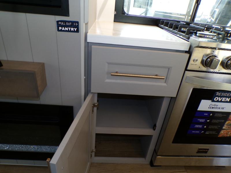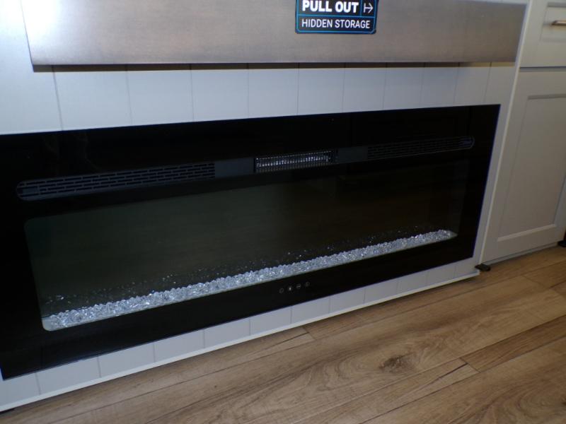 Travel to see family and friends while living in this RV or while on vacation! You will love the spacious rear living area thanks to the dual opposing slides which include the kitchen amenities and the 50" Smart TV with a fireplace. There is also a hidden pantry storage behind the TV for smart storage spaces! You can get comfortable on the dual recliner love seat or dine at the swivel table and desk. The kitchen island includes a sink and counter space to utilize many ways, plus there is dishwasher prep if you want to add that option. The full bathroom is up the steps towards the front bedroom and includes a spacious 61" x 30" shower. You even have more floor space in the hallway thanks to the third slide out which includes shelf storage, plus more shelves and a king bed in the bedroom.