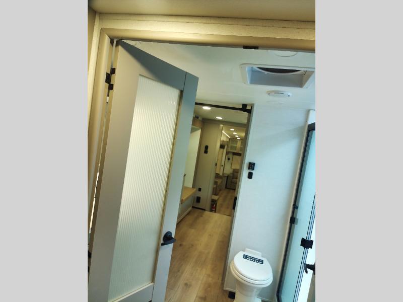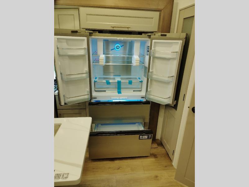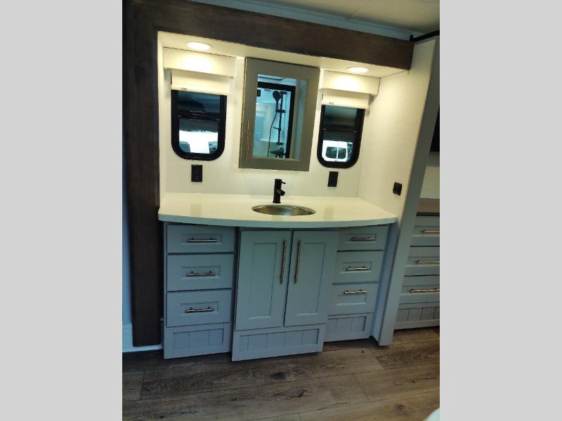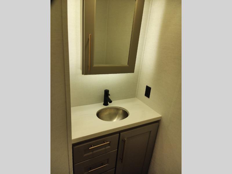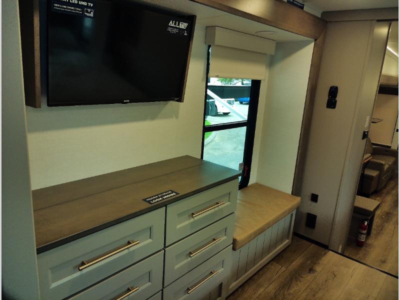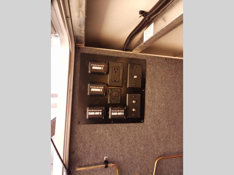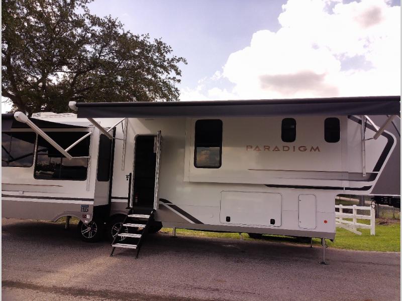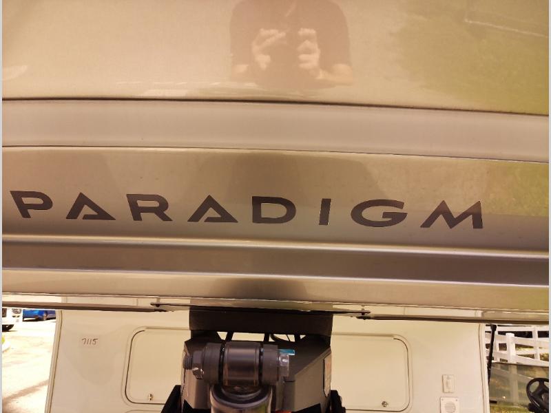 Whether you decide to be a full-timer or a long-trip traveler, this Paradigm offers so many comforts and conveniences you will love! The large full bathroom might be the reason you decide to be a new owner because you will have a large 61" x 30" shower to get cleaned up in, linen storage, and a walk-in closet with a hamper, shelves, and a space prepped for an optional washer/dryer. The bedroom allows you to sleep like a king and gives you extra floor space with the two slides, and there is storage in the flip-top dresser and under the seat, plus you can watch the Smart TV. The space saving sliding doors offer style as well. The cook will love all the residential appliances, including a residential refrigerator. The kitchen island gives you a large sink and dishwasher prep also. The half bath is super convenient just like the entry sitting bench/coat rack and closet. And you can relax on the sleeper sofa, dual recliner love seat, or swivel table and desk.