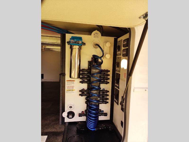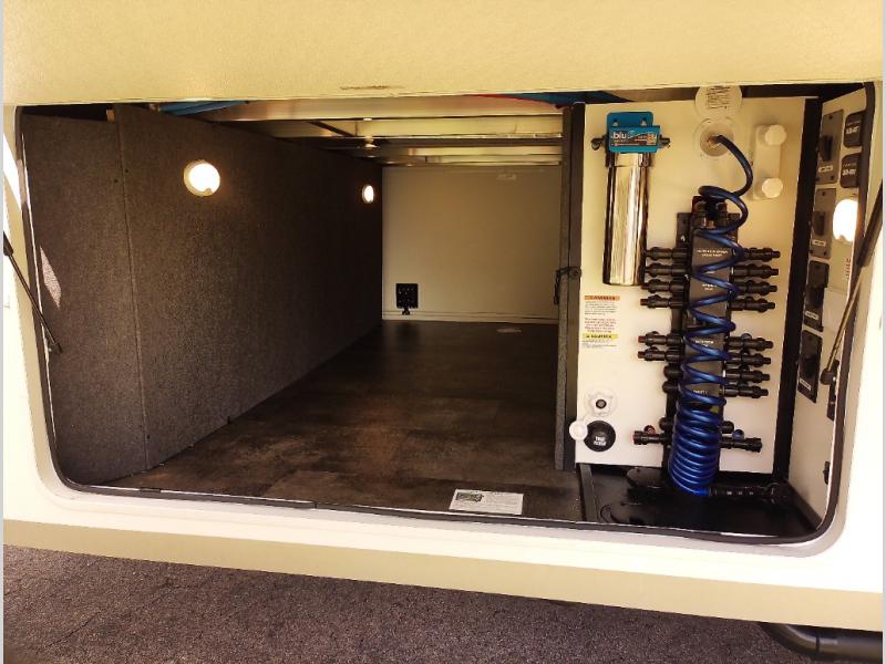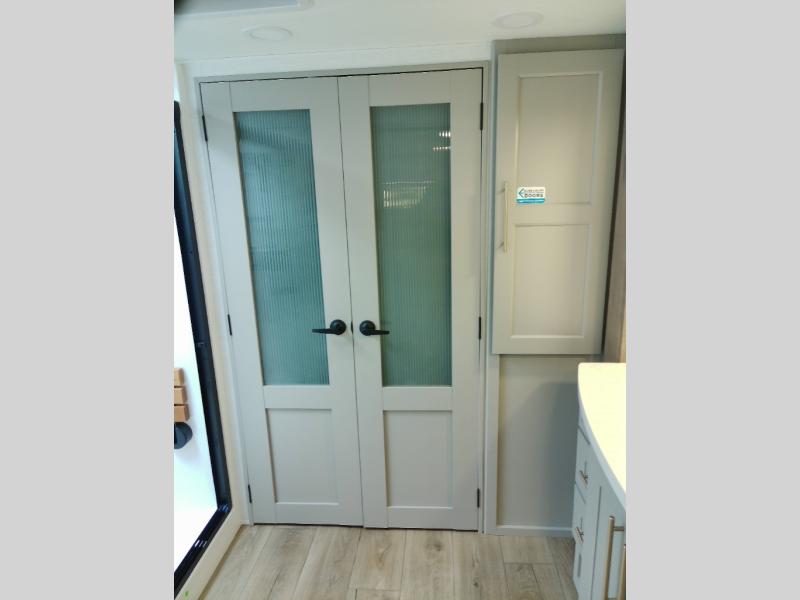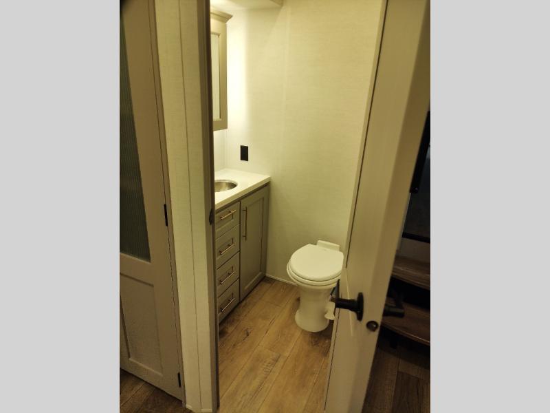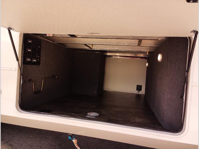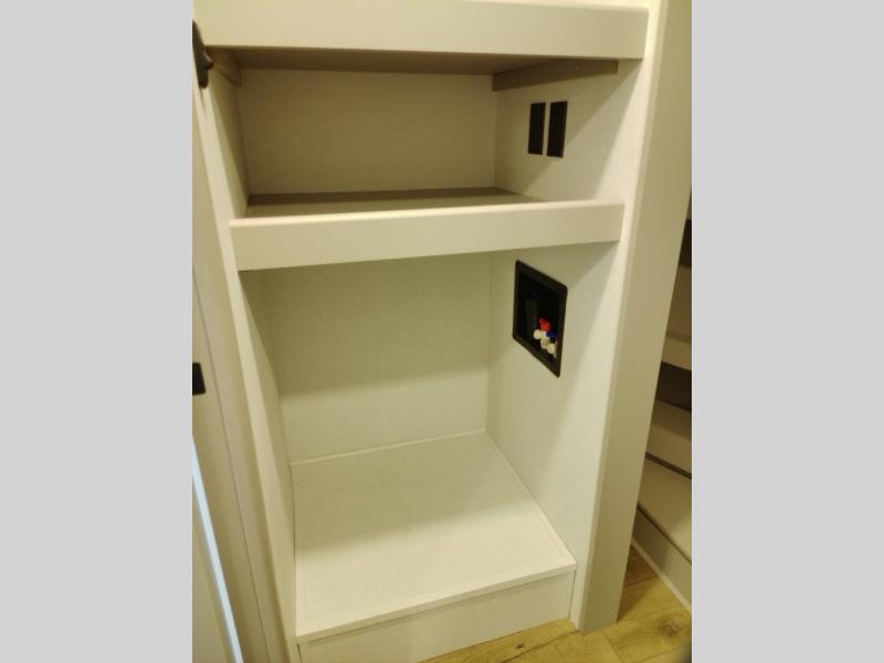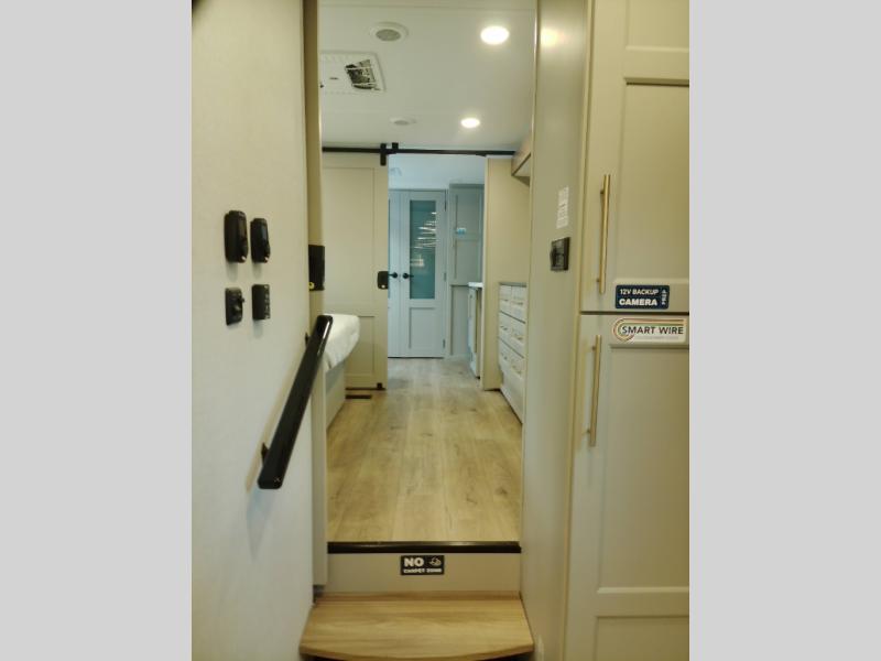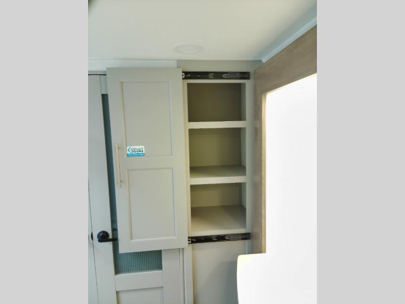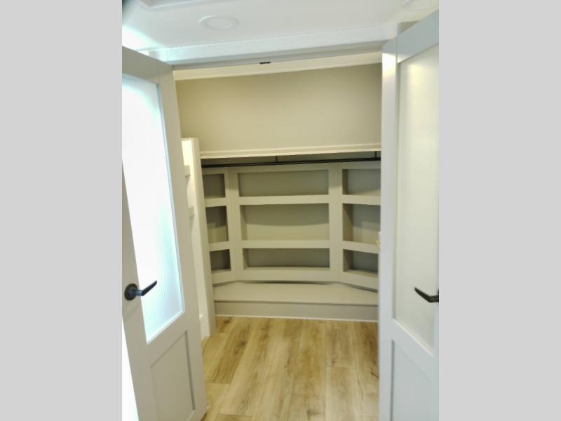 Whether you decide to be a full-timer or a long-trip traveler, this Paradigm offers so many comforts and conveniences you will love! The large full bathroom might be the reason you decide to be a new owner because you will have a large 61" x 30" shower to get cleaned up in, linen storage, and a walk-in closet with a hamper, shelves, and a space prepped for an optional washer/dryer. The bedroom allows you to sleep like a king and gives you extra floor space with the two slides, and there is storage in the flip-top dresser and under the seat, plus you can watch the Smart TV. The space saving sliding doors offer style as well. The cook will love all the residential appliances, including a residential refrigerator. The kitchen island gives you a large sink and dishwasher prep also. The half bath is super convenient just like the entry sitting bench/coat rack and closet. And you can relax on the sleeper sofa, dual recliner love seat, or swivel table and desk.