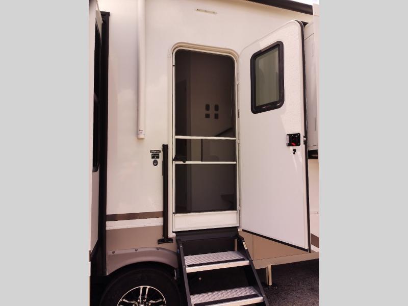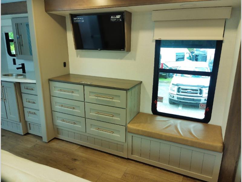 The Paradigm fifth wheels by Alliance RV are functional, high-quality, and luxurious for an unforgettable camping experience. There are three A/C units and a 40K BTU furnace to keep you comfortable year around, and you'll appreciate additional convenient amenities, like the all-in-one enclosed/heated utility center and the color coded and numbered wiring. A Helux Series coil spring pin box comes standard for hassle-free towing, along with Super-G 4,400 lb. rated tires and Dexter 7,000 lb. axles. You'll love the kitchen with its LG solid surface countertops and Lusso range, plus there is LED motion lighting in the pantry and a Maxx fan with a rain sensor to keep everything fresh when making dinner. Each model also includes an HD Smart TV in the living room and bedroom, plus a Winegard Air 360 antenna to keep you connected to the outside world. And of course there are a variety of options you can choose from to further customize your fifth wheel; dual pane windows, Super Solar Plus, slide out awning toppers, and generator prep or a generator to name a few!