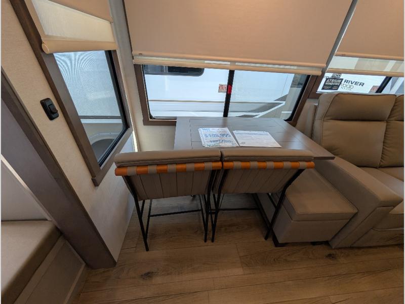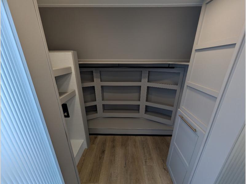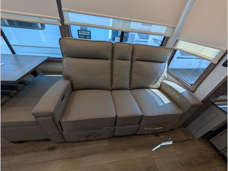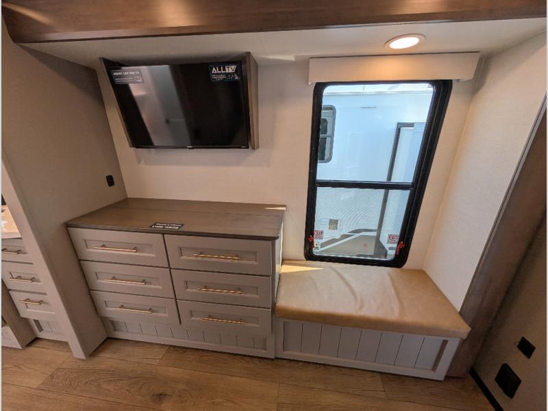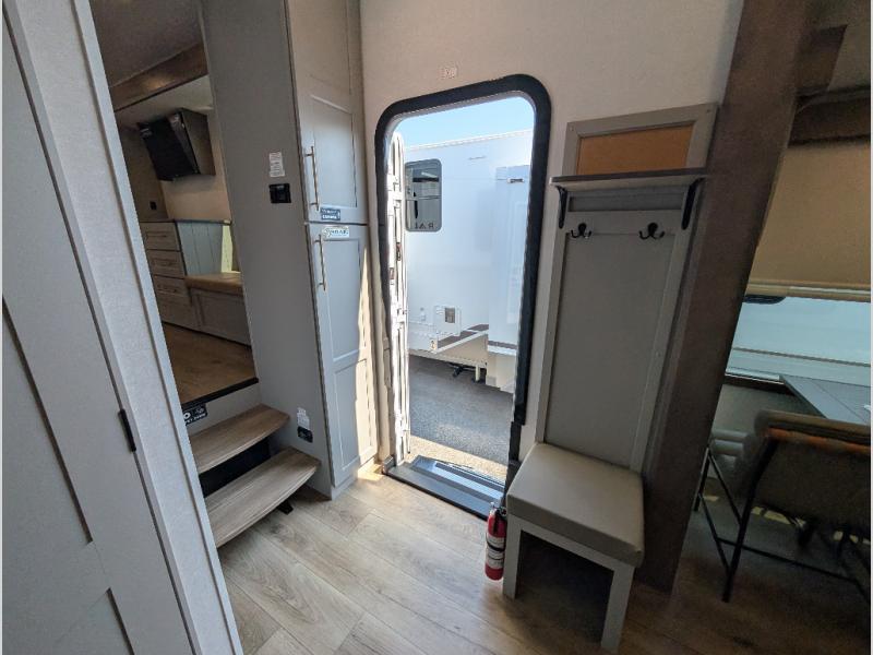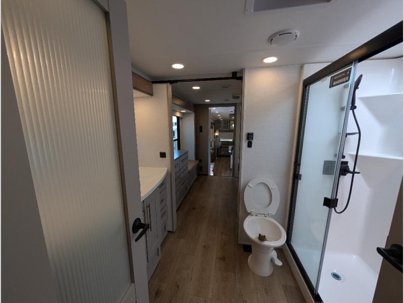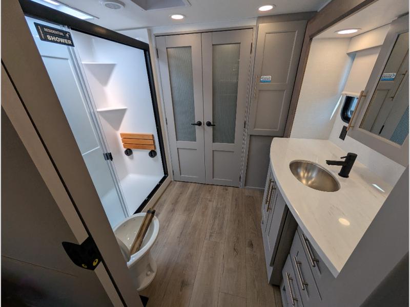 Whether you decide to be a full-timer or a long-trip traveler, this Paradigm offers so many comforts and conveniences you will love! The large full bathroom might be the reason you decide to be a new owner because you will have a large 61" x 30" shower to get cleaned up in, linen storage, and a walk-in closet with a hamper, shelves, and a space prepped for an optional washer/dryer. The bedroom allows you to sleep like a king and gives you extra floor space with the two slides, and there is storage in the flip-top dresser and under the seat, plus you can watch the Smart TV. The space saving sliding doors offer style as well. The cook will love all the residential appliances, including a residential refrigerator. The kitchen island gives you a large sink and dishwasher prep also. The half bath is super convenient just like the entry sitting bench/coat rack and closet. And you can relax on the sleeper sofa, dual recliner love seat, or swivel table and desk.