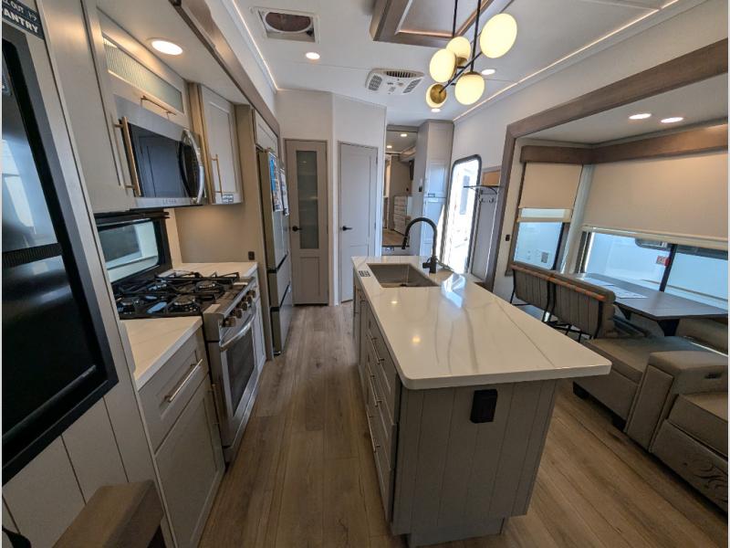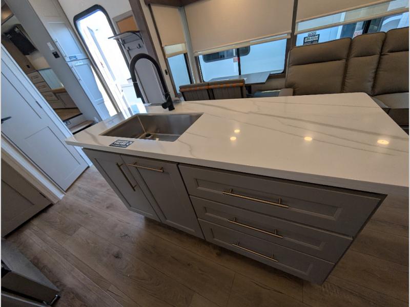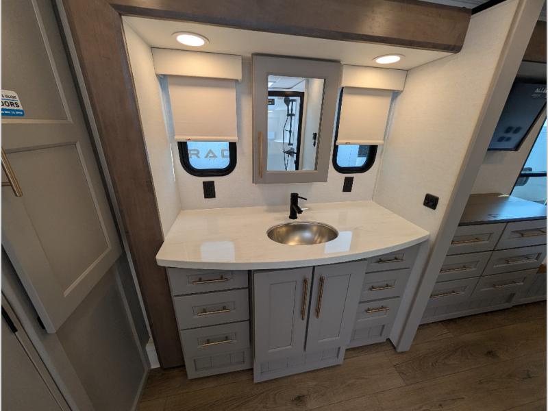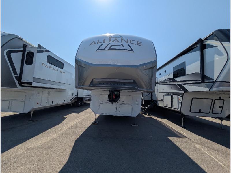 The Paradigm fifth wheels by Alliance RV are functional, high-quality, and luxurious for an unforgettable camping experience. There are three A/C units and a 40K BTU furnace to keep you comfortable year around, and you'll appreciate additional convenient amenities, like the all-in-one enclosed/heated utility center and the color coded and numbered wiring. A Helux Series coil spring pin box comes standard for hassle-free towing, along with Super-G 4,400 lb. rated tires and Dexter 7,000 lb. axles. You'll love the kitchen with its LG solid surface countertops and Lusso range, plus there is LED motion lighting in the pantry and a Maxx fan with a rain sensor to keep everything fresh when making dinner. Each model also includes an HD Smart TV in the living room and bedroom, plus a Winegard Air 360 antenna to keep you connected to the outside world. And of course there are a variety of options you can choose from to further customize your fifth wheel; dual pane windows, Super Solar Plus, slide out awning toppers, and generator prep or a generator to name a few!