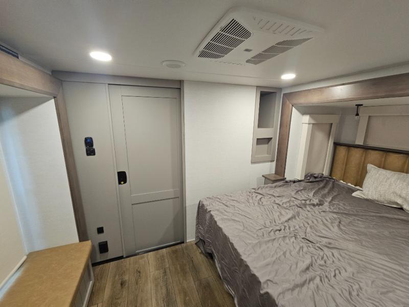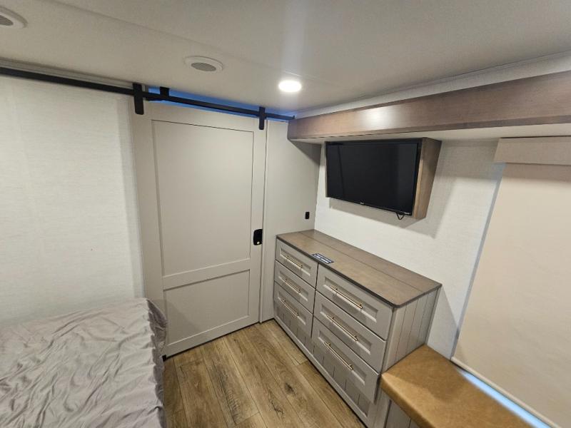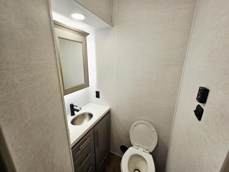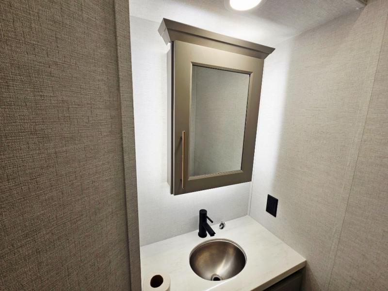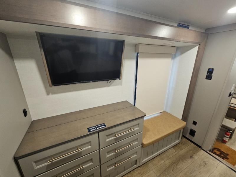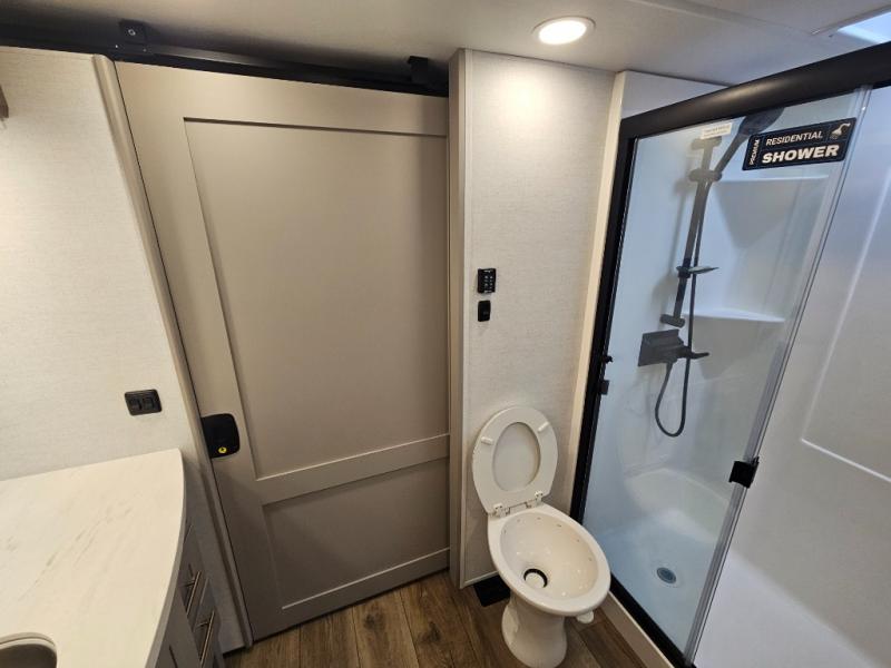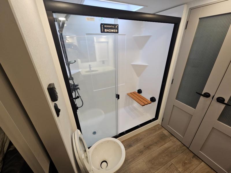 Whether you decide to be a full-timer or a long-trip traveler, this Paradigm offers so many comforts and conveniences you will love! The large full bathroom might be the reason you decide to be a new owner because you will have a large 61" x 30" shower to get cleaned up in, linen storage, and a walk-in closet with a hamper, shelves, and a space prepped for an optional washer/dryer. The bedroom allows you to sleep like a king and gives you extra floor space with the two slides, and there is storage in the flip-top dresser and under the seat, plus you can watch the Smart TV. The space saving sliding doors offer style as well. The cook will love all the residential appliances, including a residential refrigerator. The kitchen island gives you a large sink and dishwasher prep also. The half bath is super convenient just like the entry sitting bench/coat rack and closet. And you can relax on the sleeper sofa, dual recliner love seat, or swivel table and desk.