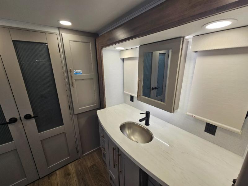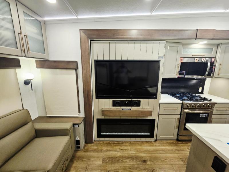 The Paradigm fifth wheels by Alliance RV are functional, high-quality, and luxurious for an unforgettable camping experience. There are three A/C units and a 40K BTU furnace to keep you comfortable year around, and you'll appreciate additional convenient amenities, like the all-in-one enclosed/heated utility center and the color coded and numbered wiring. A Helux Series coil spring pin box comes standard for hassle-free towing, along with Super-G 4,400 lb. rated tires and Dexter 7,000 lb. axles. You'll love the kitchen with its LG solid surface countertops and Lusso range, plus there is LED motion lighting in the pantry and a Maxx fan with a rain sensor to keep everything fresh when making dinner. Each model also includes an HD Smart TV in the living room and bedroom, plus a Winegard Air 360 antenna to keep you connected to the outside world. And of course there are a variety of options you can choose from to further customize your fifth wheel; dual pane windows, Super Solar Plus, slide out awning toppers, and generator prep or a generator to name a few!