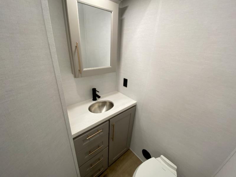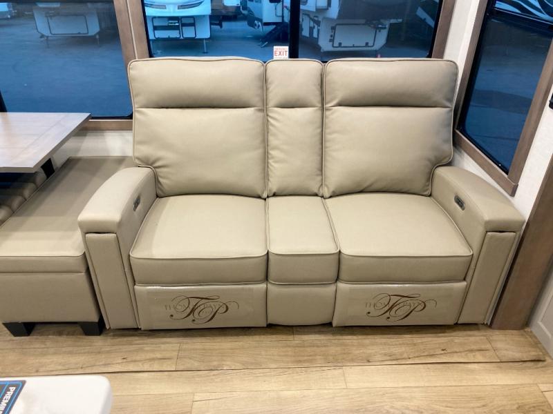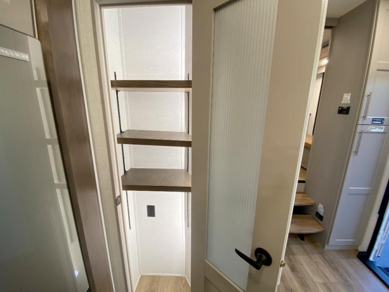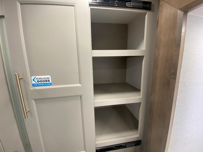 Whether you decide to be a full-timer or a long-trip traveler, this Paradigm offers so many comforts and conveniences you will love! The large full bathroom might be the reason you decide to be a new owner because you will have a large 61" x 30" shower to get cleaned up in, linen storage, and a walk-in closet with a hamper, shelves, and a space prepped for an optional washer/dryer. The bedroom allows you to sleep like a king and gives you extra floor space with the two slides, and there is storage in the flip-top dresser and under the seat, plus you can watch the Smart TV. The space saving sliding doors offer style as well. The cook will love all the residential appliances, including a residential refrigerator. The kitchen island gives you a large sink and dishwasher prep also. The half bath is super convenient just like the entry sitting bench/coat rack and closet. And you can relax on the sleeper sofa, dual recliner love seat, or swivel table and desk.