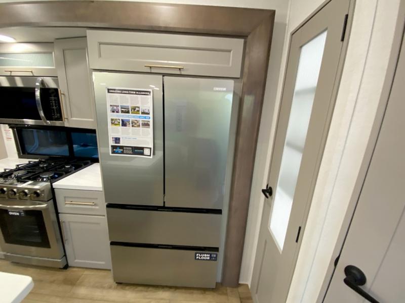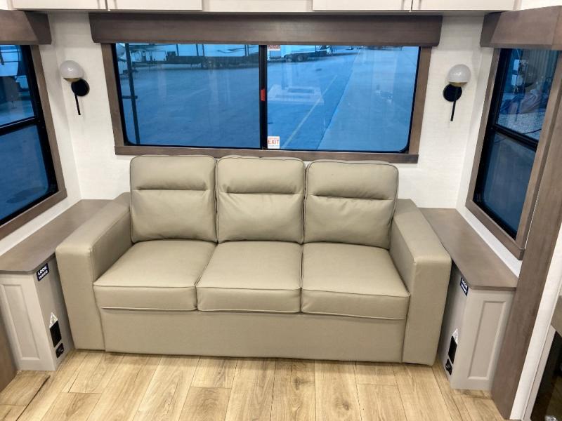 The Paradigm fifth wheels by Alliance RV are functional, high-quality, and luxurious for an unforgettable camping experience. There are three A/C units and a 40K BTU furnace to keep you comfortable year around, and you'll appreciate additional convenient amenities, like the all-in-one enclosed/heated utility center and the color coded and numbered wiring. A Helux Series coil spring pin box comes standard for hassle-free towing, along with Super-G 4,400 lb. rated tires and Dexter 7,000 lb. axles. You'll love the kitchen with its LG solid surface countertops and Lusso range, plus there is LED motion lighting in the pantry and a Maxx fan with a rain sensor to keep everything fresh when making dinner. Each model also includes an HD Smart TV in the living room and bedroom, plus a Winegard Air 360 antenna to keep you connected to the outside world. And of course there are a variety of options you can choose from to further customize your fifth wheel; dual pane windows, Super Solar Plus, slide out awning toppers, and generator prep or a generator to name a few!