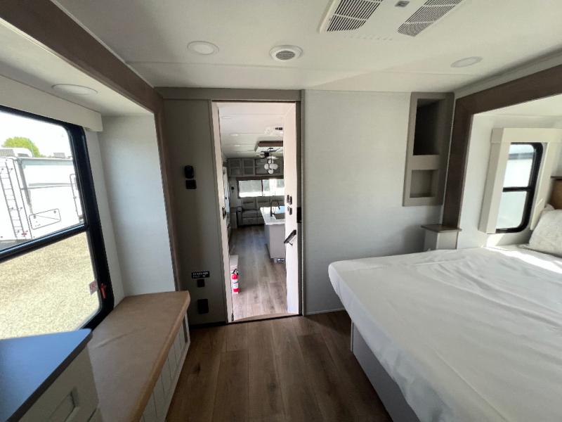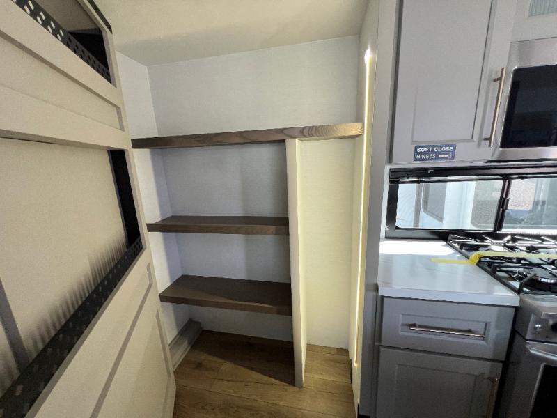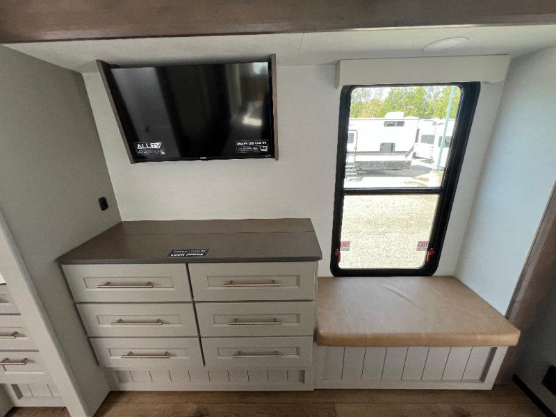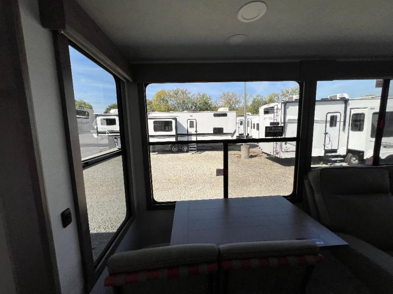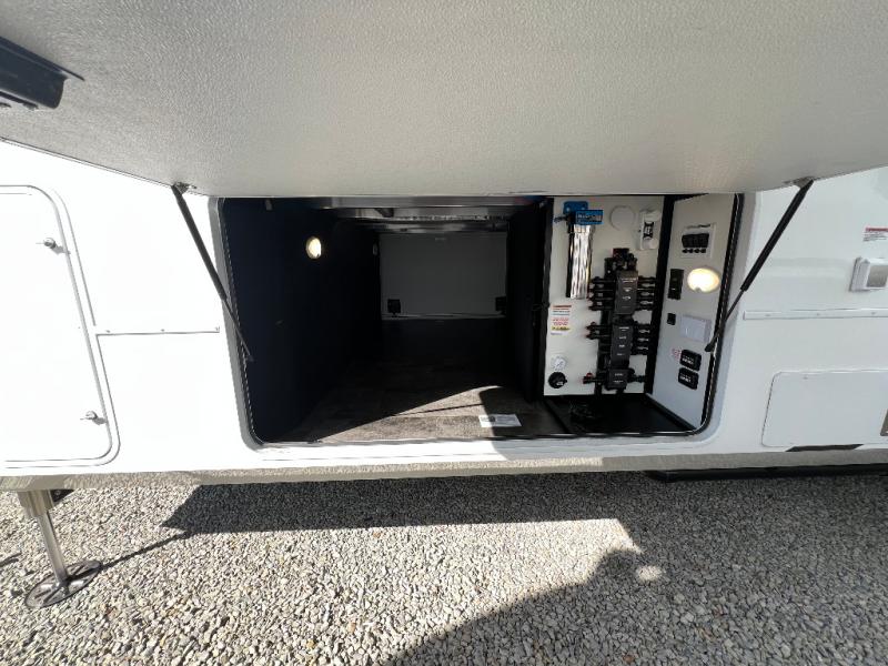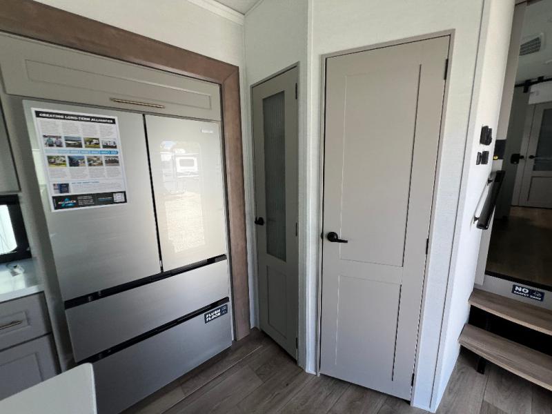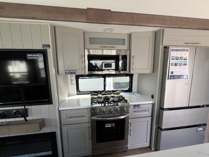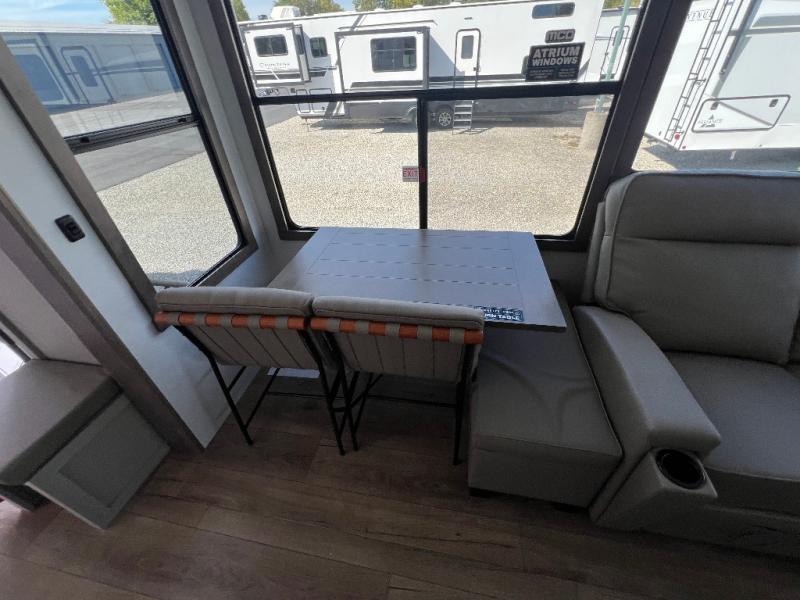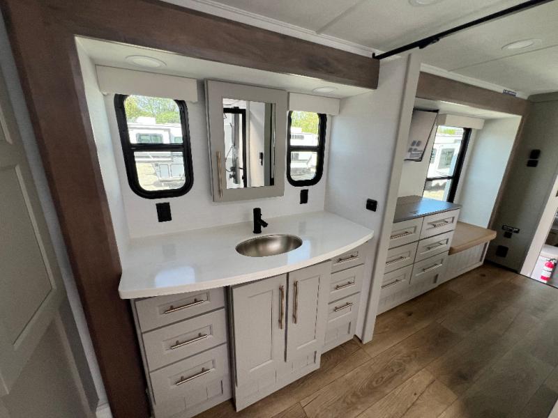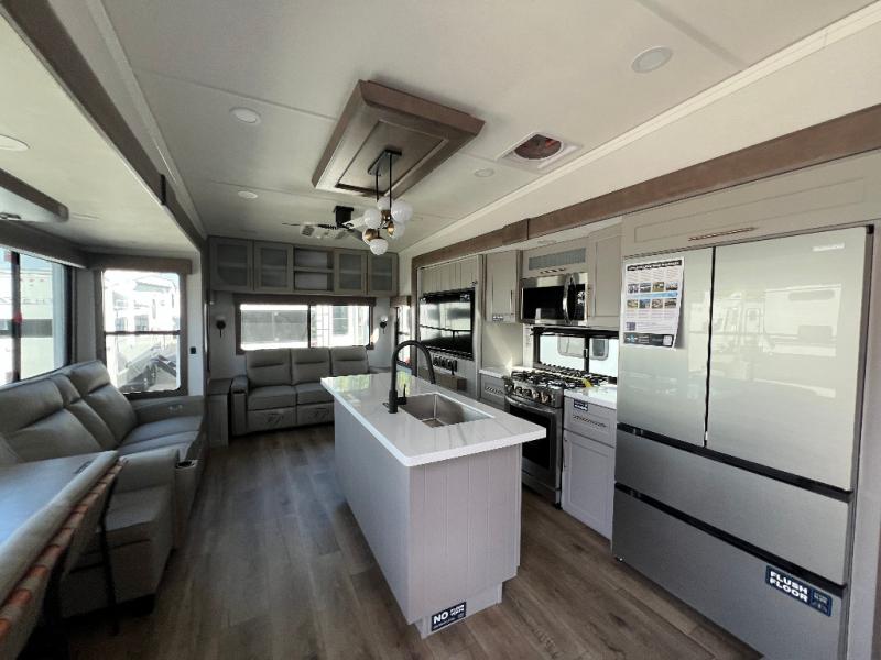 The Paradigm fifth wheels by Alliance RV are functional, high-quality, and luxurious for an unforgettable camping experience. There are three A/C units and a 40K BTU furnace to keep you comfortable year around, and you'll appreciate additional convenient amenities, like the all-in-one enclosed/heated utility center and the color coded and numbered wiring. A Helux Series coil spring pin box comes standard for hassle-free towing, along with Super-G 4,400 lb. rated tires and Dexter 7,000 lb. axles. You'll love the kitchen with its LG solid surface countertops and Lusso range, plus there is LED motion lighting in the pantry and a Maxx fan with a rain sensor to keep everything fresh when making dinner. Each model also includes an HD Smart TV in the living room and bedroom, plus a Winegard Air 360 antenna to keep you connected to the outside world. And of course there are a variety of options you can choose from to further customize your fifth wheel; dual pane windows, Super Solar Plus, slide out awning toppers, and generator prep or a generator to name a few!