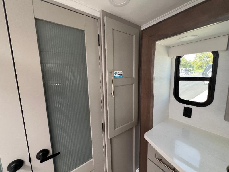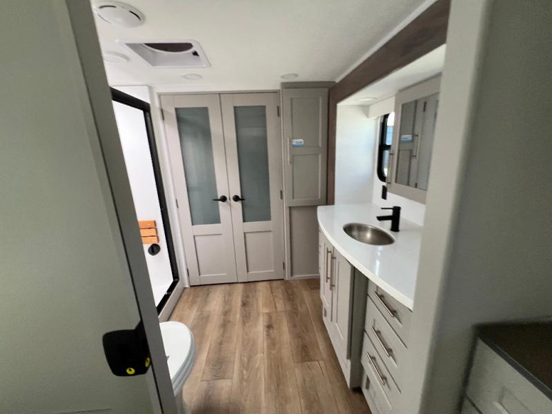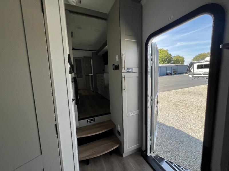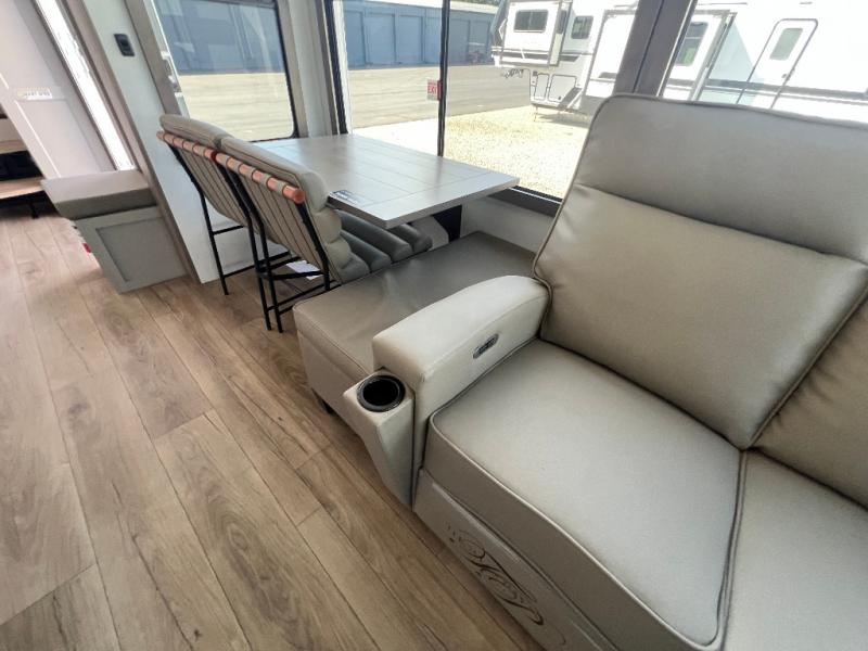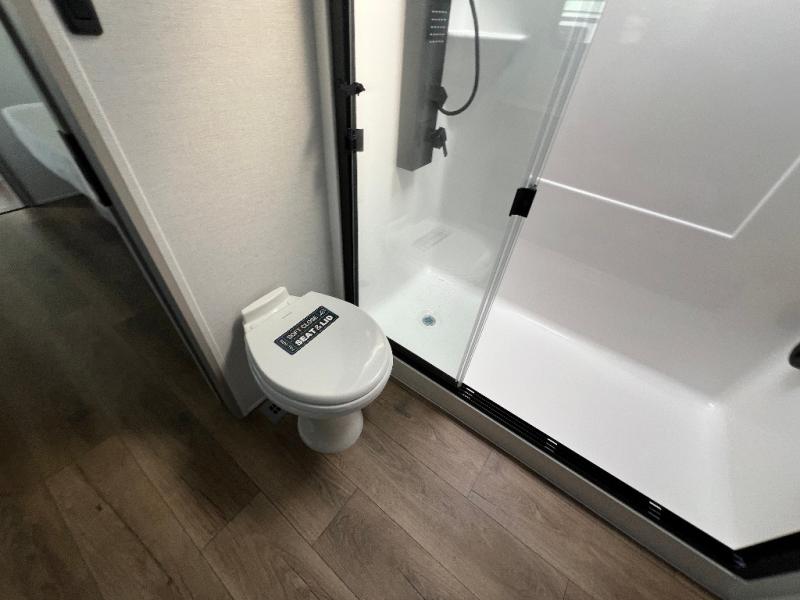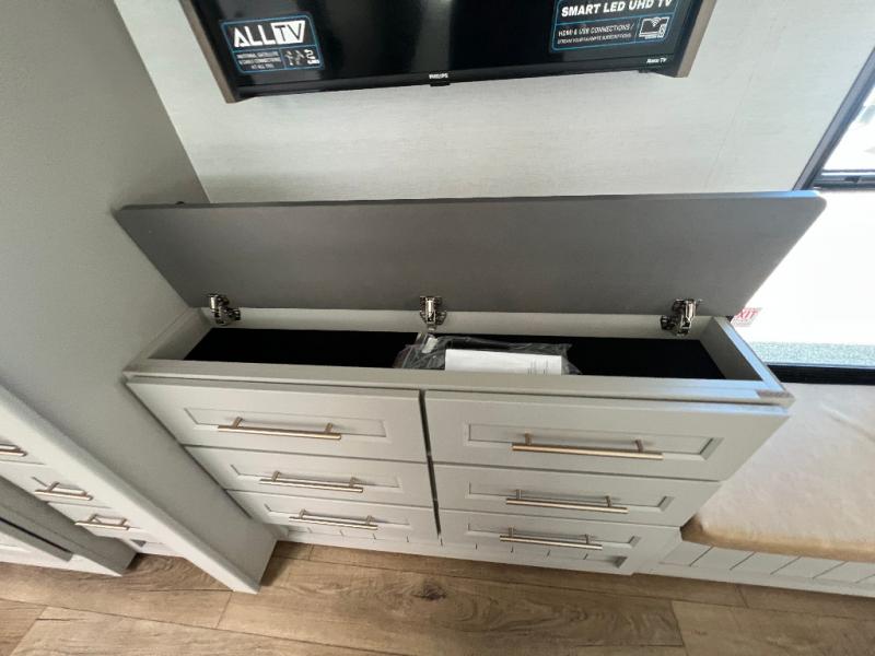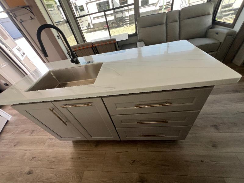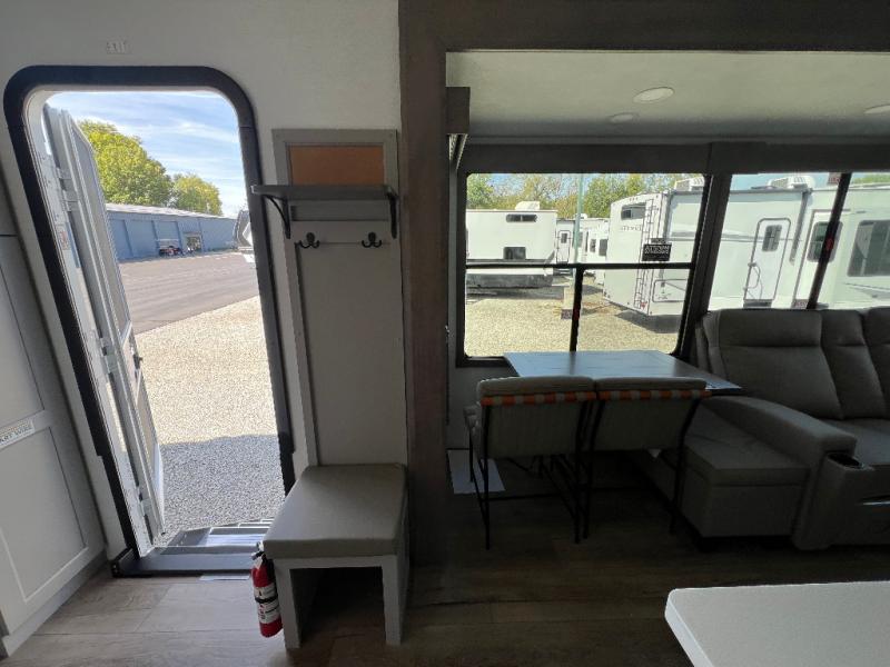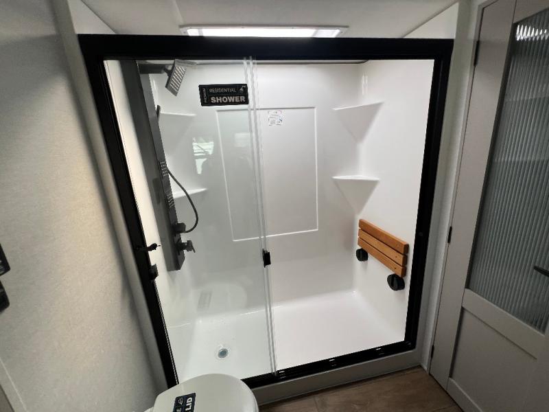 Whether you decide to be a full-timer or a long-trip traveler, this Paradigm offers so many comforts and conveniences you will love! The large full bathroom might be the reason you decide to be a new owner because you will have a large 61" x 30" shower to get cleaned up in, linen storage, and a walk-in closet with a hamper, shelves, and a space prepped for an optional washer/dryer. The bedroom allows you to sleep like a king and gives you extra floor space with the two slides, and there is storage in the flip-top dresser and under the seat, plus you can watch the Smart TV. The space saving sliding doors offer style as well. The cook will love all the residential appliances, including a residential refrigerator. The kitchen island gives you a large sink and dishwasher prep also. The half bath is super convenient just like the entry sitting bench/coat rack and closet. And you can relax on the sleeper sofa, dual recliner love seat, or swivel table and desk.