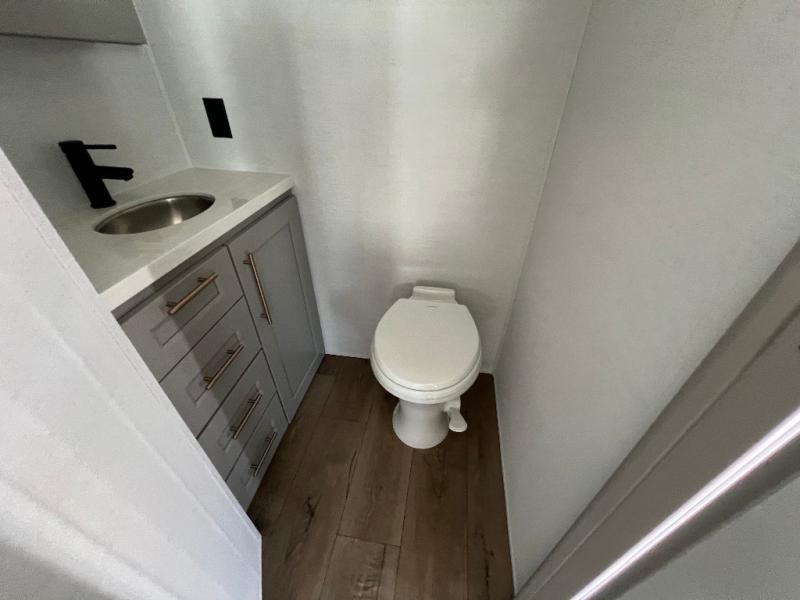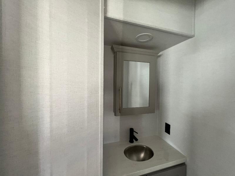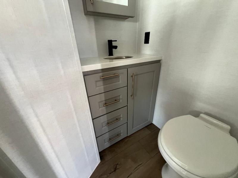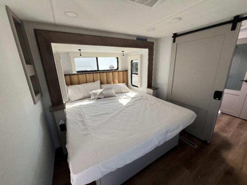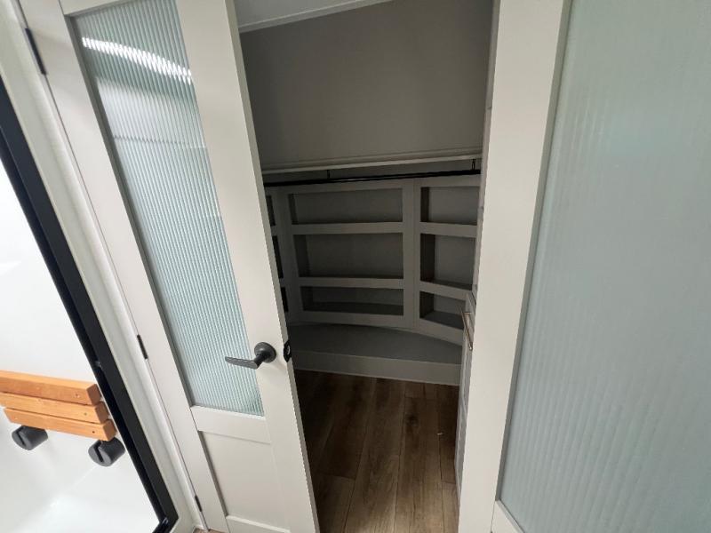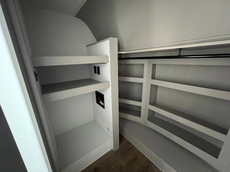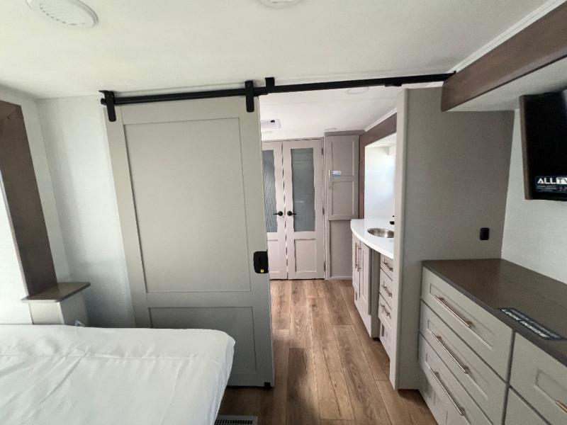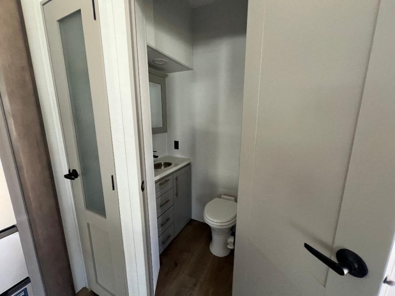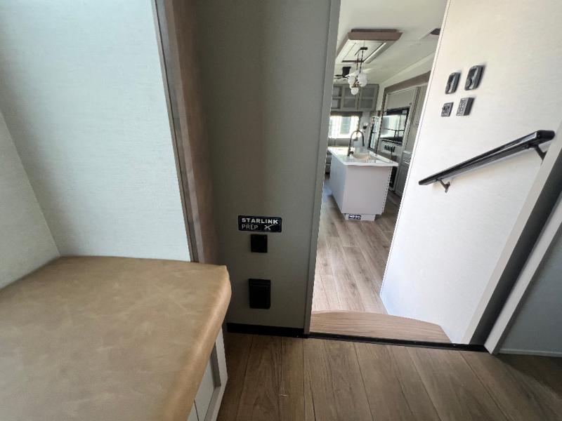 Whether you decide to be a full-timer or a long-trip traveler, this Paradigm offers so many comforts and conveniences you will love! The large full bathroom might be the reason you decide to be a new owner because you will have a large 61" x 30" shower to get cleaned up in, linen storage, and a walk-in closet with a hamper, shelves, and a space prepped for an optional washer/dryer. The bedroom allows you to sleep like a king and gives you extra floor space with the two slides, and there is storage in the flip-top dresser and under the seat, plus you can watch the Smart TV. The space saving sliding doors offer style as well. The cook will love all the residential appliances, including a residential refrigerator. The kitchen island gives you a large sink and dishwasher prep also. The half bath is super convenient just like the entry sitting bench/coat rack and closet. And you can relax on the sleeper sofa, dual recliner love seat, or swivel table and desk.