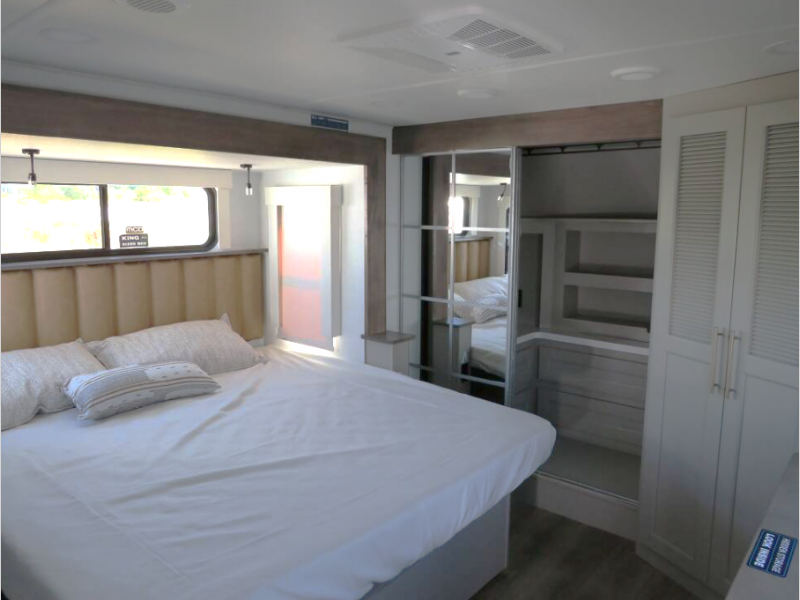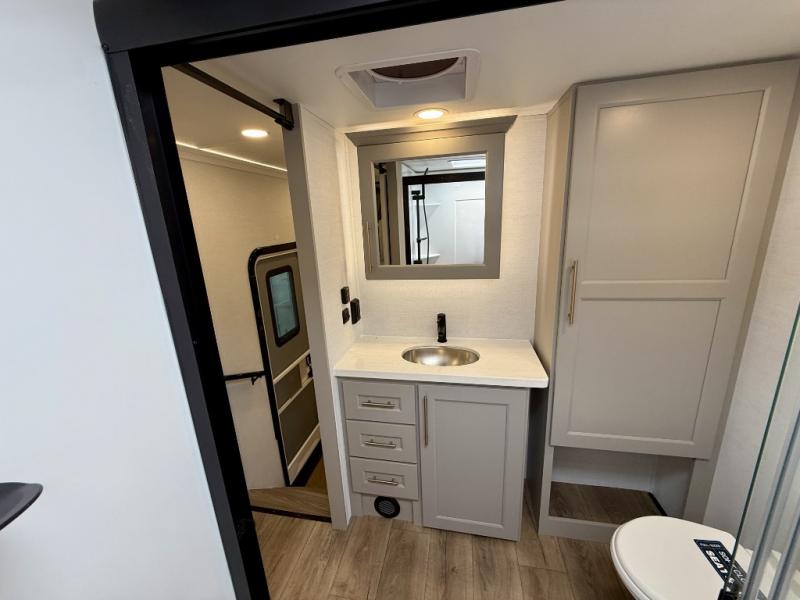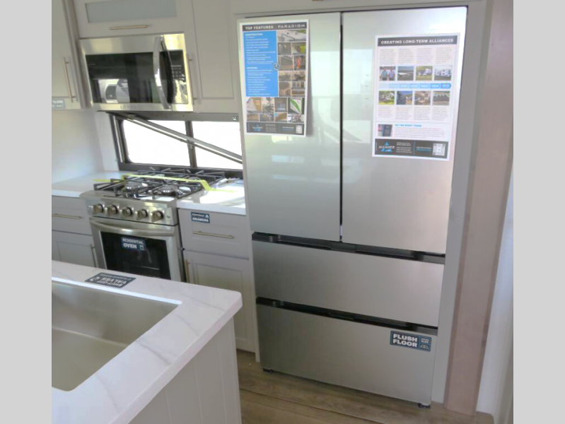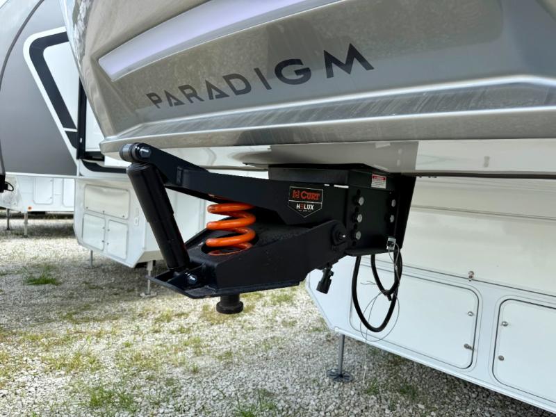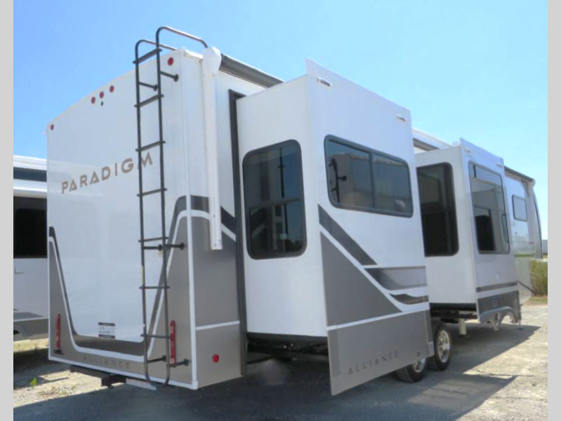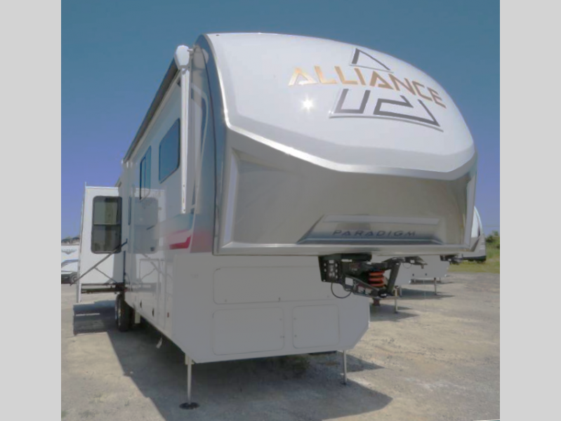 The Paradigm fifth wheels by Alliance RV are functional, high-quality, and luxurious for an unforgettable camping experience. There are three A/C units and a 40K BTU furnace to keep you comfortable year around, and you'll appreciate additional convenient amenities, like the all-in-one enclosed/heated utility center and the color coded and numbered wiring. A Helux Series coil spring pin box comes standard for hassle-free towing, along with Super-G 4,400 lb. rated tires and Dexter 7,000 lb. axles. You'll love the kitchen with its LG solid surface countertops and Lusso range, plus there is LED motion lighting in the pantry and a Maxx fan with a rain sensor to keep everything fresh when making dinner. Each model also includes an HD Smart TV in the living room and bedroom, plus a Winegard Air 360 antenna to keep you connected to the outside world. And of course there are a variety of options you can choose from to further customize your fifth wheel; dual pane windows, Super Solar Plus, slide out awning toppers, and generator prep or a generator to name a few!