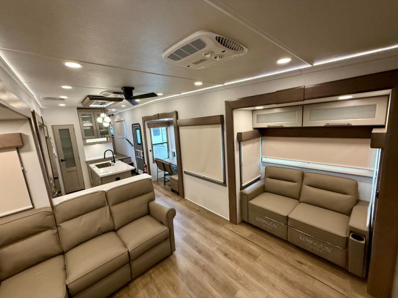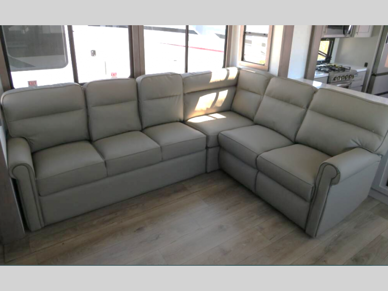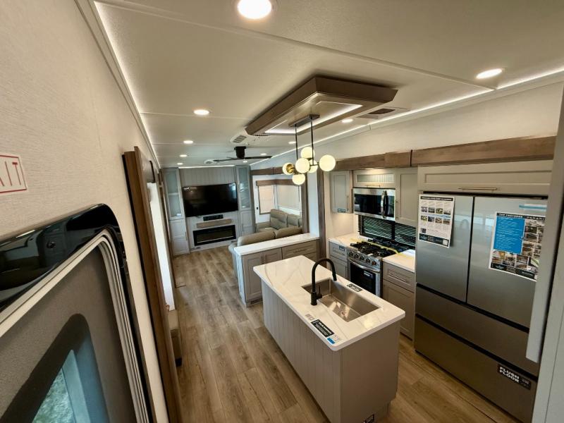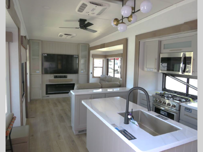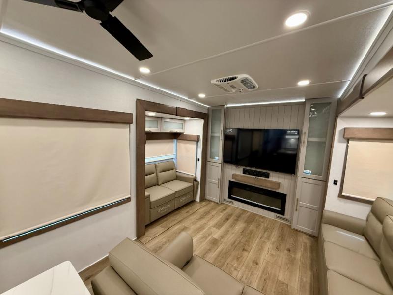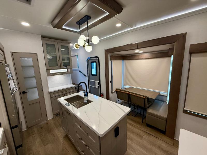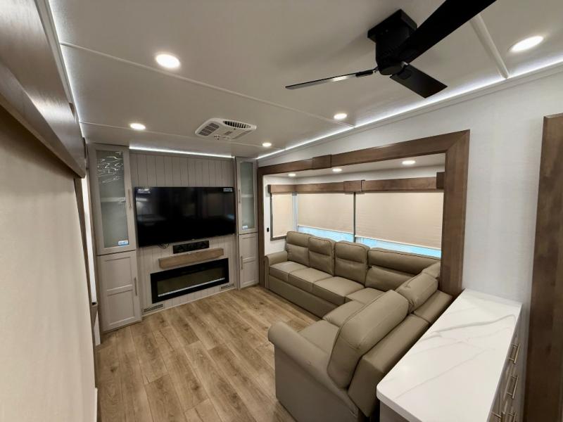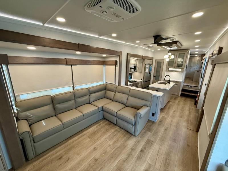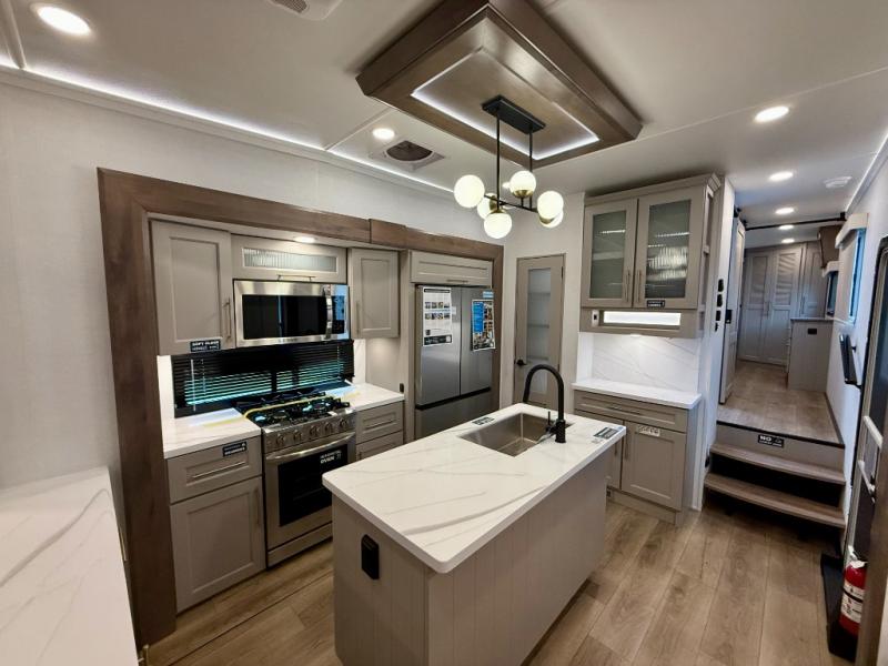 You'll love everything about this luxurious fifth wheel! There are five slide outs so you can enjoy more space than ever, and the rear living area can double as a den for guest. They can sleep on the sleeper sofa or second sofa with overhead storage, and there is a dual recliner across from the 65" Smart TV. The middle kitchen includes a kitchen island with dishwasher prep, generous counter space, a pantry and hutch for storage, and a swivel table and desk to dine or work at! This model also includes a spacious full bath with a large 61" x 30" shower for all-around comfort plus a front private bedroom with a king bed slide out. There is also a walk-in closet with washer and dryer prep, a flip top dresser with a Smart TV, and a seat with storage to keep everything tidy!