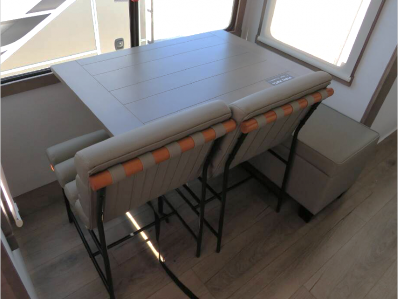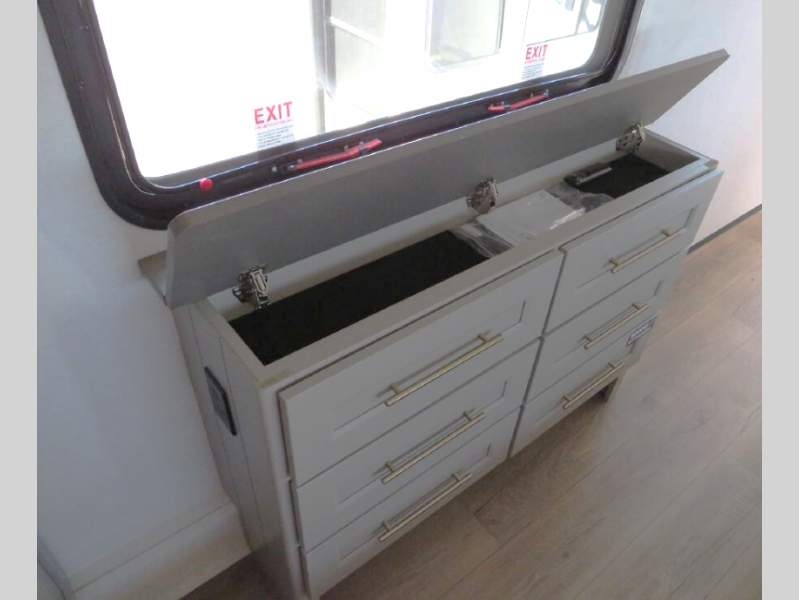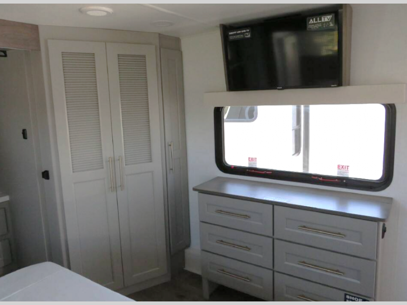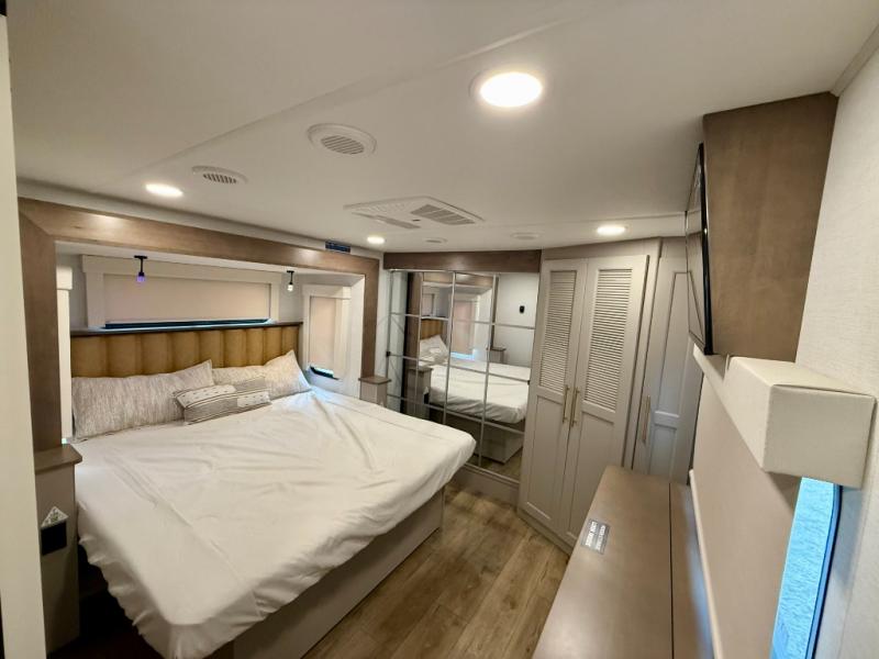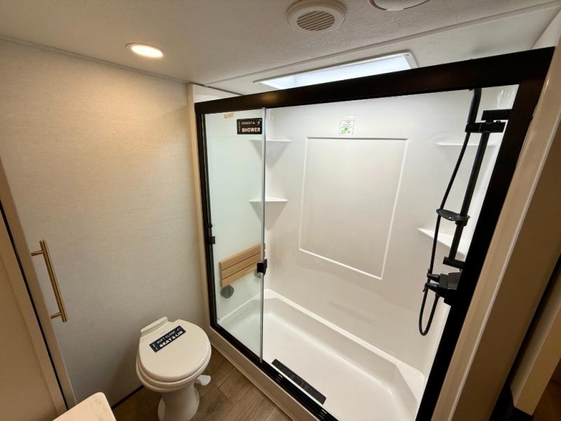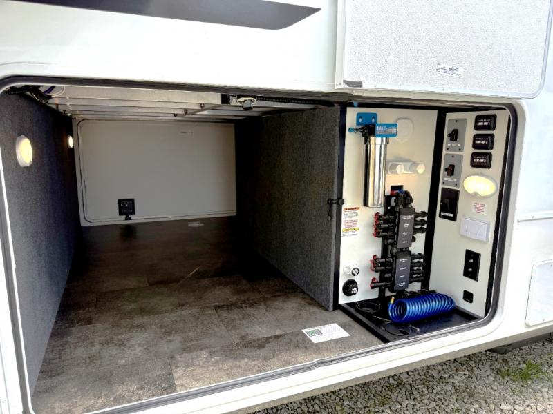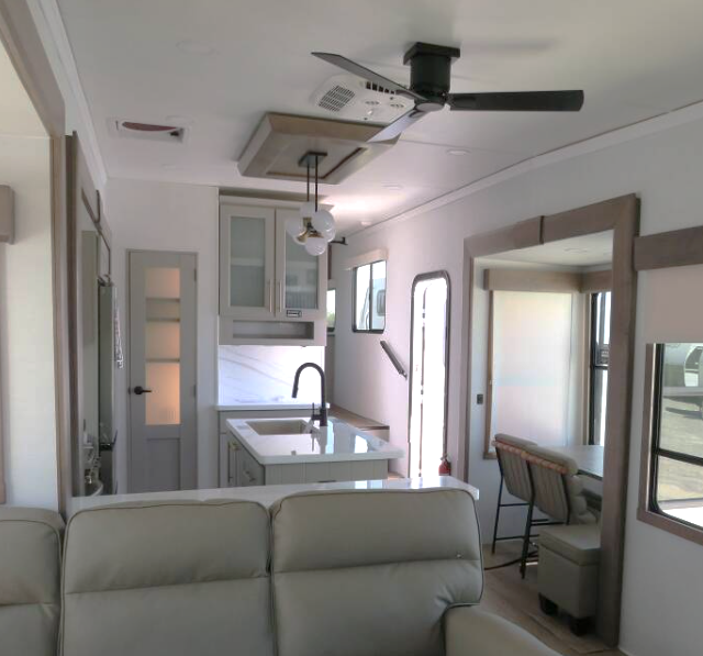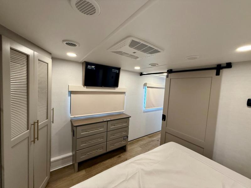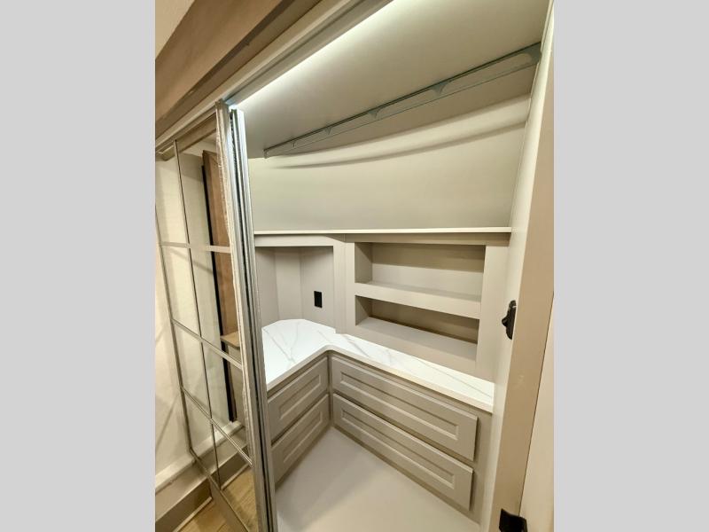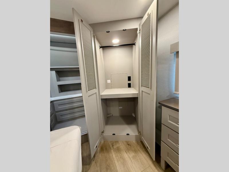 You'll love everything about this luxurious fifth wheel! There are five slide outs so you can enjoy more space than ever, and the rear living area can double as a den for guest. They can sleep on the sleeper sofa or second sofa with overhead storage, and there is a dual recliner across from the 65" Smart TV. The middle kitchen includes a kitchen island with dishwasher prep, generous counter space, a pantry and hutch for storage, and a swivel table and desk to dine or work at! This model also includes a spacious full bath with a large 61" x 30" shower for all-around comfort plus a front private bedroom with a king bed slide out. There is also a walk-in closet with washer and dryer prep, a flip top dresser with a Smart TV, and a seat with storage to keep everything tidy!