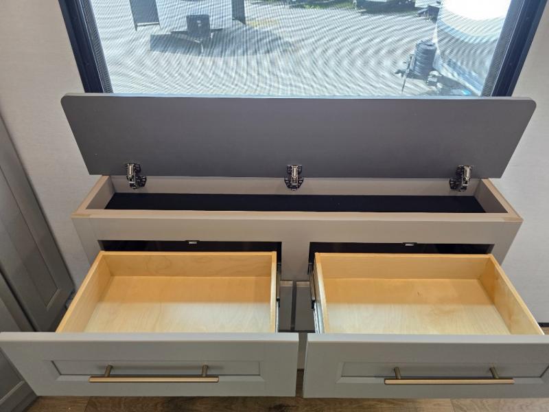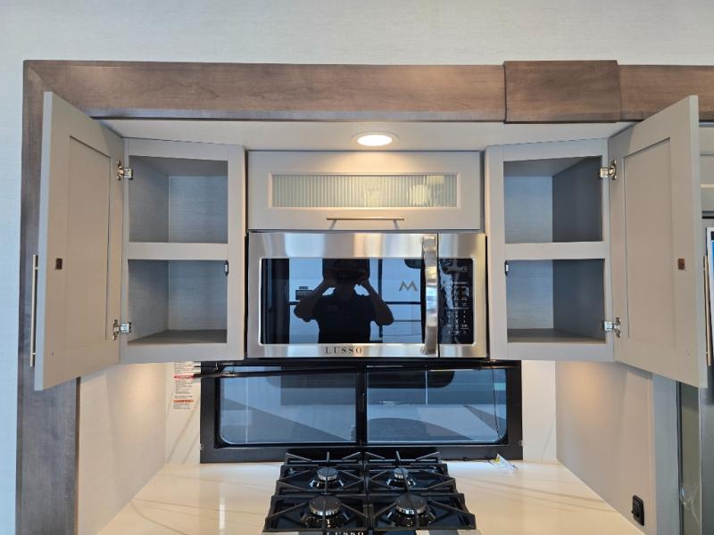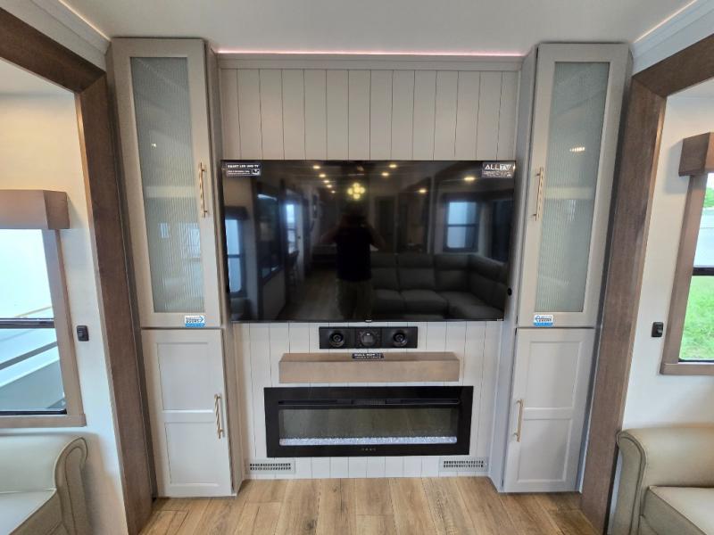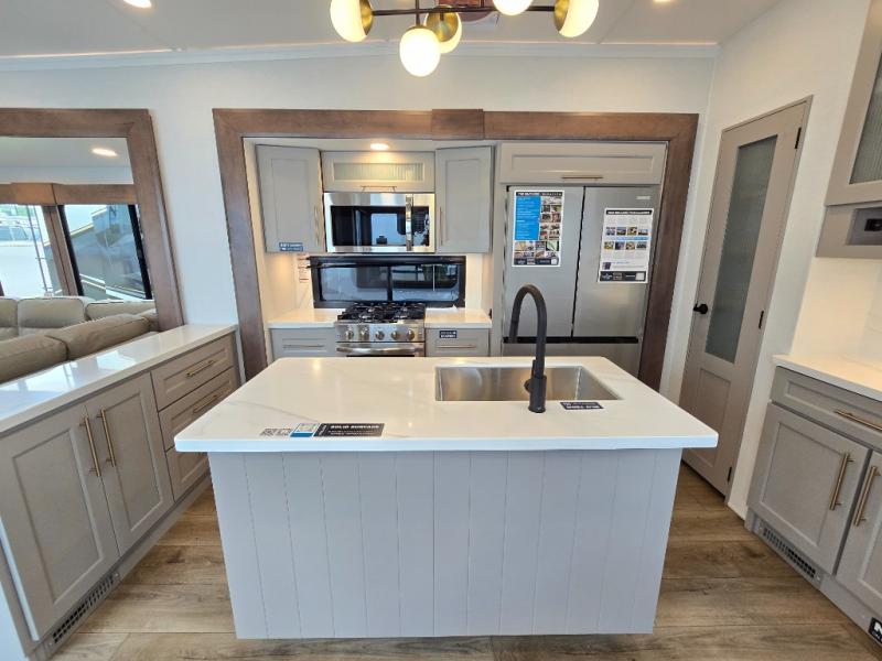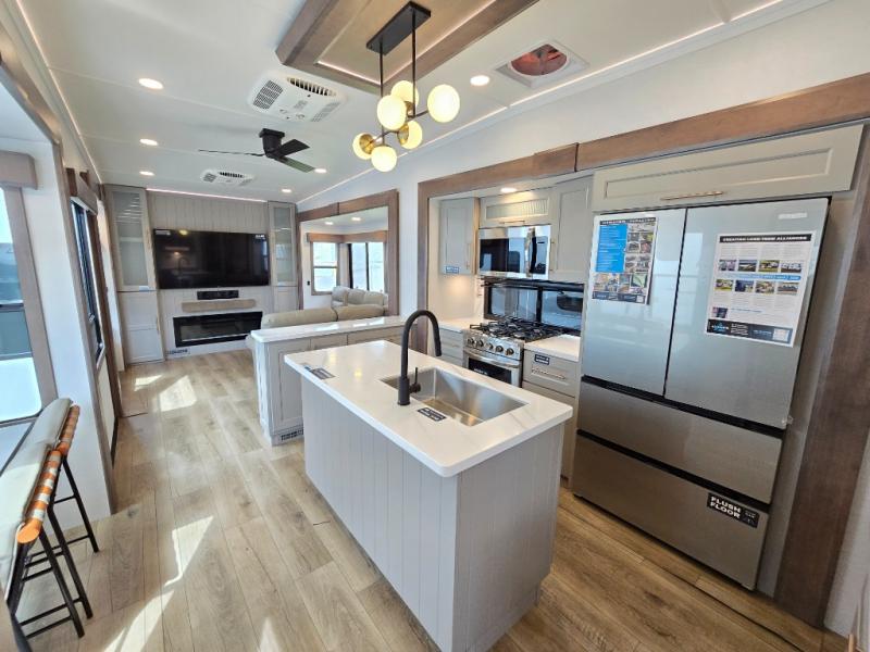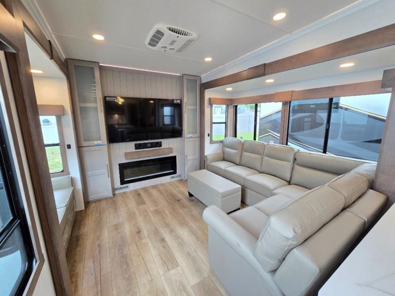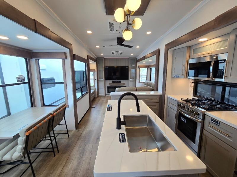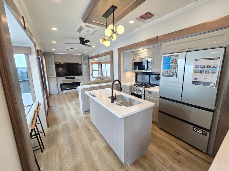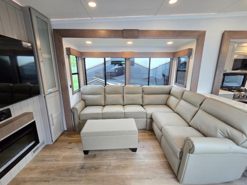 You'll love everything about this luxurious fifth wheel! There are five slide outs so you can enjoy more space than ever, and the rear living area can double as a den for guest. They can sleep on the sleeper sofa or second sofa with overhead storage, and there is a dual recliner across from the 65" Smart TV. The middle kitchen includes a kitchen island with dishwasher prep, generous counter space, a pantry and hutch for storage, and a swivel table and desk to dine or work at! This model also includes a spacious full bath with a large 61" x 30" shower for all-around comfort plus a front private bedroom with a king bed slide out. There is also a walk-in closet with washer and dryer prep, a flip top dresser with a Smart TV, and a seat with storage to keep everything tidy!