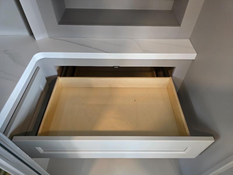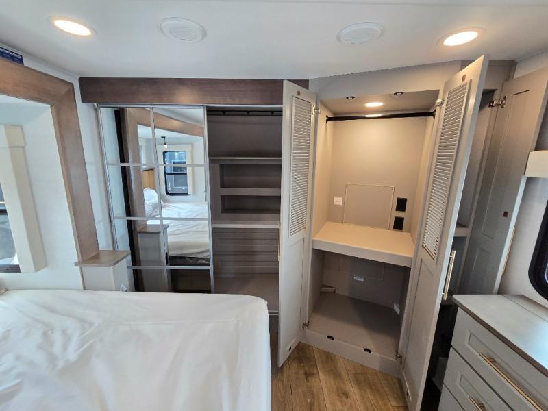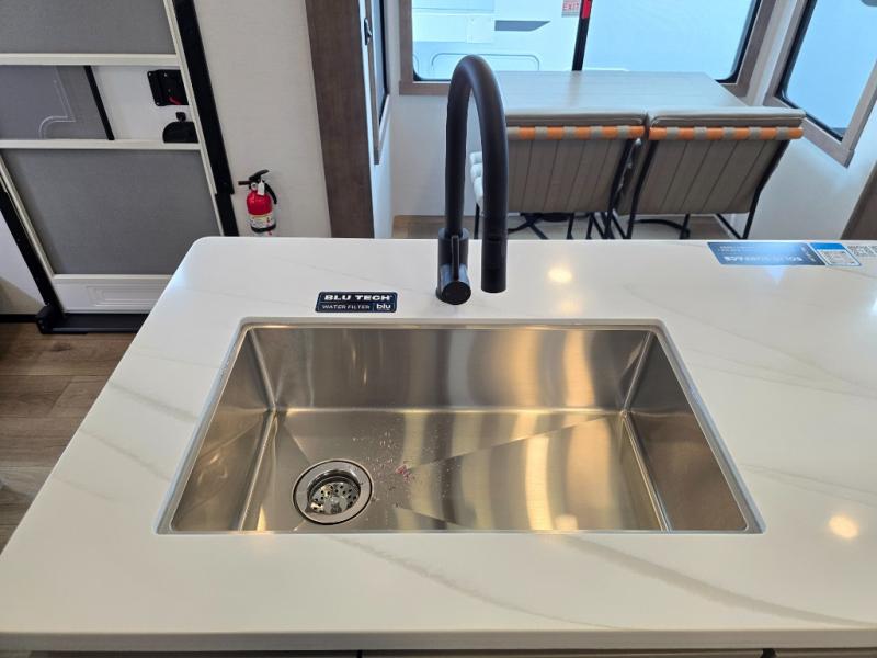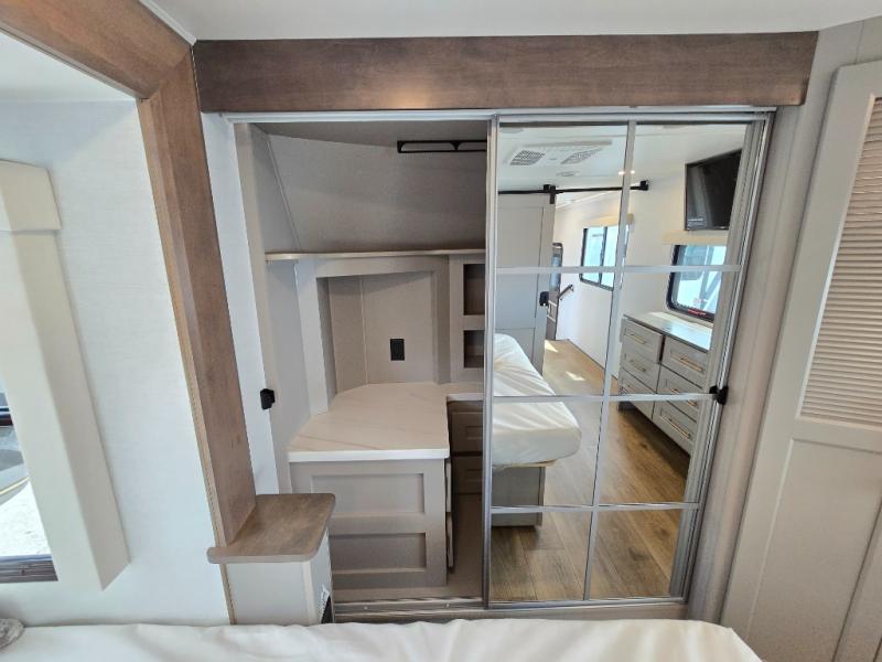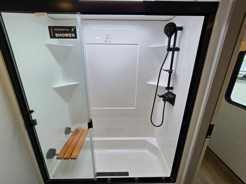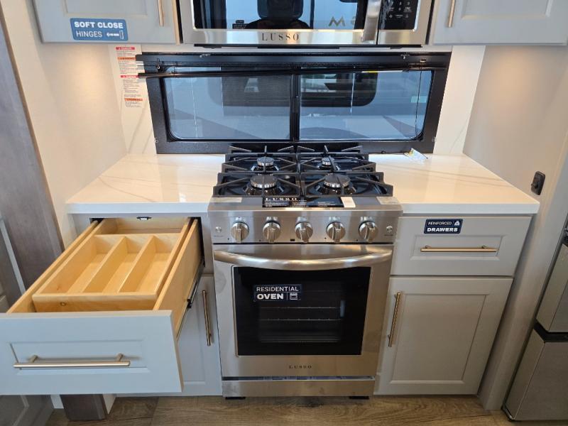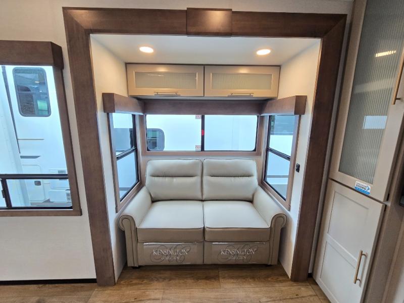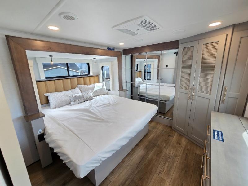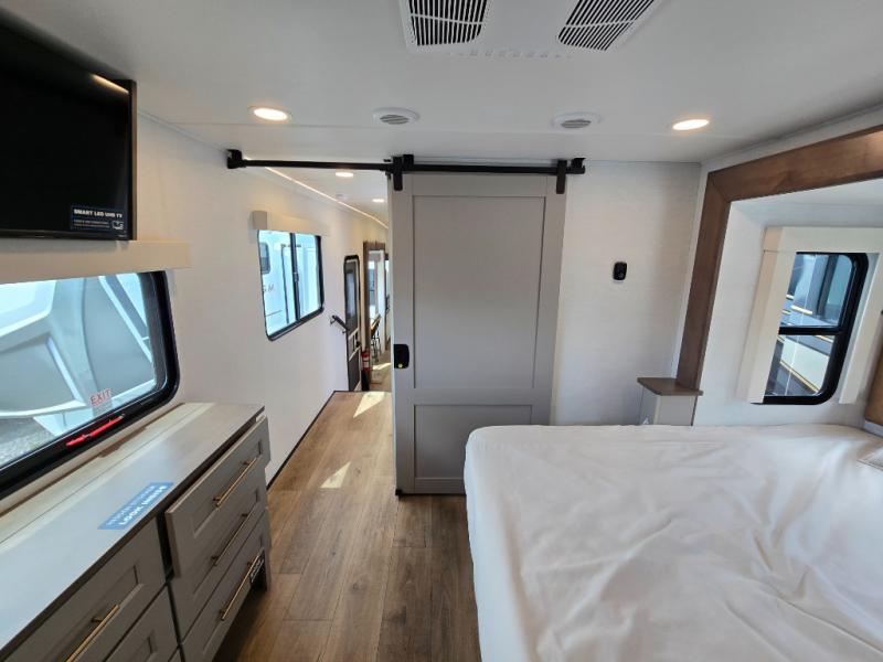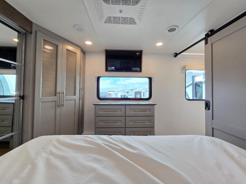 You'll love everything about this luxurious fifth wheel! There are five slide outs so you can enjoy more space than ever, and the rear living area can double as a den for guest. They can sleep on the sleeper sofa or second sofa with overhead storage, and there is a dual recliner across from the 65" Smart TV. The middle kitchen includes a kitchen island with dishwasher prep, generous counter space, a pantry and hutch for storage, and a swivel table and desk to dine or work at! This model also includes a spacious full bath with a large 61" x 30" shower for all-around comfort plus a front private bedroom with a king bed slide out. There is also a walk-in closet with washer and dryer prep, a flip top dresser with a Smart TV, and a seat with storage to keep everything tidy!