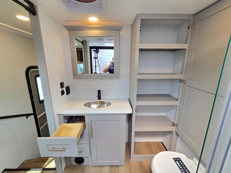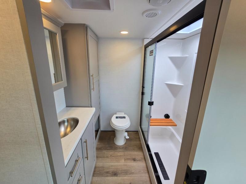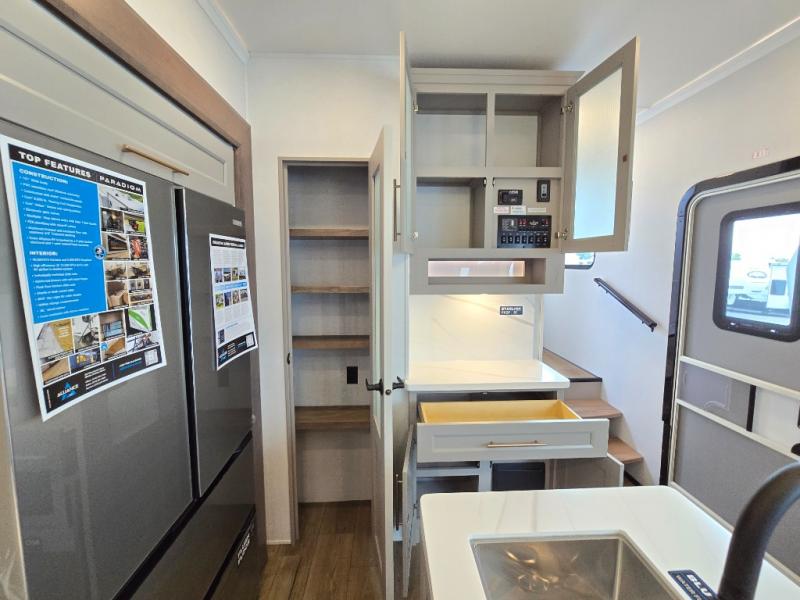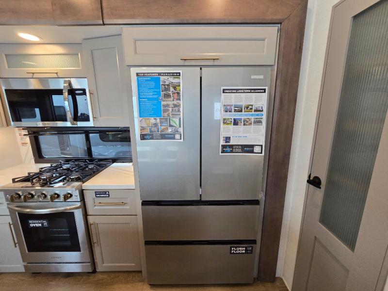 The Paradigm fifth wheels by Alliance RV are functional, high-quality, and luxurious for an unforgettable camping experience. There are three A/C units and a 40K BTU furnace to keep you comfortable year around, and you'll appreciate additional convenient amenities, like the all-in-one enclosed/heated utility center and the color coded and numbered wiring. A Helux Series coil spring pin box comes standard for hassle-free towing, along with Super-G 4,400 lb. rated tires and Dexter 7,000 lb. axles. You'll love the kitchen with its LG solid surface countertops and Lusso range, plus there is LED motion lighting in the pantry and a Maxx fan with a rain sensor to keep everything fresh when making dinner. Each model also includes an HD Smart TV in the living room and bedroom, plus a Winegard Air 360 antenna to keep you connected to the outside world. And of course there are a variety of options you can choose from to further customize your fifth wheel; dual pane windows, Super Solar Plus, slide out awning toppers, and generator prep or a generator to name a few!