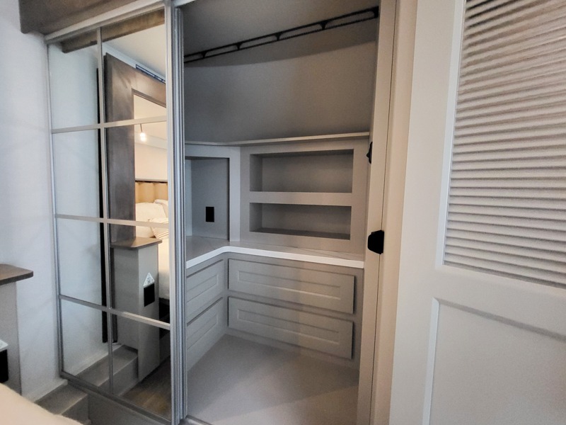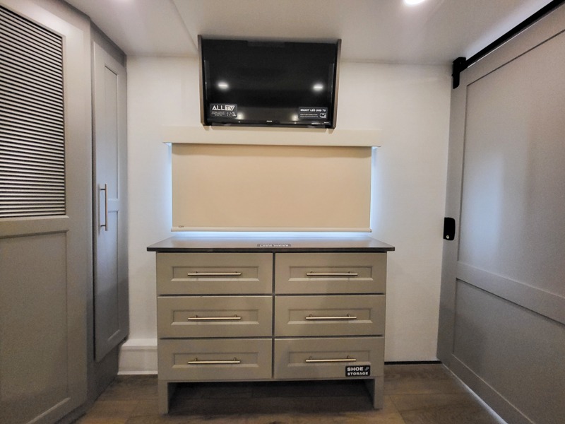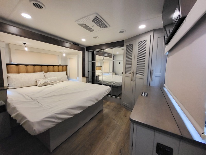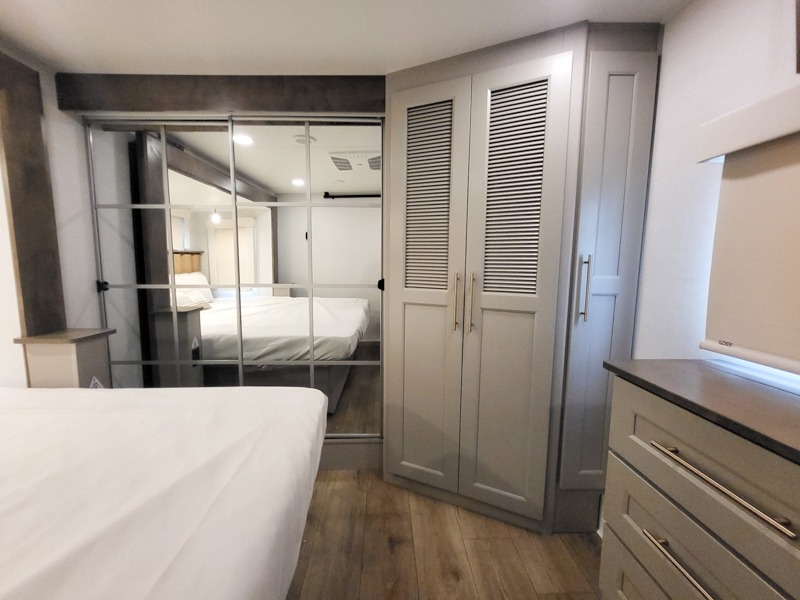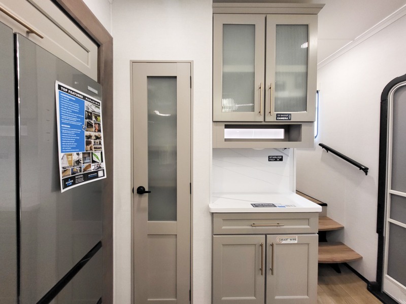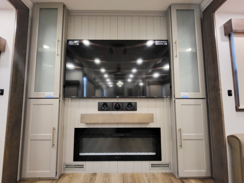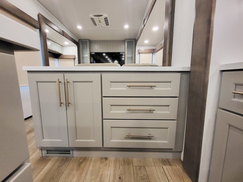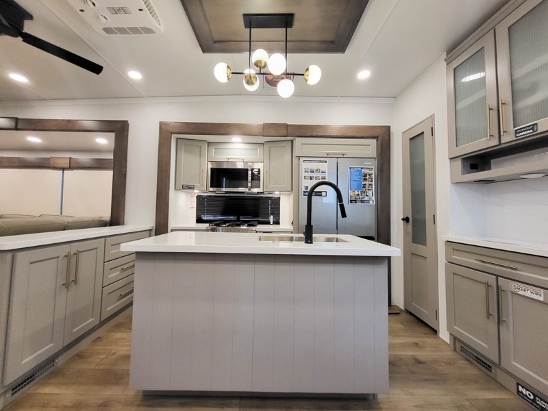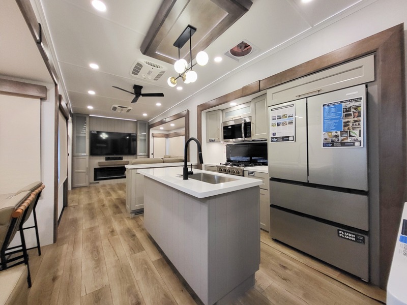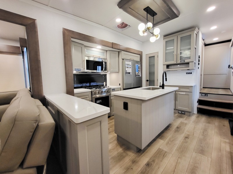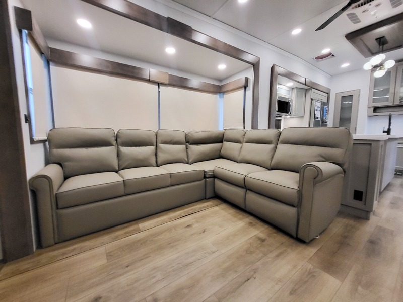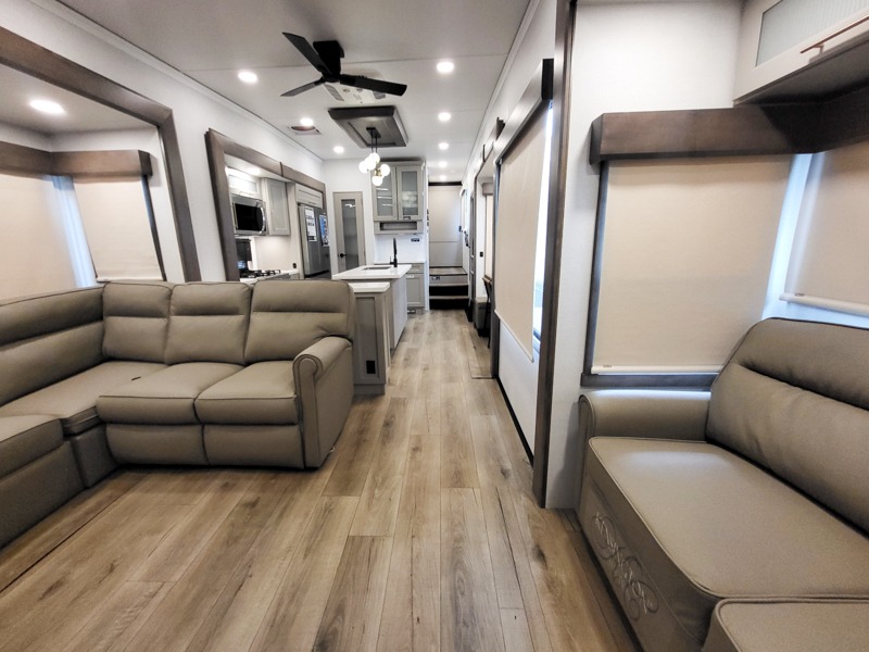 You'll love everything about this luxurious fifth wheel! There are five slide outs so you can enjoy more space than ever, and the rear living area can double as a den for guest. They can sleep on the sleeper sofa or second sofa with overhead storage, and there is a dual recliner across from the 65" Smart TV. The middle kitchen includes a kitchen island with dishwasher prep, generous counter space, a pantry and hutch for storage, and a swivel table and desk to dine or work at! This model also includes a spacious full bath with a large 61" x 30" shower for all-around comfort plus a front private bedroom with a king bed slide out. There is also a walk-in closet with washer and dryer prep, a flip top dresser with a Smart TV, and a seat with storage to keep everything tidy!