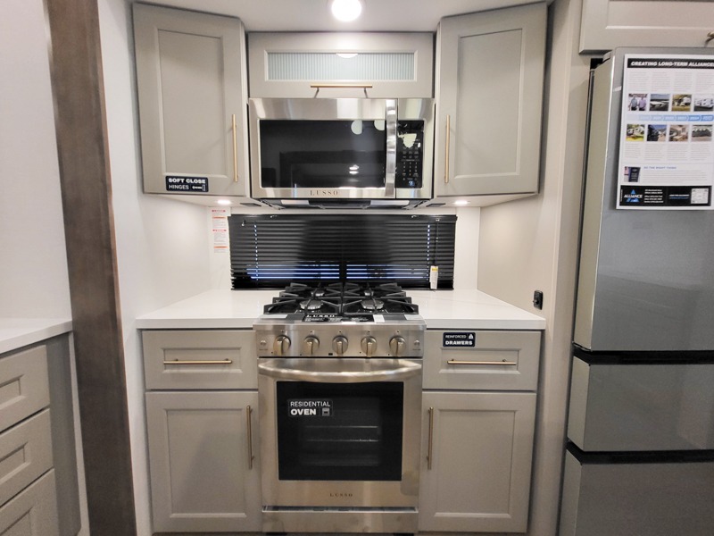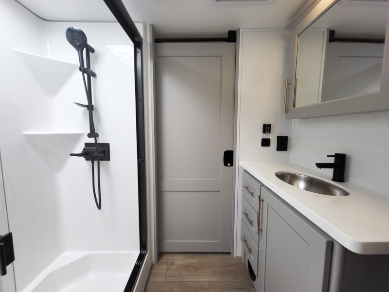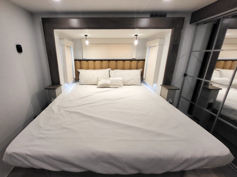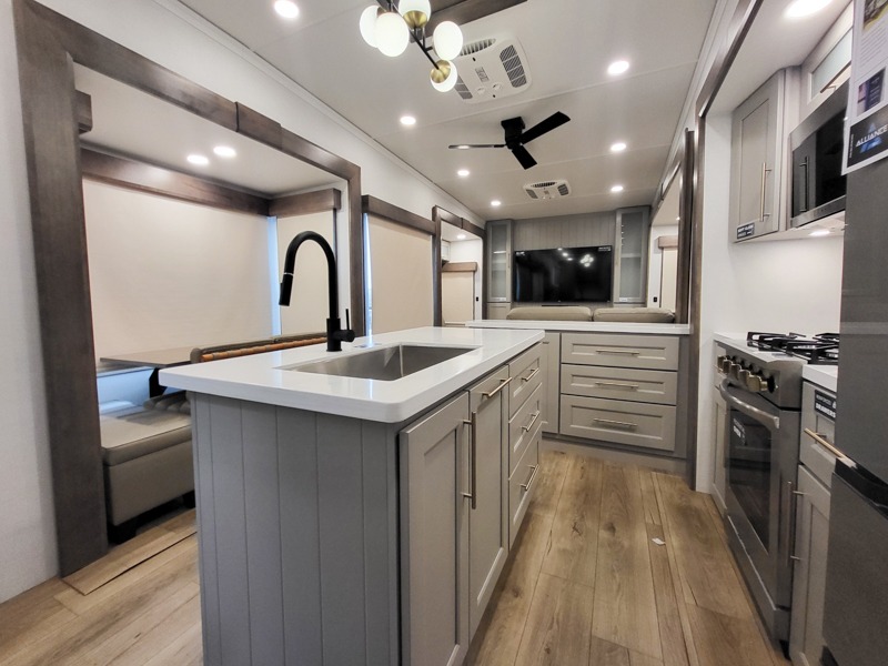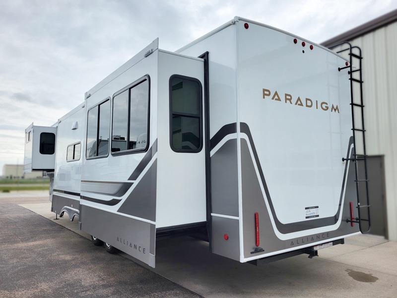 The Paradigm fifth wheels by Alliance RV are functional, high-quality, and luxurious for an unforgettable camping experience. There are three A/C units and a 40K BTU furnace to keep you comfortable year around, and you'll appreciate additional convenient amenities, like the all-in-one enclosed/heated utility center and the color coded and numbered wiring. A Helux Series coil spring pin box comes standard for hassle-free towing, along with Super-G 4,400 lb. rated tires and Dexter 7,000 lb. axles. You'll love the kitchen with its LG solid surface countertops and Lusso range, plus there is LED motion lighting in the pantry and a Maxx fan with a rain sensor to keep everything fresh when making dinner. Each model also includes an HD Smart TV in the living room and bedroom, plus a Winegard Air 360 antenna to keep you connected to the outside world. And of course there are a variety of options you can choose from to further customize your fifth wheel; dual pane windows, Super Solar Plus, slide out awning toppers, and generator prep or a generator to name a few!