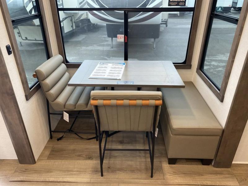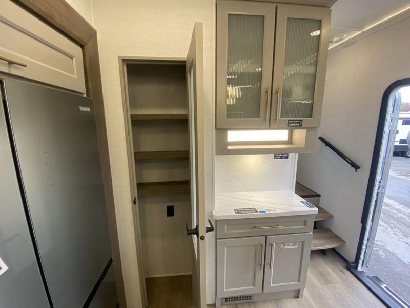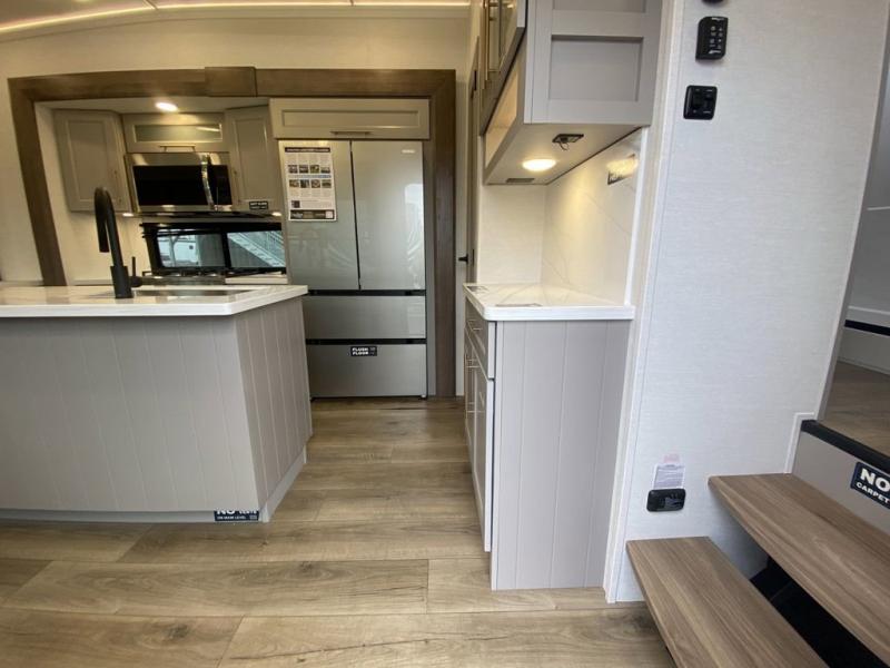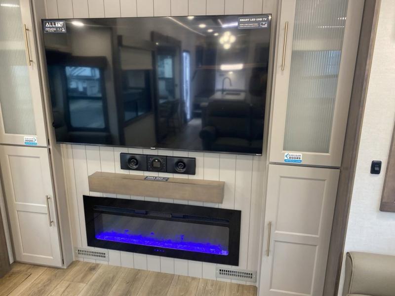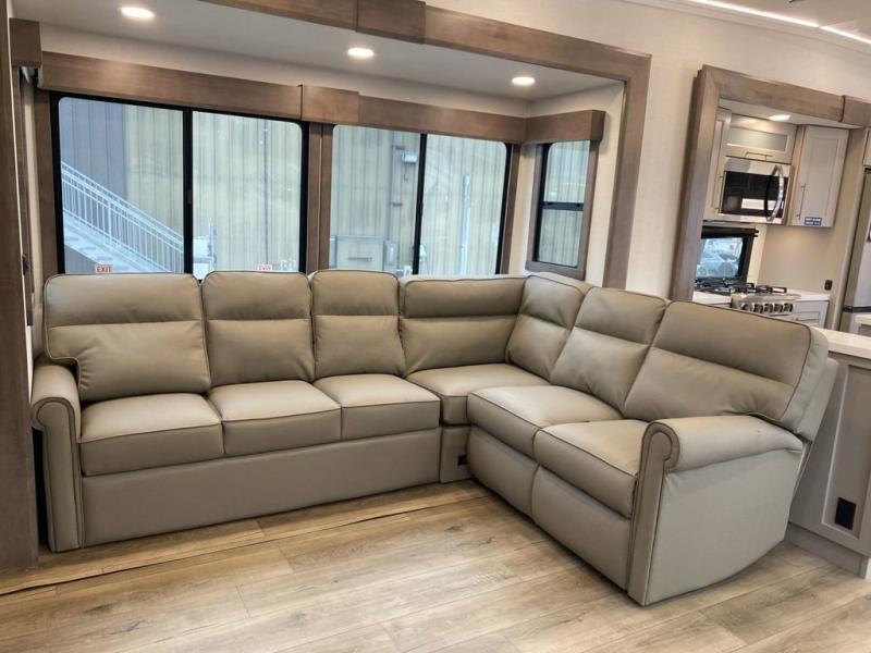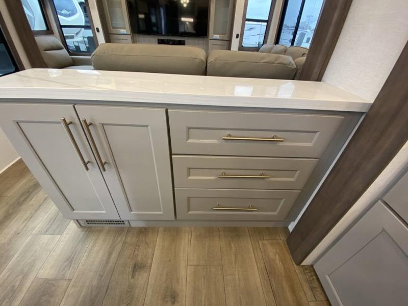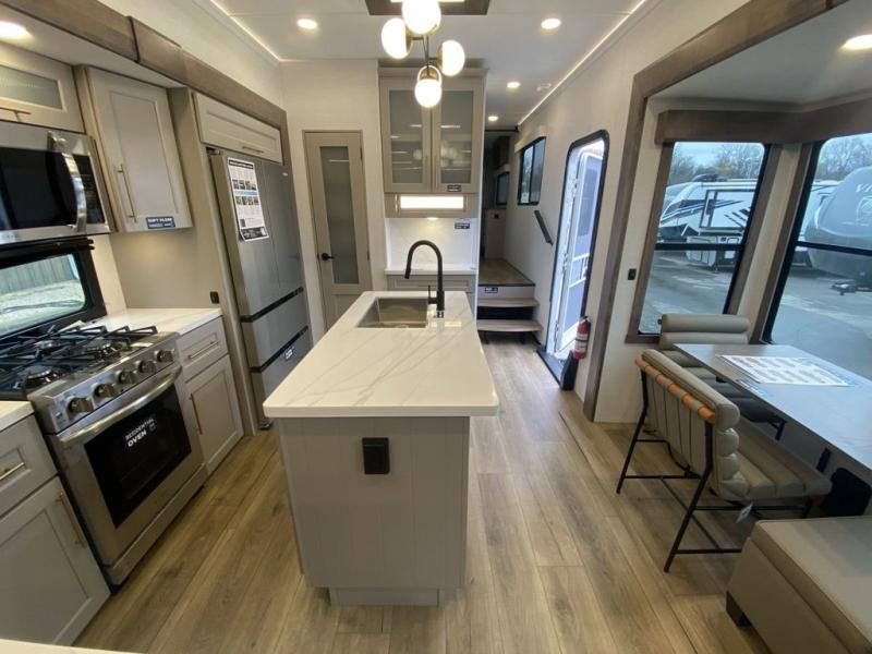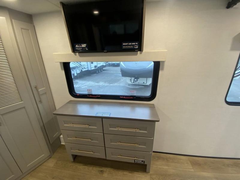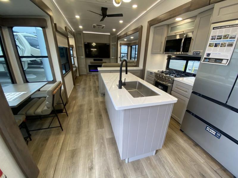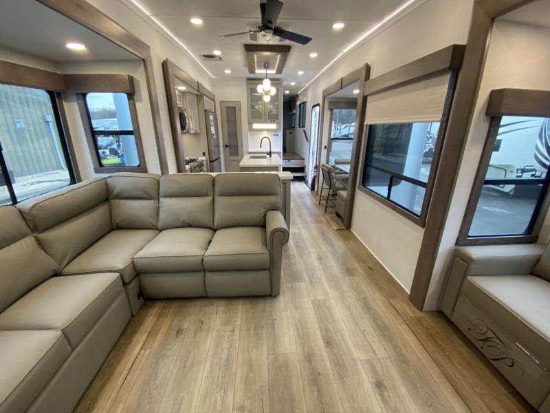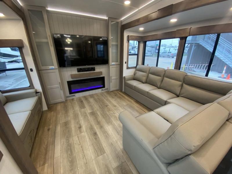You'll love everything about this luxurious fifth wheel! There are five slide outs so you can enjoy more space than ever, and the rear living area can double as a den for guest. They can sleep on the sleeper sofa or second sofa with overhead storage, and there is a dual recliner across from the 65" Smart TV. The middle kitchen includes a kitchen island with dishwasher prep, generous counter space, a pantry and hutch for storage, and a swivel table and desk to dine or work at! This model also includes a spacious full bath with a large 61" x 30" shower for all-around comfort plus a front private bedroom with a king bed slide out. There is also a walk-in closet with washer and dryer prep, a flip top dresser with a Smart TV, and a seat with storage to keep everything tidy!
