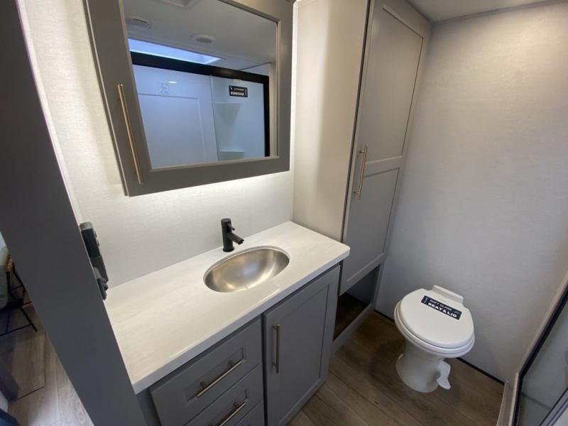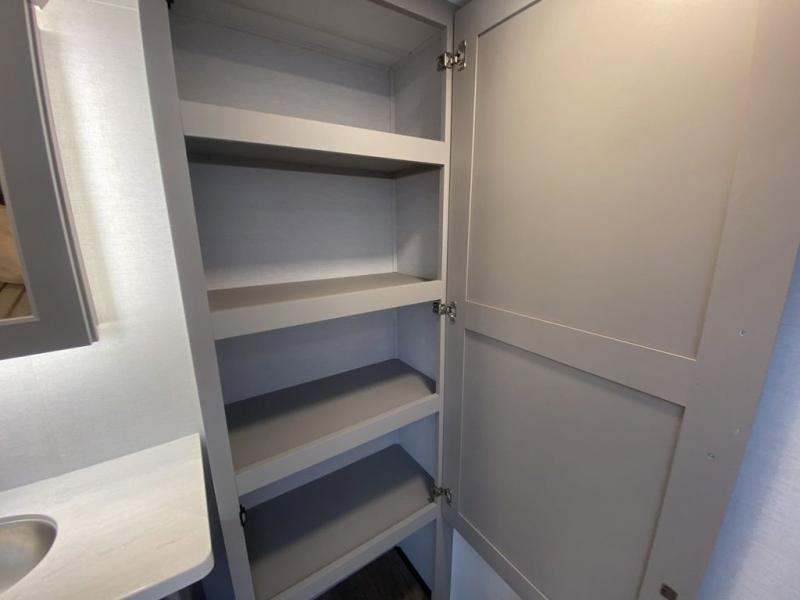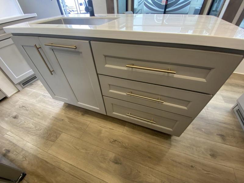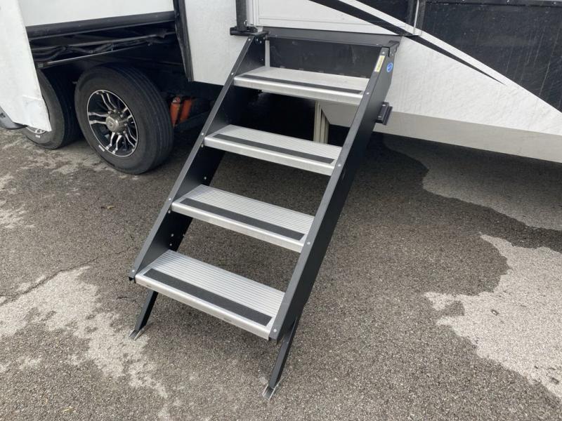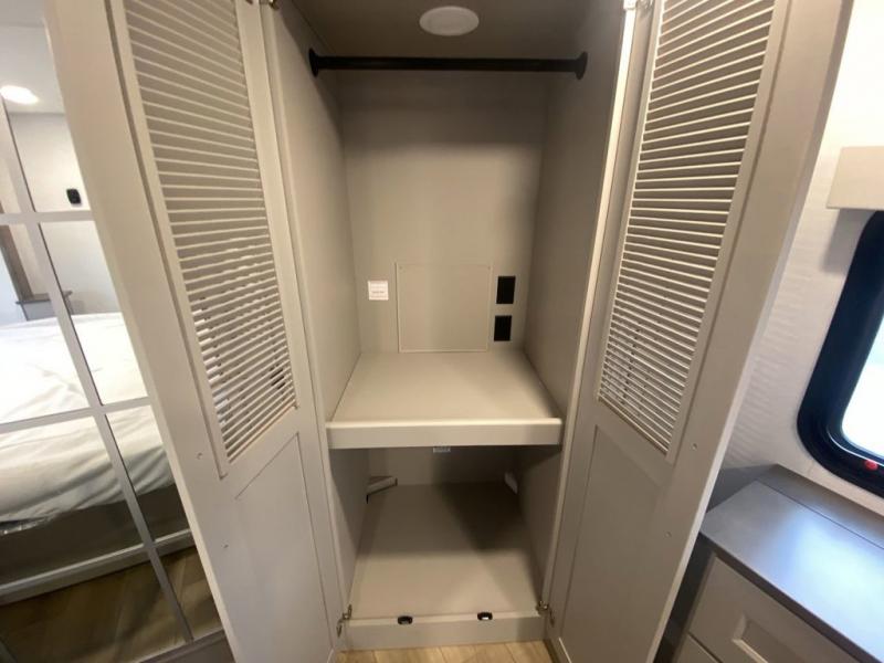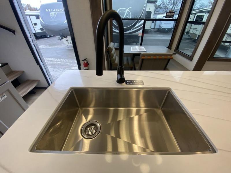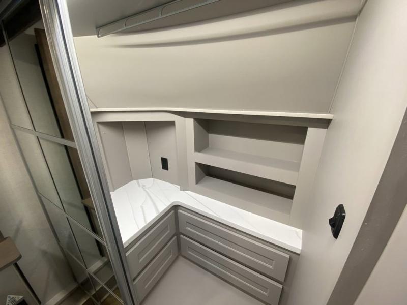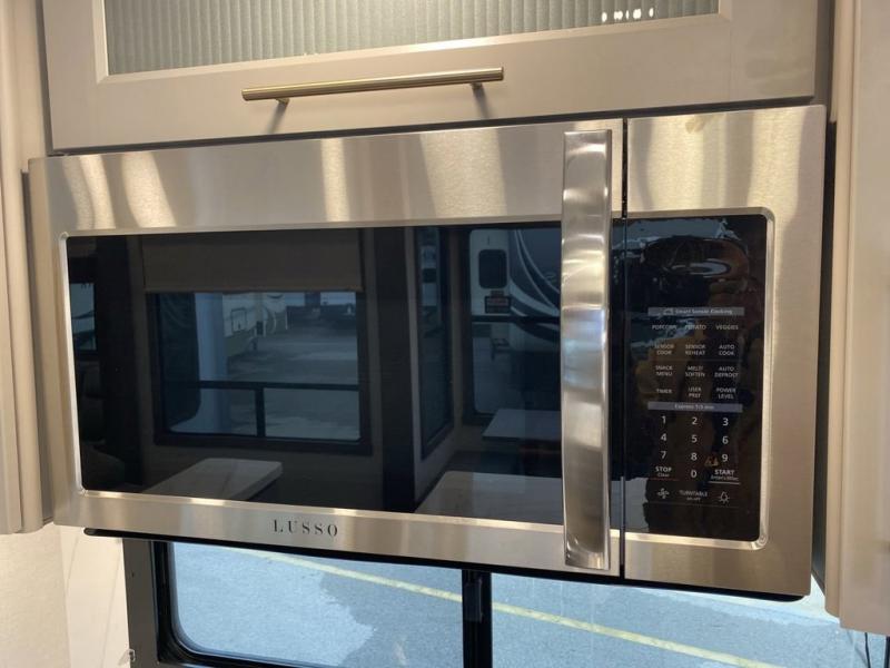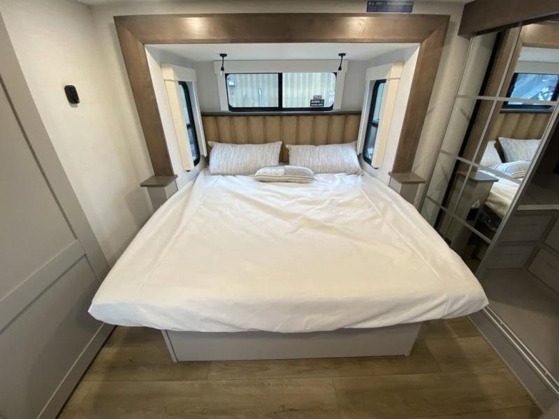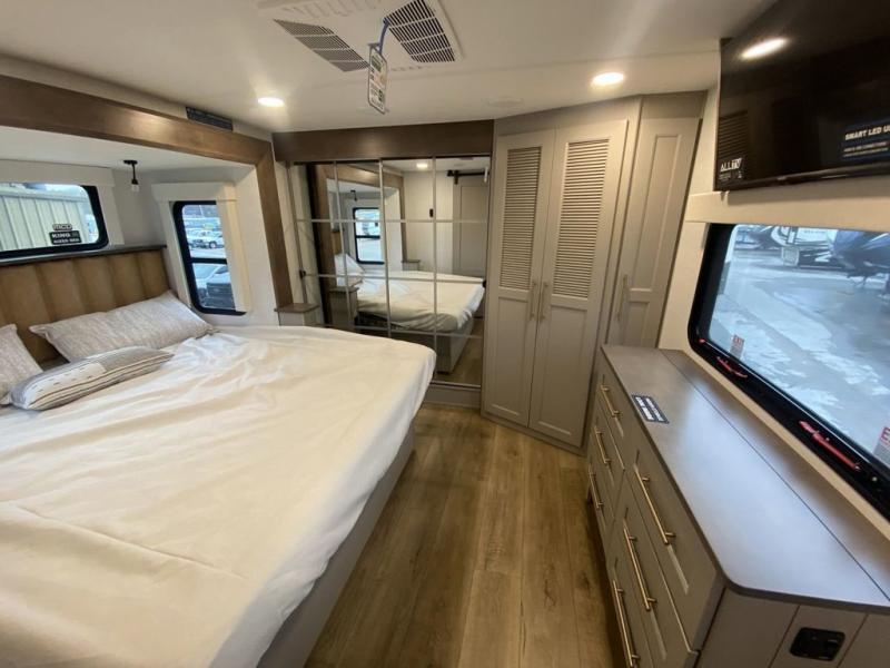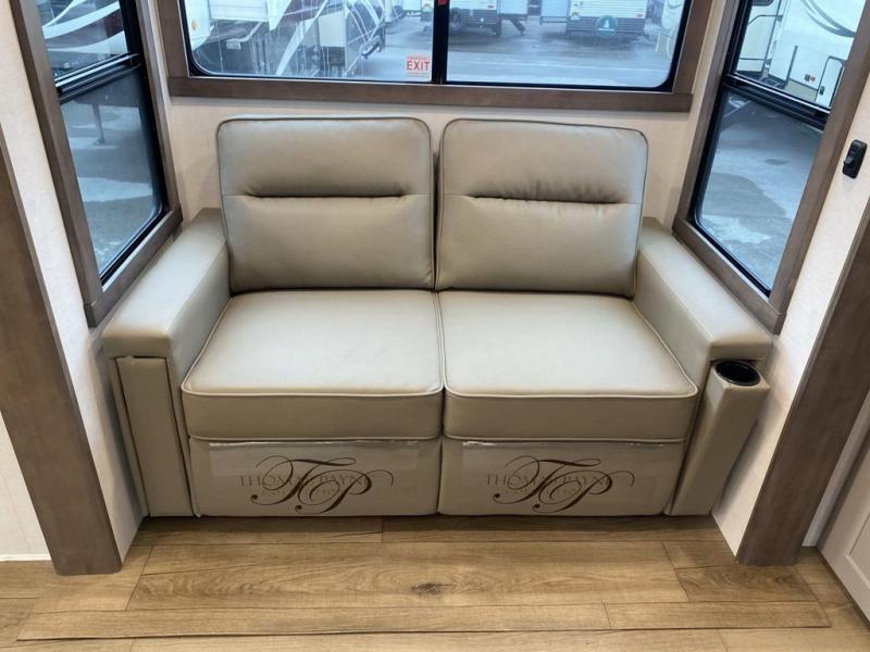 You'll love everything about this luxurious fifth wheel! There are five slide outs so you can enjoy more space than ever, and the rear living area can double as a den for guest. They can sleep on the sleeper sofa or second sofa with overhead storage, and there is a dual recliner across from the 65" Smart TV. The middle kitchen includes a kitchen island with dishwasher prep, generous counter space, a pantry and hutch for storage, and a swivel table and desk to dine or work at! This model also includes a spacious full bath with a large 61" x 30" shower for all-around comfort plus a front private bedroom with a king bed slide out. There is also a walk-in closet with washer and dryer prep, a flip top dresser with a Smart TV, and a seat with storage to keep everything tidy!