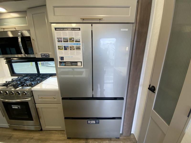 The Paradigm fifth wheels by Alliance RV are functional, high-quality, and luxurious for an unforgettable camping experience. There are three A/C units and a 40K BTU furnace to keep you comfortable year around, and you'll appreciate additional convenient amenities, like the all-in-one enclosed/heated utility center and the color coded and numbered wiring. A Helux Series coil spring pin box comes standard for hassle-free towing, along with Curt 8,000 lb. axles. You'll love the kitchen with its LG solid surface countertops and Lusso range, plus there is LED motion lighting in the pantry and a Maxx fan with a rain sensor to keep everything fresh when making dinner. Each model also includes an HD Smart TV in the living room and bedroom. And of course there are a variety of options you can choose from to further customize your fifth wheel; dual pane windows, Super Solar Plus, slide out awning toppers, and generator prep or a generator to name a few!