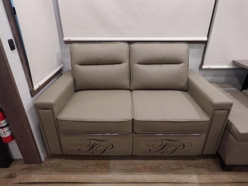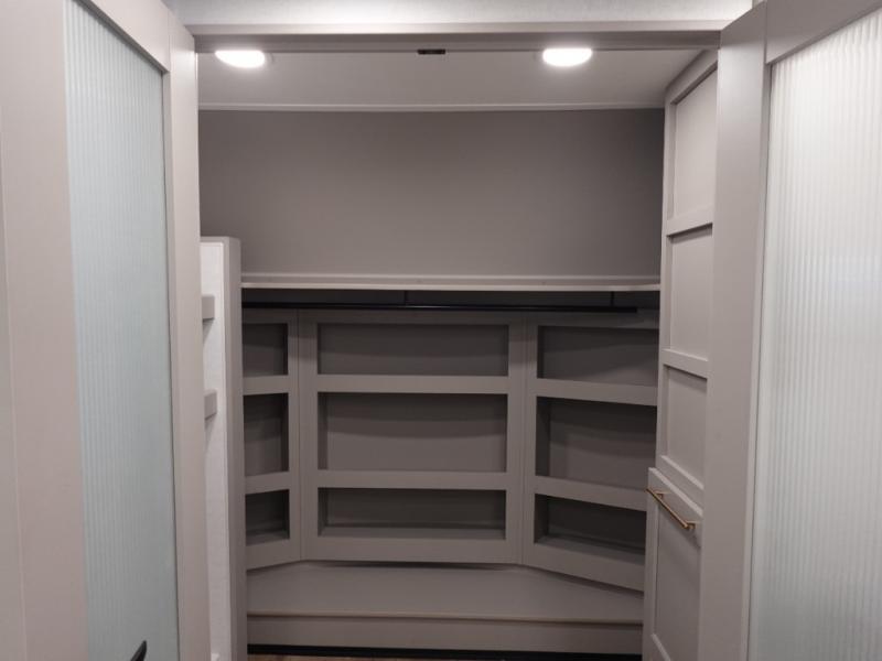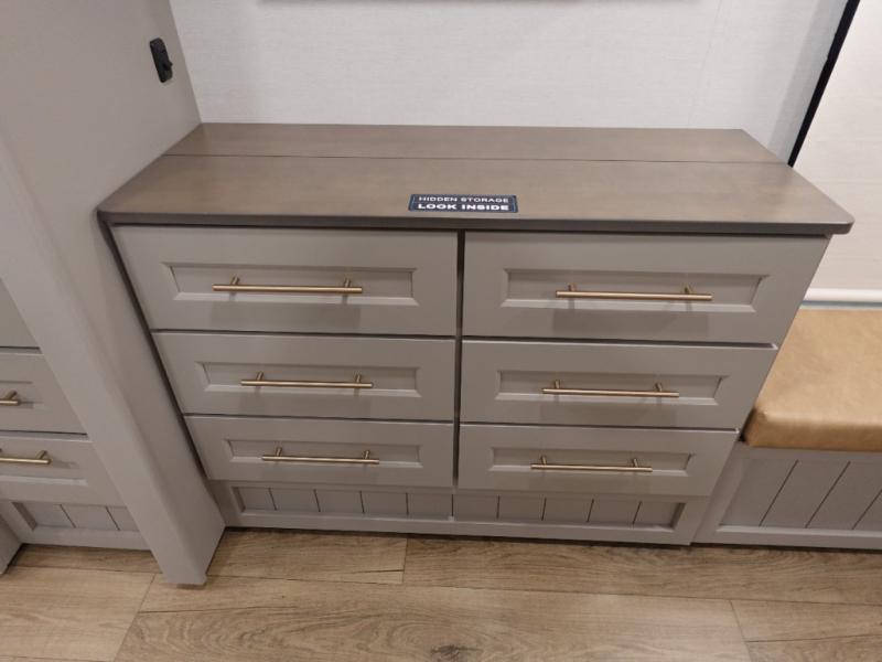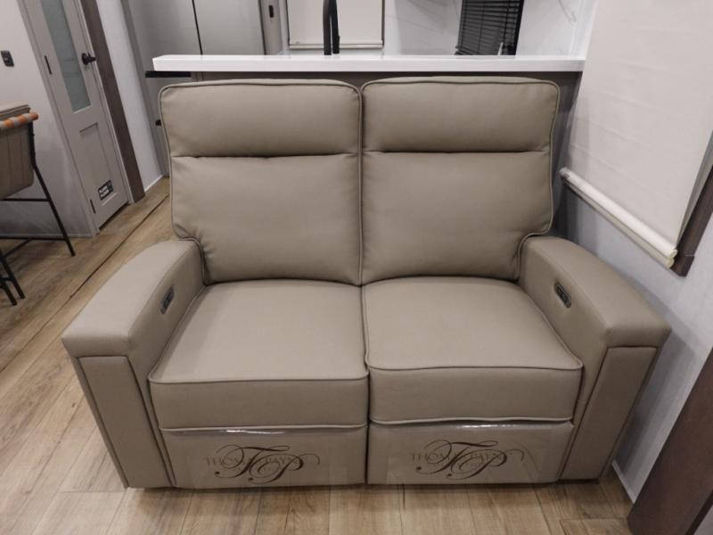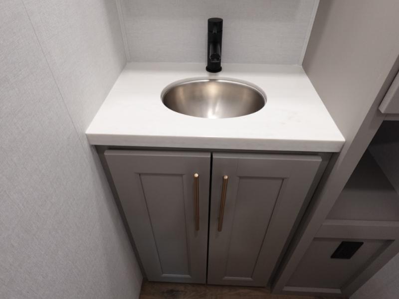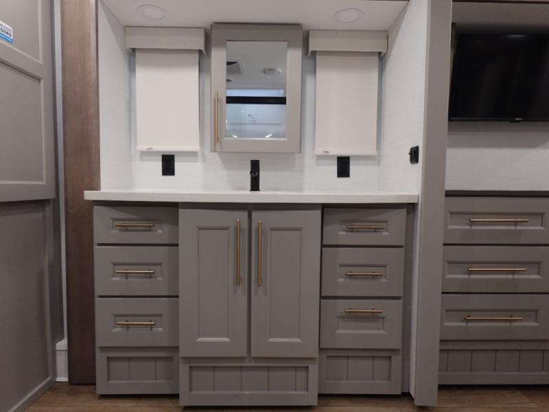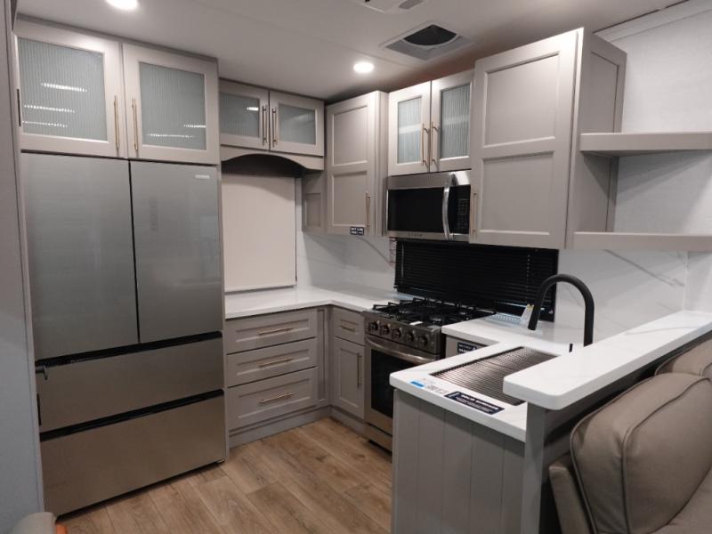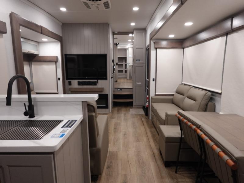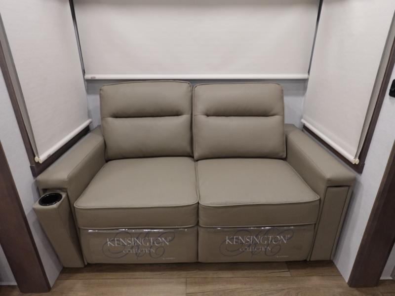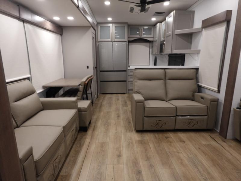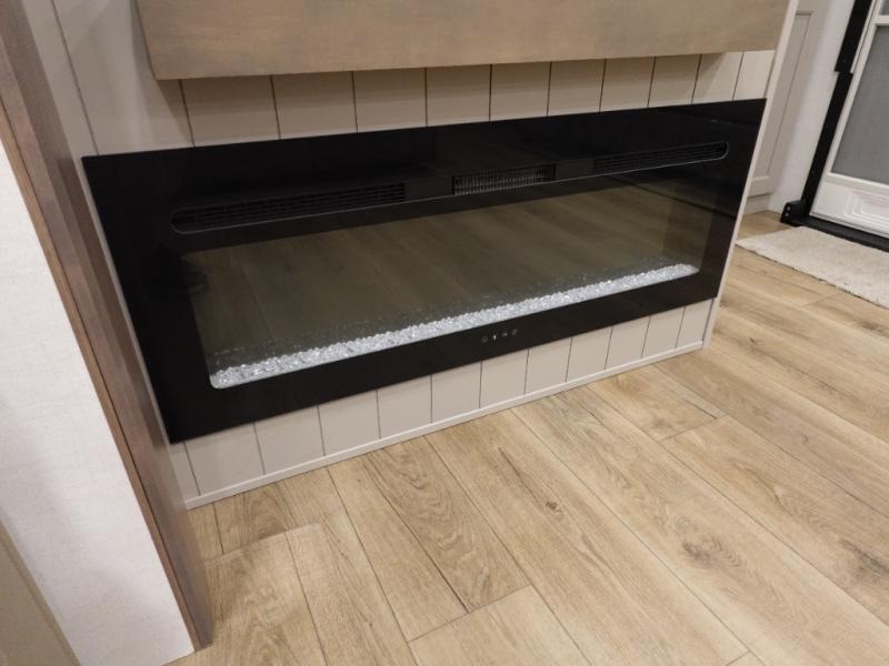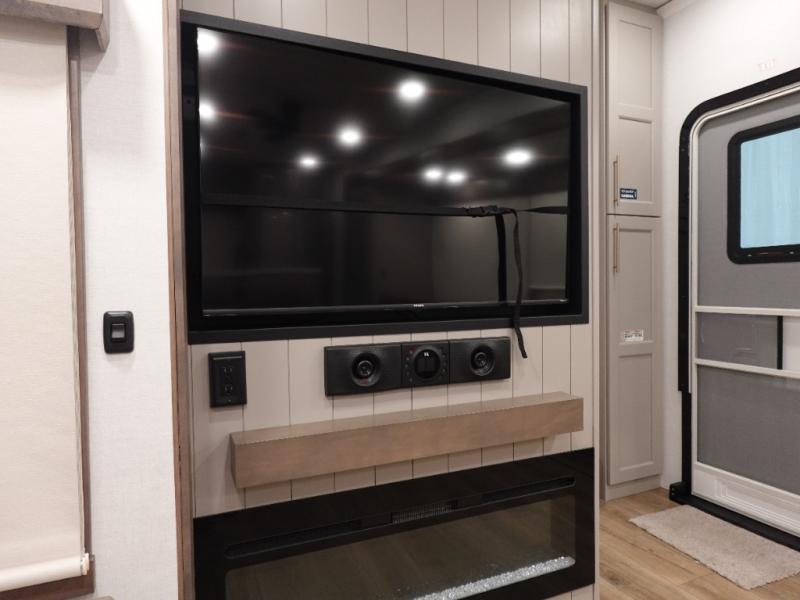 You won't want to camp any other way once you step inside this fifth wheel! the chef will enjoy all of the space in the rear kitchen with ample counter space, a 19 cu. ft. 12 volt residential refrigerator, and a pantry for snacks. Everyone will love to meet in the middle living area that includes dual sleeper sofas and a dual recliner loveseat across from the 50" Smart TV and fireplace. The half bathroom is nearby for quick bathroom breaks too. You will feel right at home in the master suite with a king bed slide to lay your head on at night, a flip top dresser with a Smart TV above it to watch your movies in true comfort, and a seat with storage, plus access to the front full bathroom. Inside the bathroom, you will find a 61" x 30" shower to freshen up in and a walk-in closet with a hamper, shelves, and washer and dryer prep for clean clothes throughout your entire trip!
