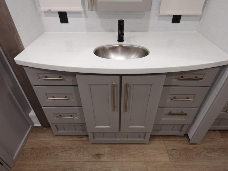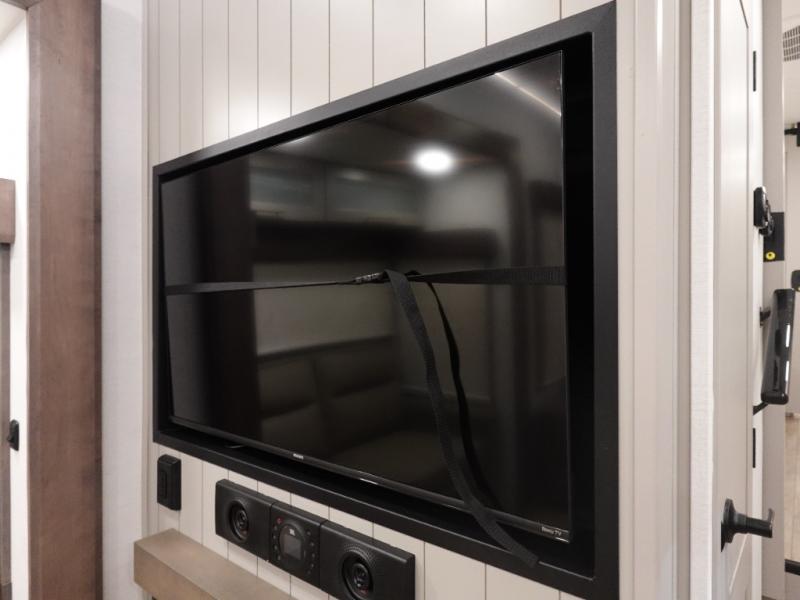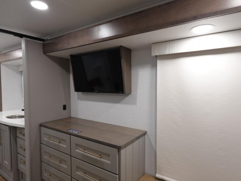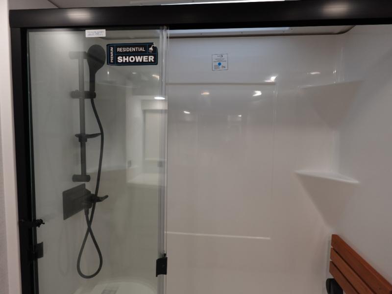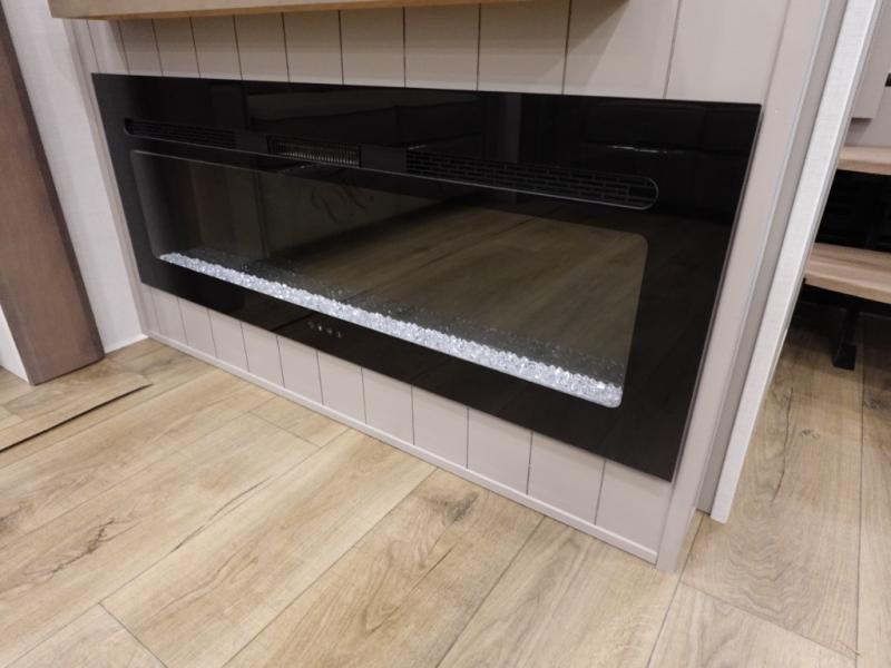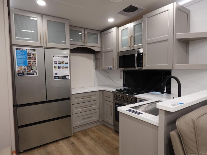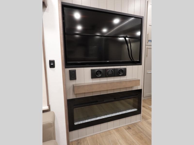 You won't want to camp any other way once you step inside this fifth wheel! the chef will enjoy all of the space in the rear kitchen with ample counter space, a 19 cu. ft. 12 volt residential refrigerator, and a pantry for snacks. Everyone will love to meet in the middle living area that includes dual sleeper sofas and a dual recliner loveseat across from the 50" Smart TV and fireplace. The half bathroom is nearby for quick bathroom breaks too. You will feel right at home in the master suite with a king bed slide to lay your head on at night, a flip top dresser with a Smart TV above it to watch your movies in true comfort, and a seat with storage, plus access to the front full bathroom. Inside the bathroom, you will find a 61" x 30" shower to freshen up in and a walk-in closet with a hamper, shelves, and washer and dryer prep for clean clothes throughout your entire trip!