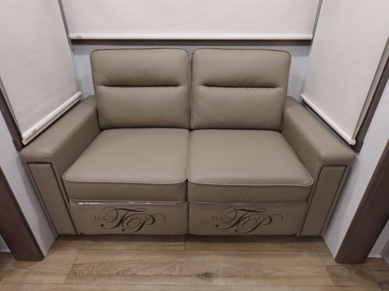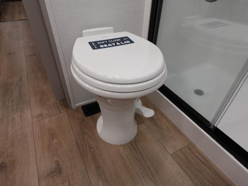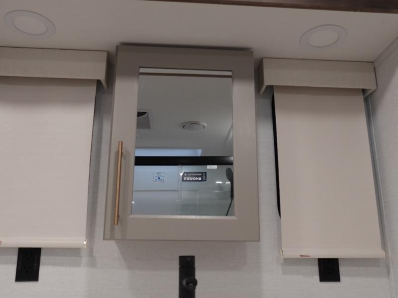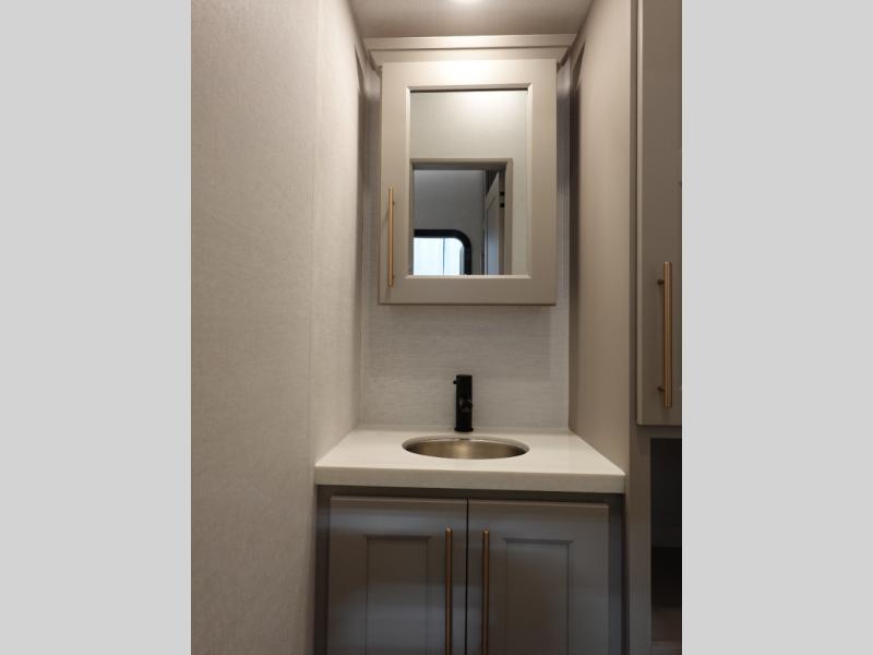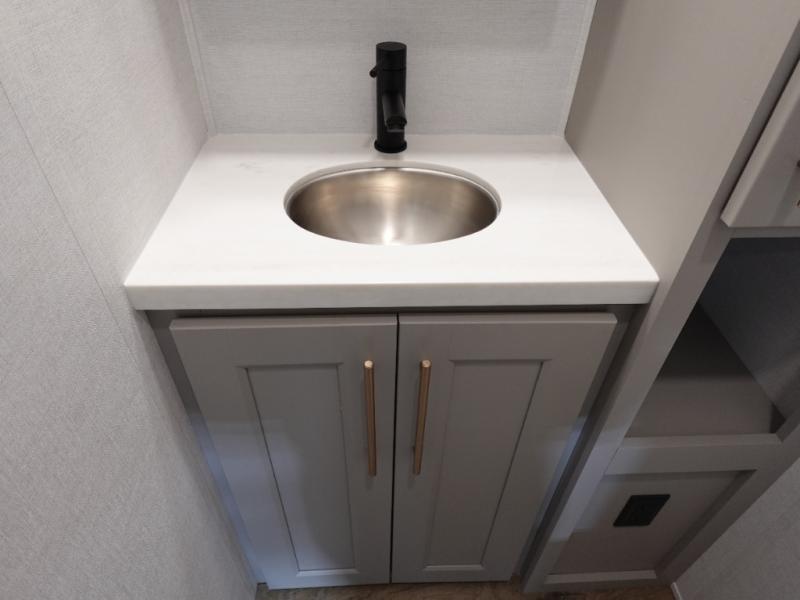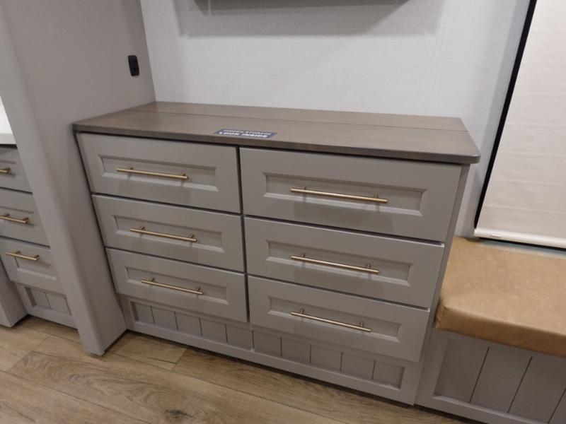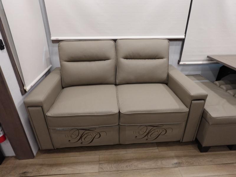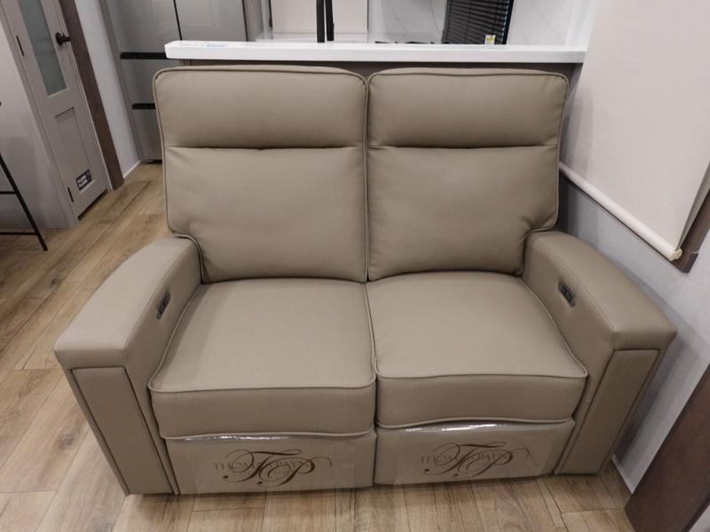 You won't want to camp any other way once you step inside this fifth wheel! the chef will enjoy all of the space in the rear kitchen with ample counter space, a 19 cu. ft. 12 volt residential refrigerator, and a pantry for snacks. Everyone will love to meet in the middle living area that includes dual sleeper sofas and a dual recliner loveseat across from the 50" Smart TV and fireplace. The half bathroom is nearby for quick bathroom breaks too. You will feel right at home in the master suite with a king bed slide to lay your head on at night, a flip top dresser with a Smart TV above it to watch your movies in true comfort, and a seat with storage, plus access to the front full bathroom. Inside the bathroom, you will find a 61" x 30" shower to freshen up in and a walk-in closet with a hamper, shelves, and washer and dryer prep for clean clothes throughout your entire trip!