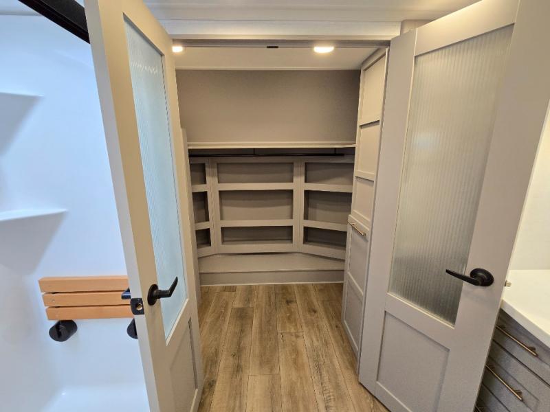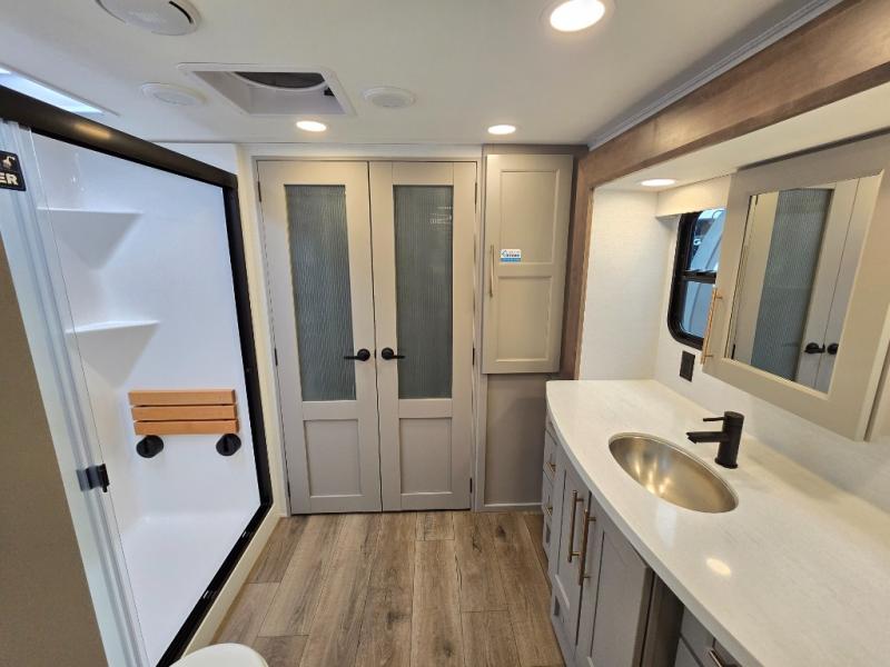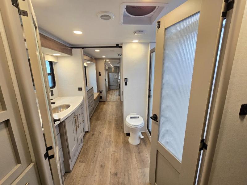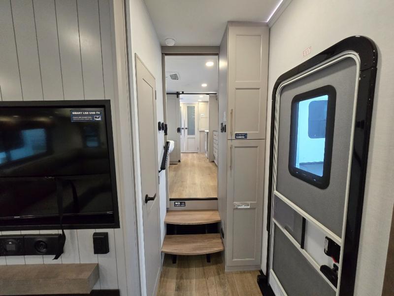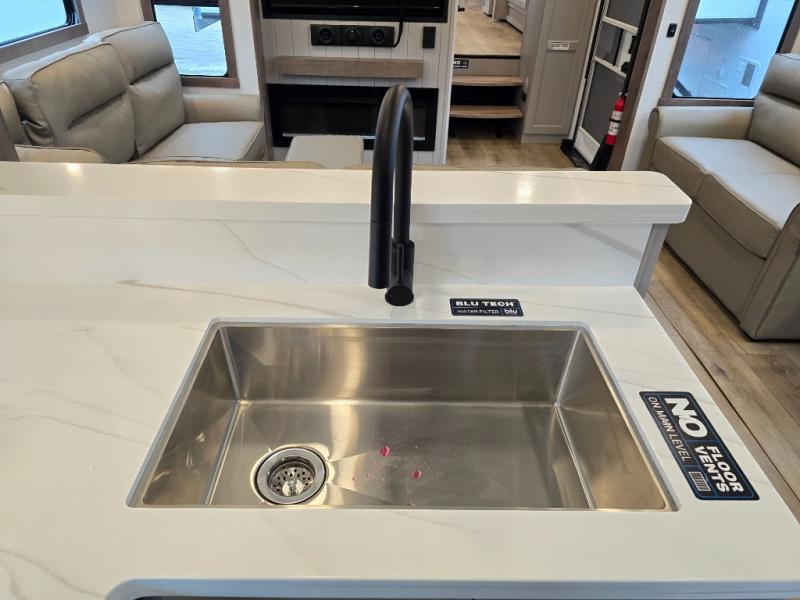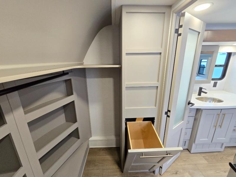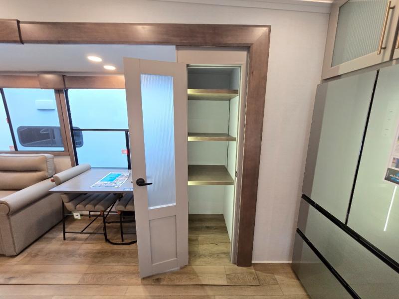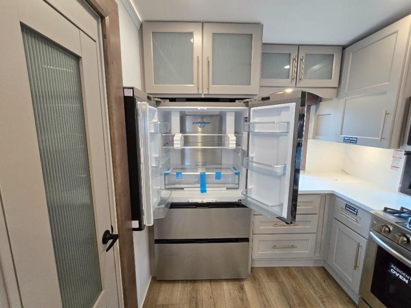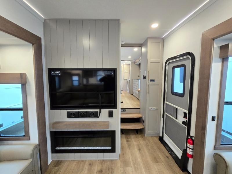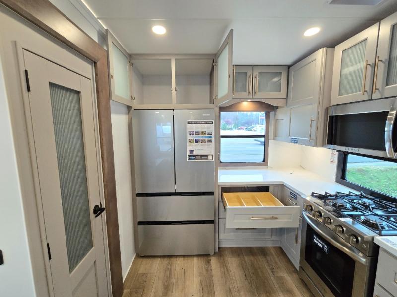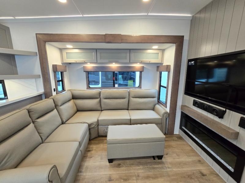 You won't want to camp any other way once you step inside this fifth wheel! the chef will enjoy all of the space in the rear kitchen with ample counter space, a 19 cu. ft. 12 volt residential refrigerator, and a pantry for snacks. Everyone will love to meet in the middle living area that includes dual sleeper sofas and a dual recliner loveseat across from the 50" Smart TV and fireplace. The half bathroom is nearby for quick bathroom breaks too. You will feel right at home in the master suite with a king bed slide to lay your head on at night, a flip top dresser with a Smart TV above it to watch your movies in true comfort, and a seat with storage, plus access to the front full bathroom. Inside the bathroom, you will find a 61" x 30" shower to freshen up in and a walk-in closet with a hamper, shelves, and washer and dryer prep for clean clothes throughout your entire trip!