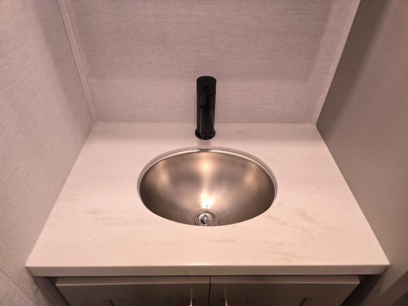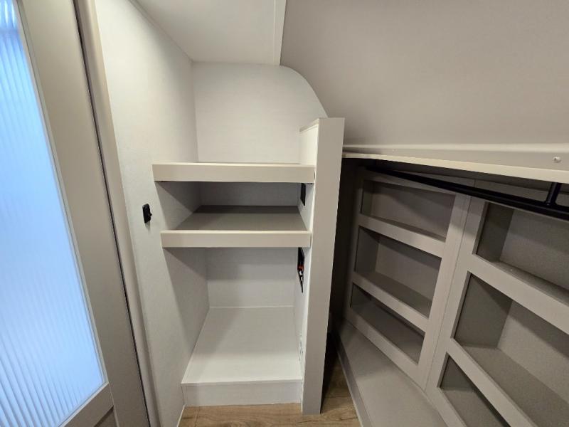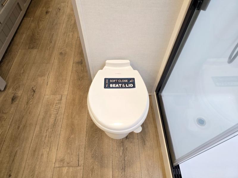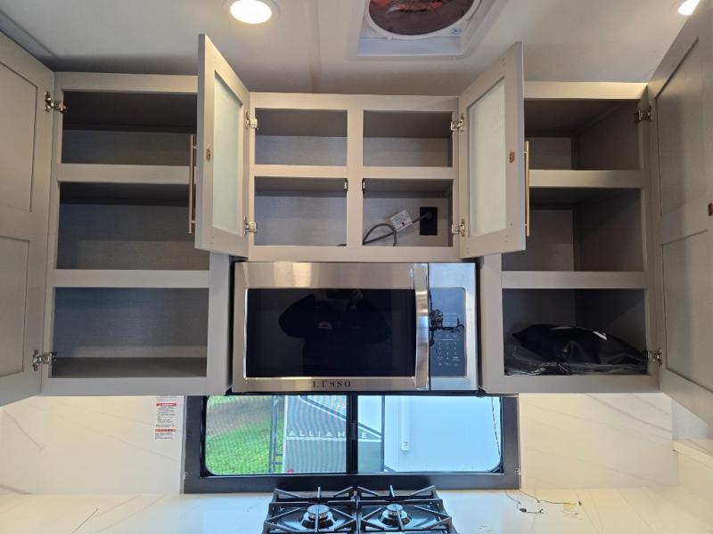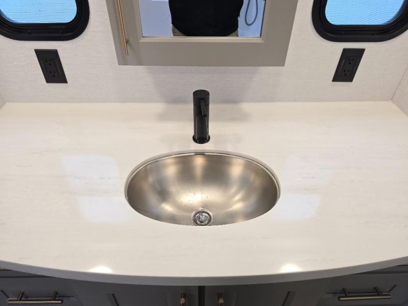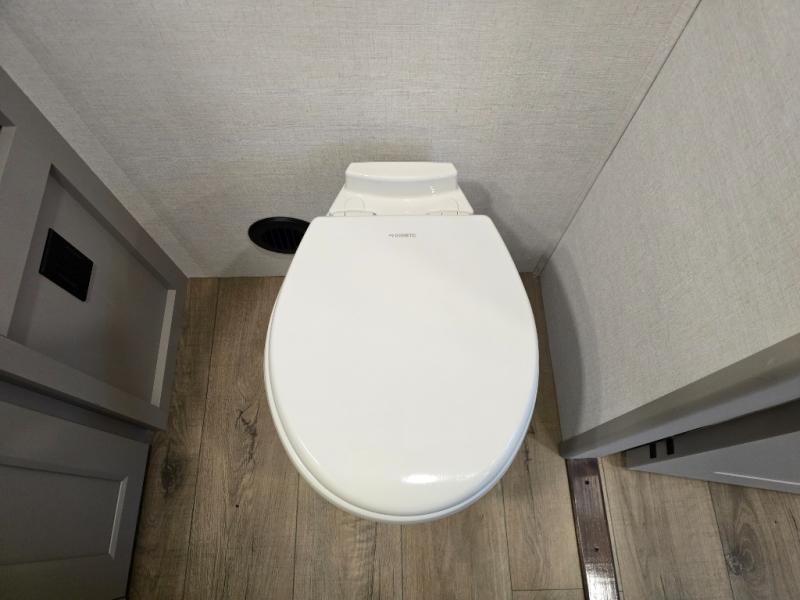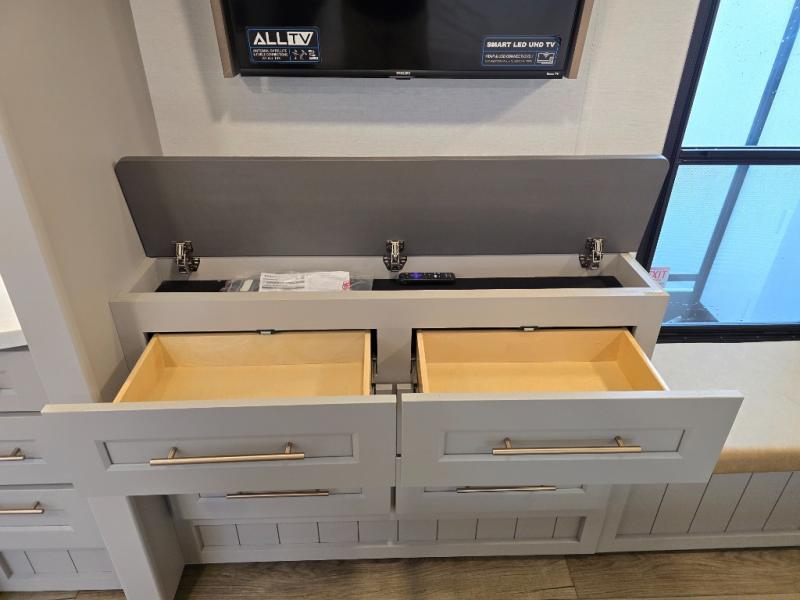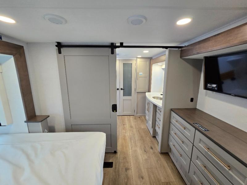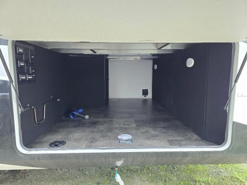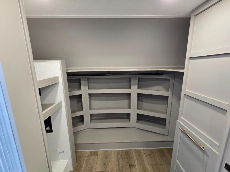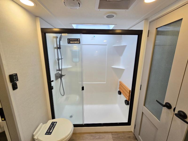 You won't want to camp any other way once you step inside this fifth wheel! the chef will enjoy all of the space in the rear kitchen with ample counter space, a 19 cu. ft. 12 volt residential refrigerator, and a pantry for snacks. Everyone will love to meet in the middle living area that includes dual sleeper sofas and a dual recliner loveseat across from the 50" Smart TV and fireplace. The half bathroom is nearby for quick bathroom breaks too. You will feel right at home in the master suite with a king bed slide to lay your head on at night, a flip top dresser with a Smart TV above it to watch your movies in true comfort, and a seat with storage, plus access to the front full bathroom. Inside the bathroom, you will find a 61" x 30" shower to freshen up in and a walk-in closet with a hamper, shelves, and washer and dryer prep for clean clothes throughout your entire trip!