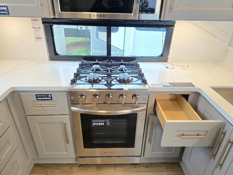 The Paradigm fifth wheels by Alliance RV are functional, high-quality, and luxurious for an unforgettable camping experience. There are three A/C units and a 40K BTU furnace to keep you comfortable year around, and you'll appreciate additional convenient amenities, like the all-in-one enclosed/heated utility center and the color coded and numbered wiring. A Helux Series coil spring pin box comes standard for hassle-free towing, along with Super-G 4,400 lb. rated tires and Dexter 7,000 lb. axles. You'll love the kitchen with its LG solid surface countertops and Lusso range, plus there is LED motion lighting in the pantry and a Maxx fan with a rain sensor to keep everything fresh when making dinner. Each model also includes an HD Smart TV in the living room and bedroom, plus a Winegard Air 360 antenna to keep you connected to the outside world. And of course there are a variety of options you can choose from to further customize your fifth wheel; dual pane windows, Super Solar Plus, slide out awning toppers, and generator prep or a generator to name a few!