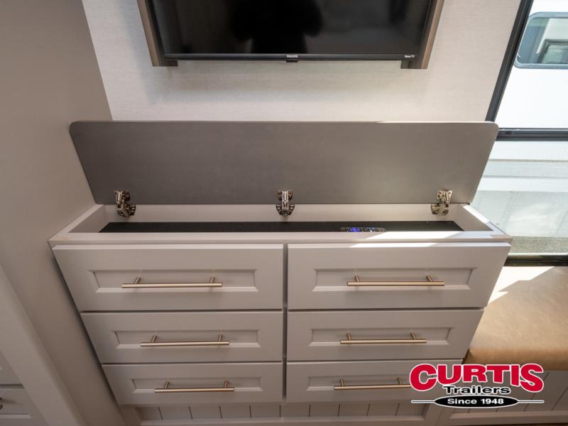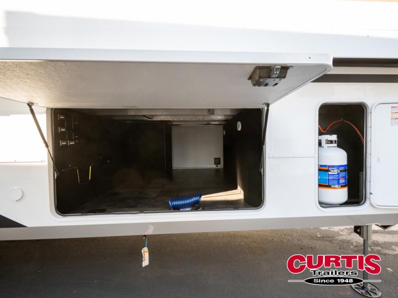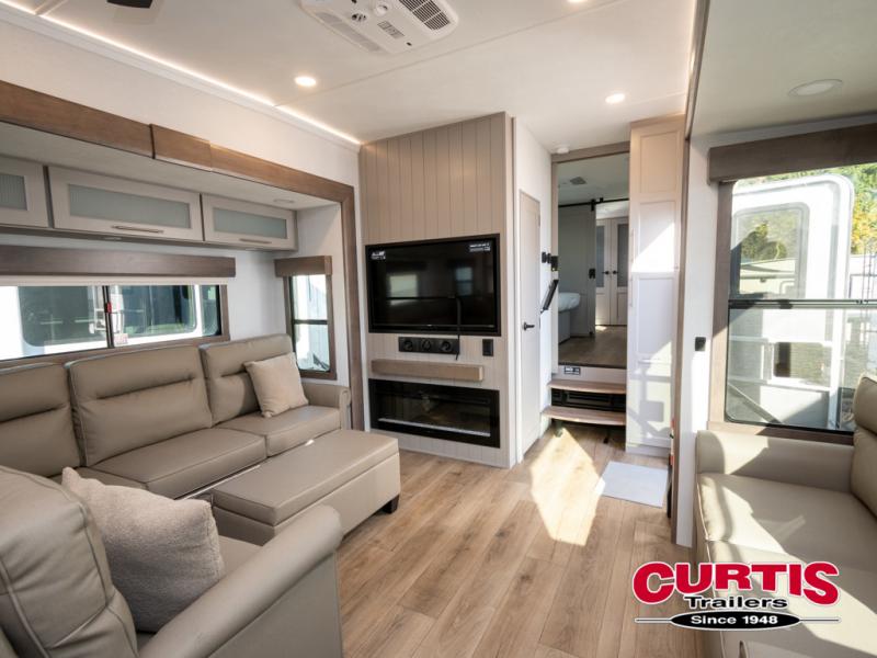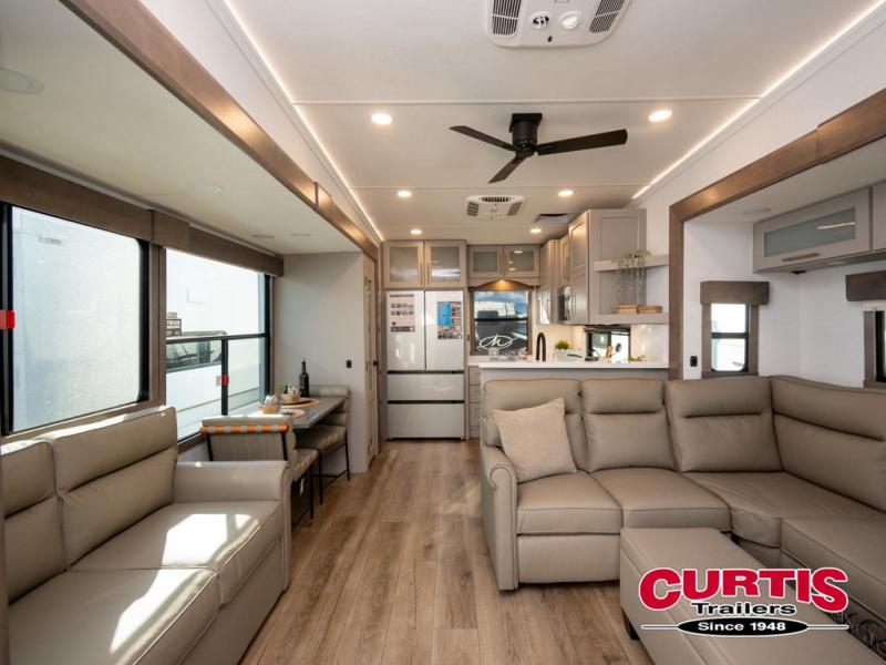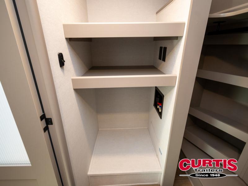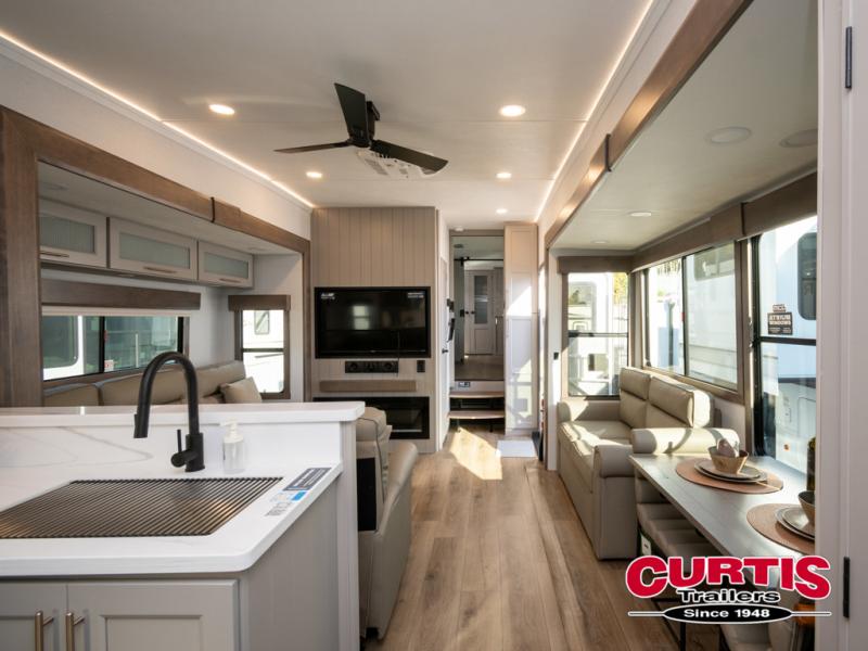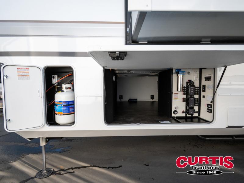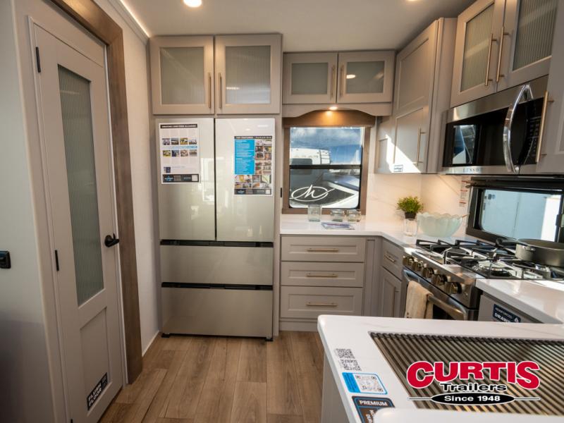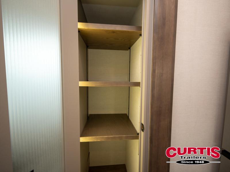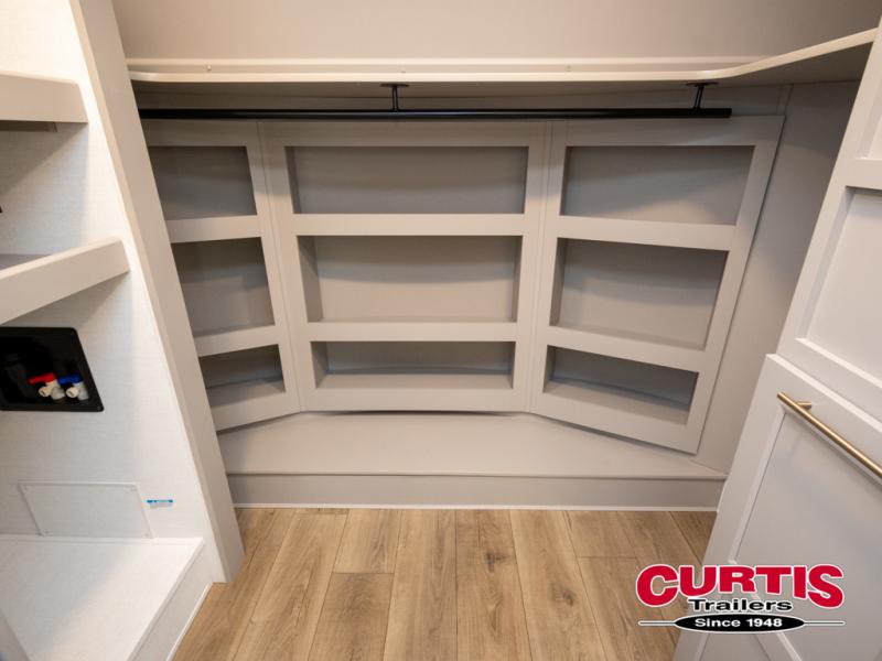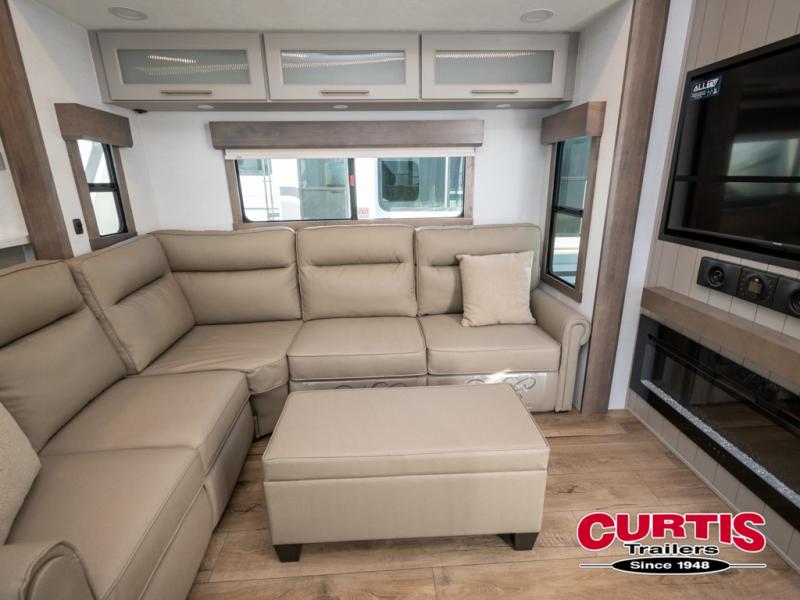 You won't want to camp any other way once you step inside this fifth wheel! the chef will enjoy all of the space in the rear kitchen with ample counter space, a 19 cu. ft. 12 volt residential refrigerator, and a pantry for snacks. Everyone will love to meet in the middle living area that includes dual sleeper sofas and a dual recliner loveseat across from the 50" Smart TV and fireplace. The half bathroom is nearby for quick bathroom breaks too. You will feel right at home in the master suite with a king bed slide to lay your head on at night, a flip top dresser with a Smart TV above it to watch your movies in true comfort, and a seat with storage, plus access to the front full bathroom. Inside the bathroom, you will find a 61" x 30" shower to freshen up in and a walk-in closet with a hamper, shelves, and washer and dryer prep for clean clothes throughout your entire trip!