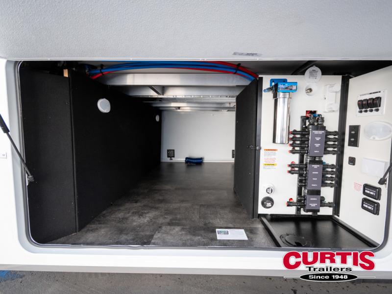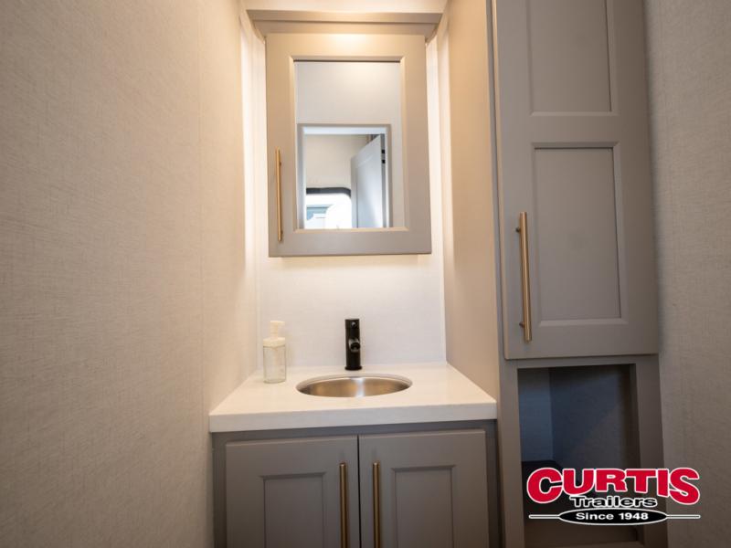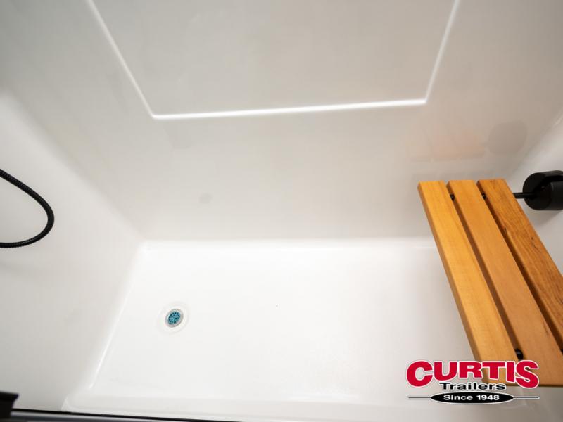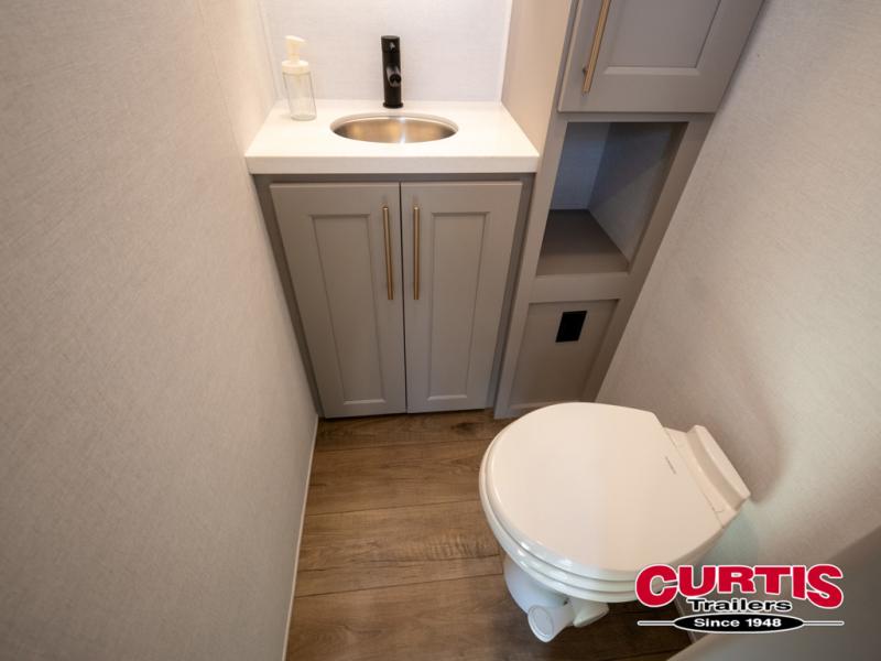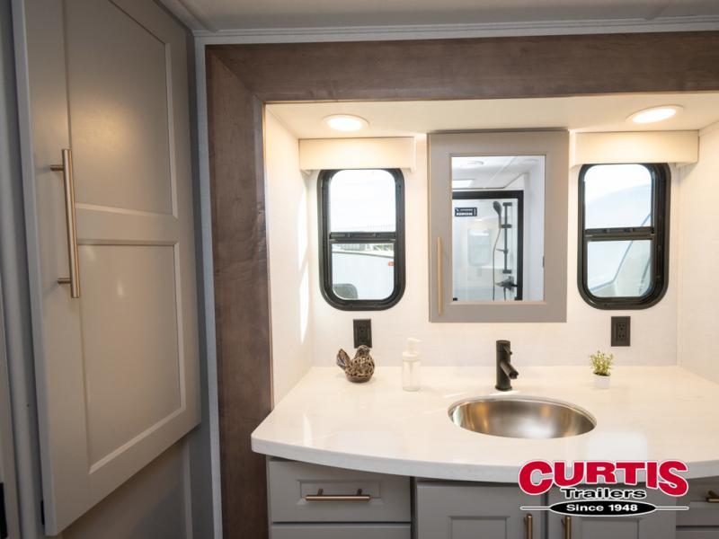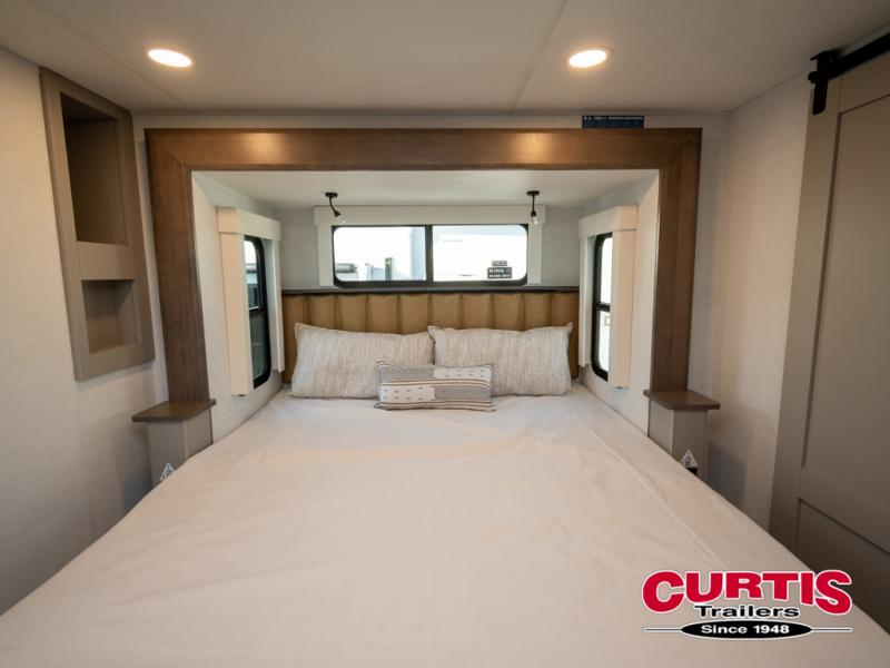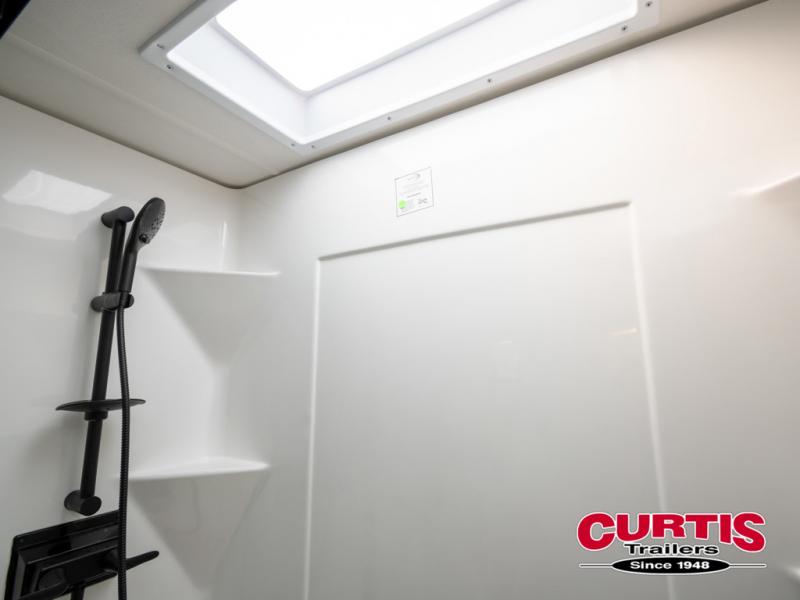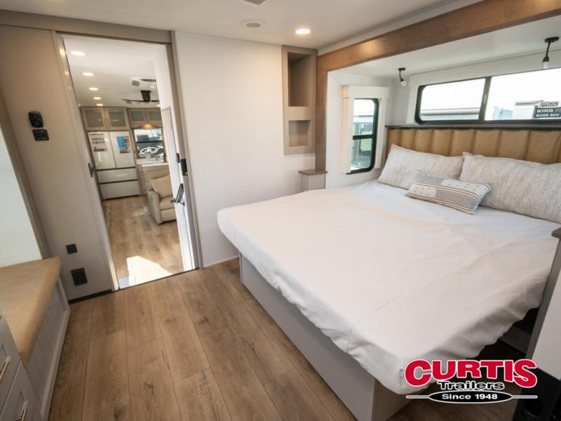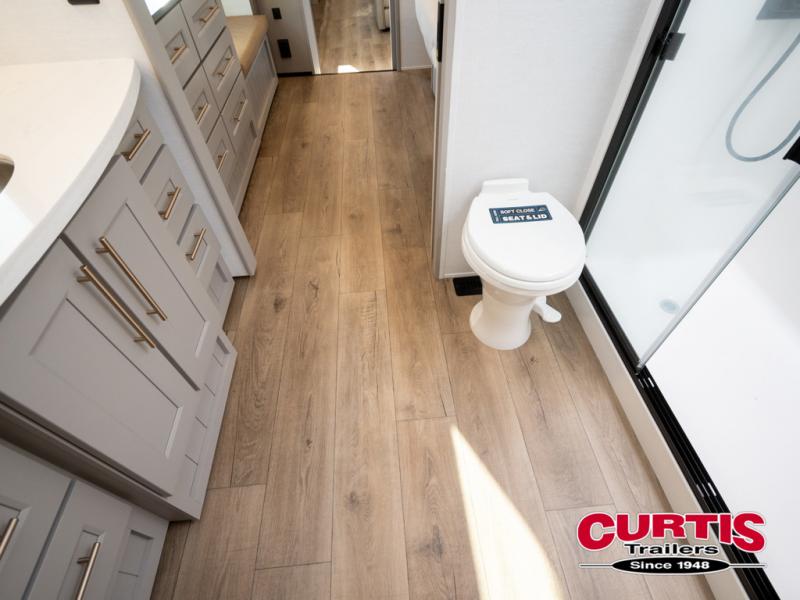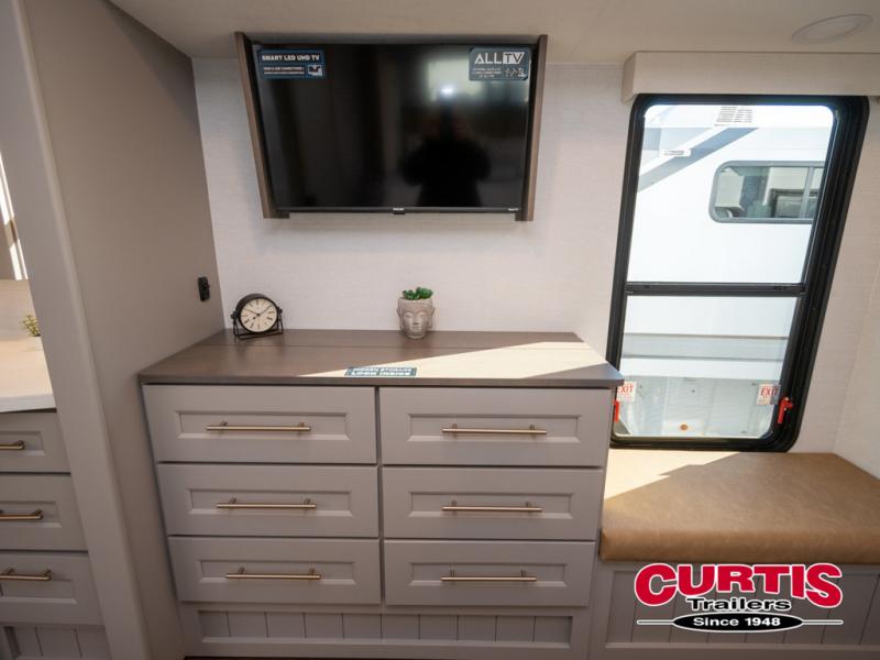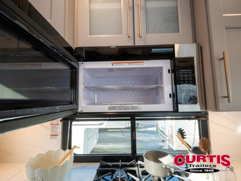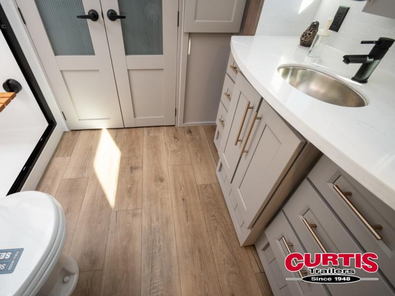 You won't want to camp any other way once you step inside this fifth wheel! the chef will enjoy all of the space in the rear kitchen with ample counter space, a 19 cu. ft. 12 volt residential refrigerator, and a pantry for snacks. Everyone will love to meet in the middle living area that includes dual sleeper sofas and a dual recliner loveseat across from the 50" Smart TV and fireplace. The half bathroom is nearby for quick bathroom breaks too. You will feel right at home in the master suite with a king bed slide to lay your head on at night, a flip top dresser with a Smart TV above it to watch your movies in true comfort, and a seat with storage, plus access to the front full bathroom. Inside the bathroom, you will find a 61" x 30" shower to freshen up in and a walk-in closet with a hamper, shelves, and washer and dryer prep for clean clothes throughout your entire trip!