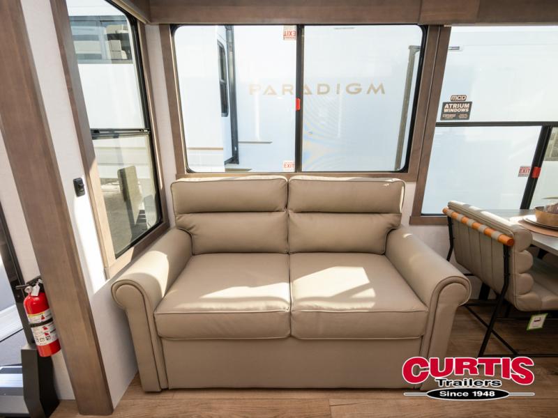 The Paradigm fifth wheels by Alliance RV are functional, high-quality, and luxurious for an unforgettable camping experience. There are three A/C units and a 40K BTU furnace to keep you comfortable year around, and you'll appreciate additional convenient amenities, like the all-in-one enclosed/heated utility center and the color coded and numbered wiring. A Helux Series coil spring pin box comes standard for hassle-free towing, along with Curt 8,000 lb. axles. You'll love the kitchen with its LG solid surface countertops and Lusso range, plus there is LED motion lighting in the pantry and a Maxx fan with a rain sensor to keep everything fresh when making dinner. Each model also includes an HD Smart TV in the living room and bedroom. And of course there are a variety of options you can choose from to further customize your fifth wheel; dual pane windows, Super Solar Plus, slide out awning toppers, and generator prep or a generator to name a few!