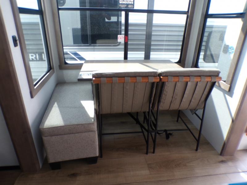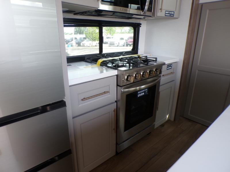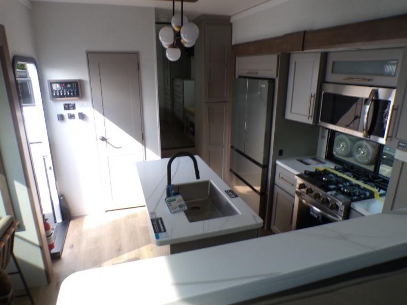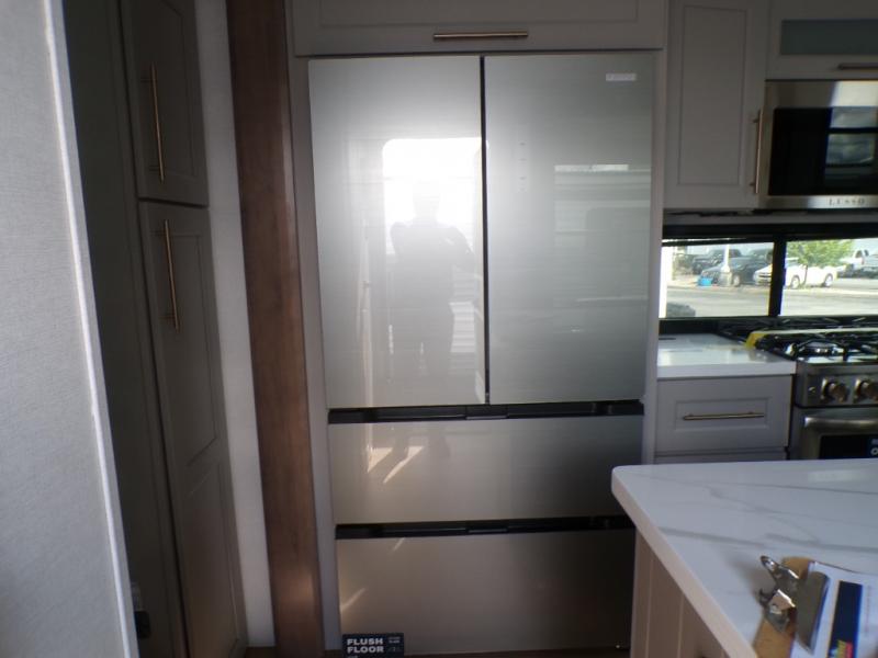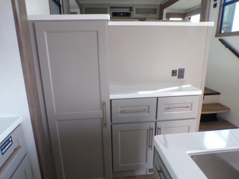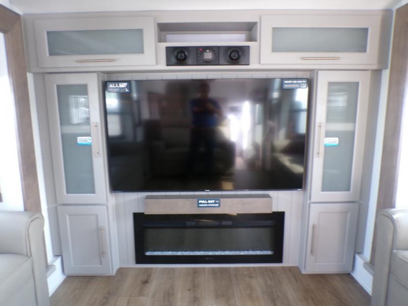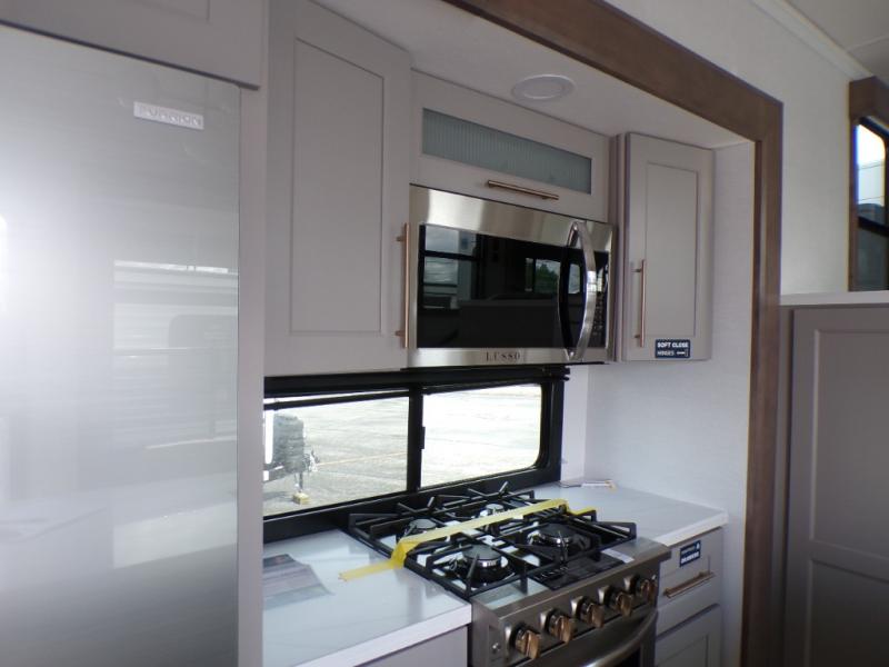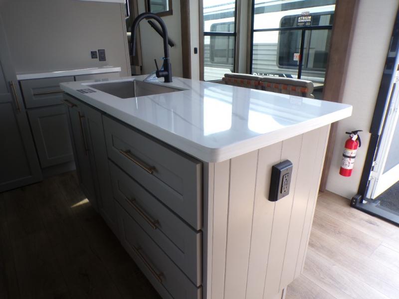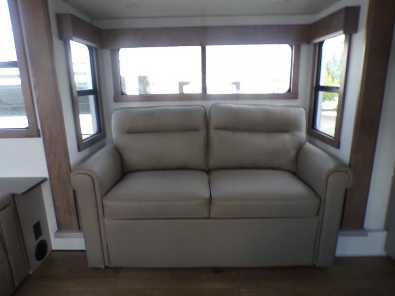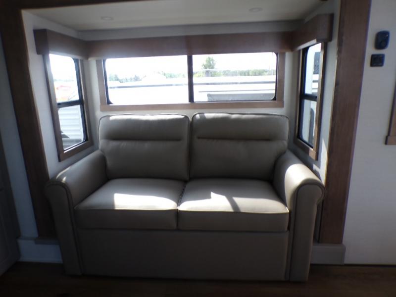 An active family will want this fifth wheel with its 48" x 115" exterior basement pull-out tray for kayaks or extra storage. Just above this area is the master suite with a rear bathroom that offers a residential shower, a porcelain toilet with soft close seat, plus a wardrobe and shelf storage. The king bed slide gives you more floor space, and you will have a seat, a flip-top dresser, and a Smart TV to watch movies in bed. The half bath is next to the main entry which is super convenient, and the middle kitchen is separate from the front living area. The cook will love the residential microwave, range and oven, plus the 19 cu. ft. 12 volt residential refrigerator. There is also a pantry and extra counter space on the kitchen island with a large sink. The views out of the atrium windows in the slide out, which includes the swivel table and desk, are a must see. And when you need to watch the big game, the 55" Smart TV with a pull-out fireplace storage are up front with the dual recliner love seat and two sleeper sofas.