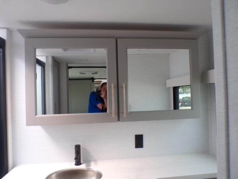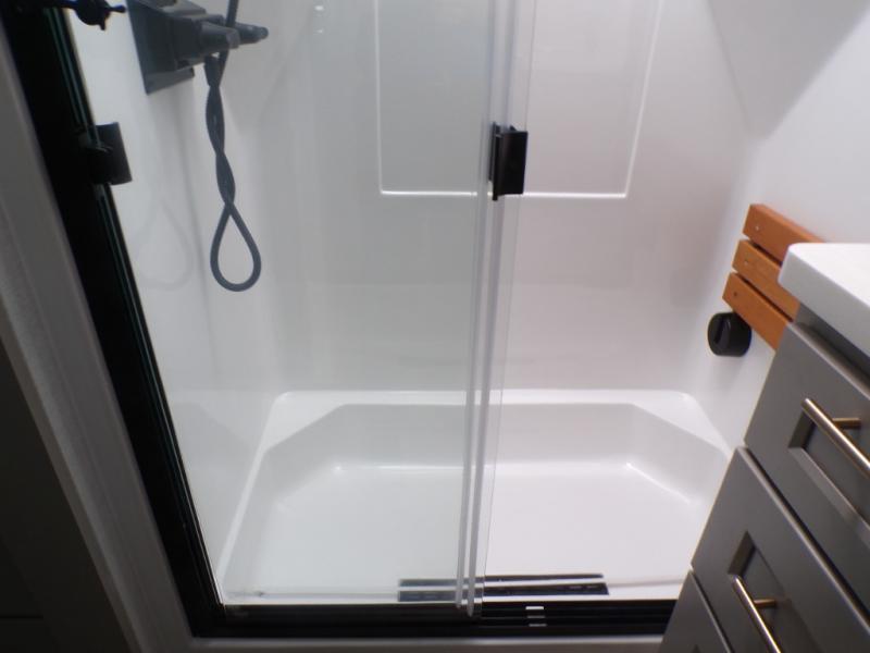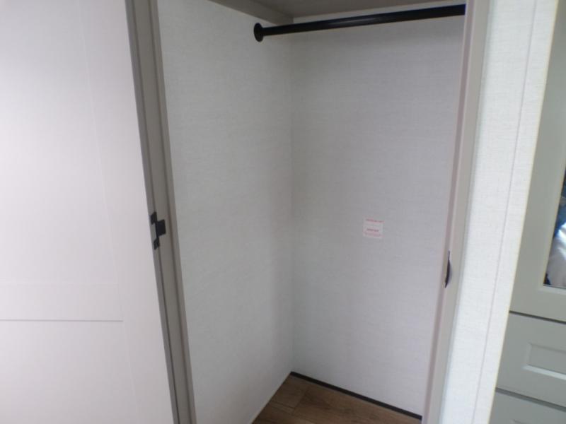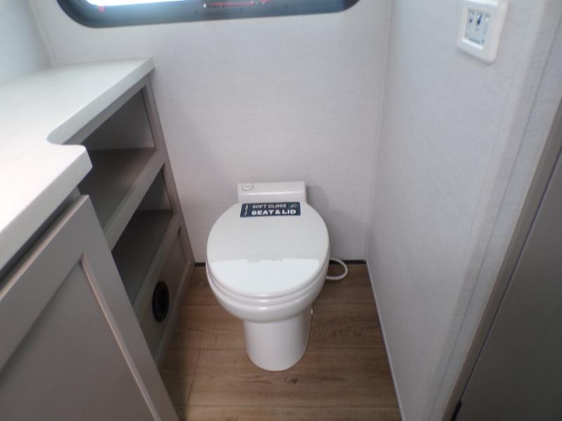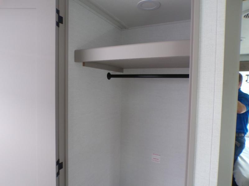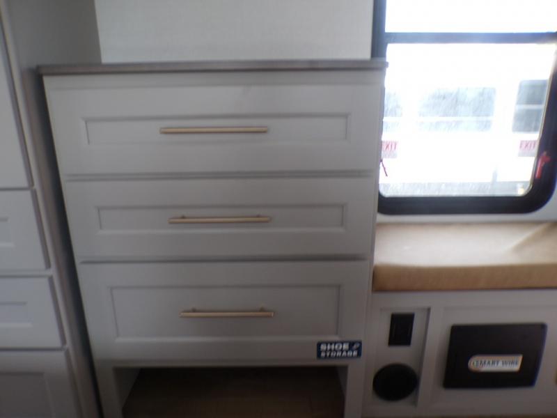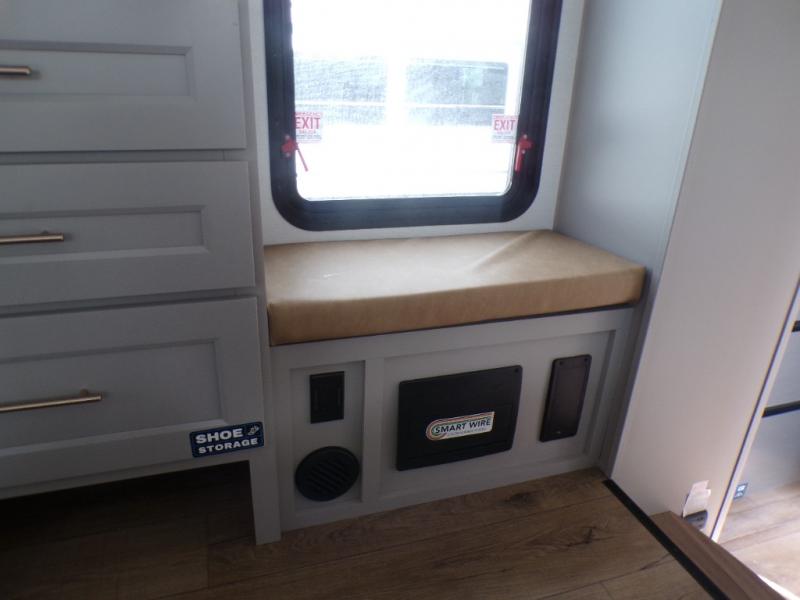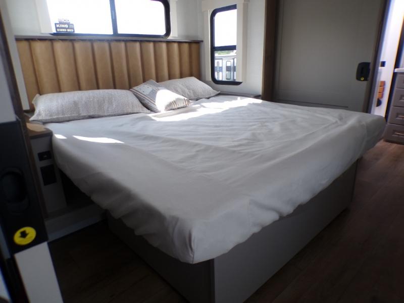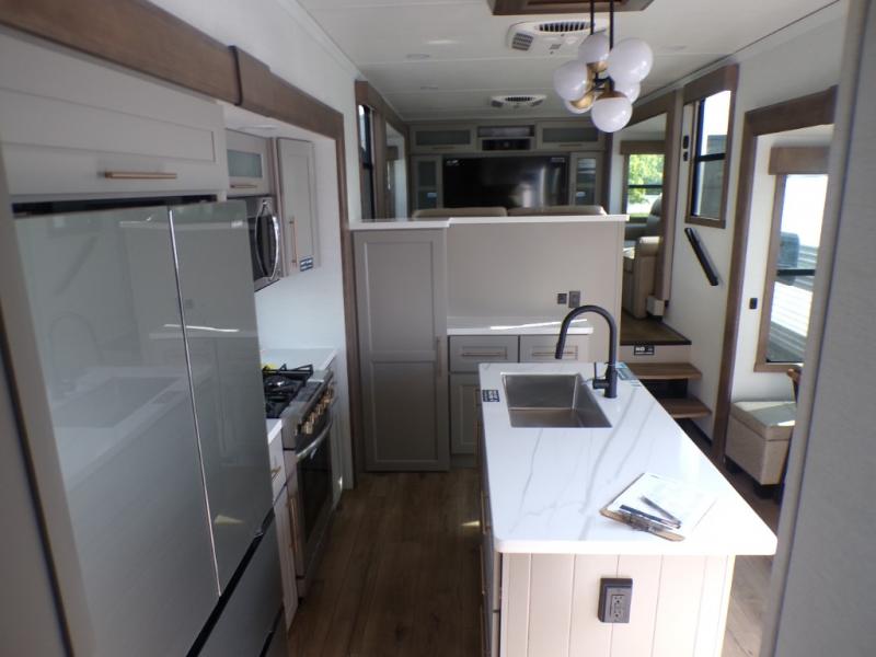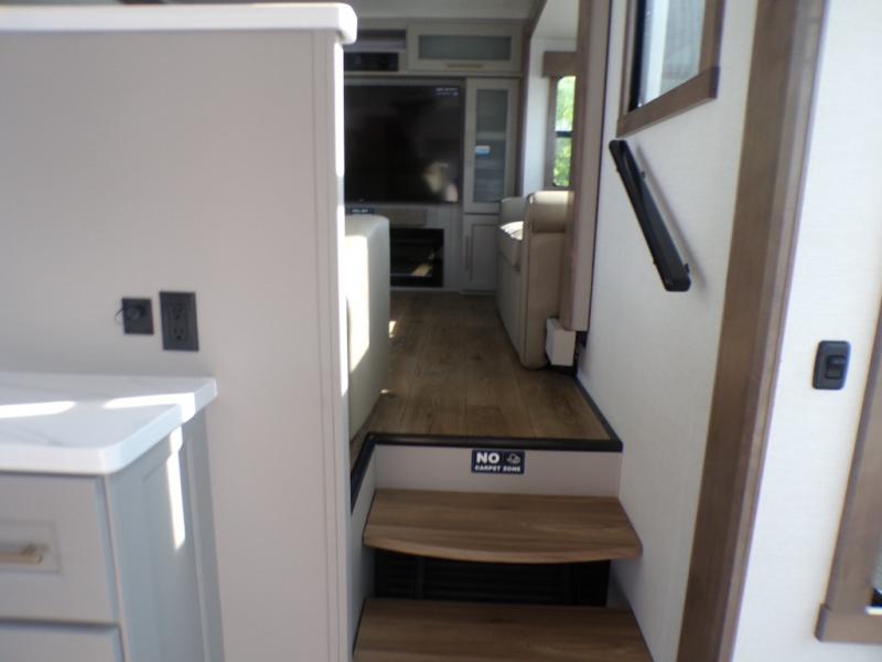 An active family will want this fifth wheel with its 48" x 115" exterior basement pull-out tray for kayaks or extra storage. Just above this area is the master suite with a rear bathroom that offers a residential shower, a porcelain toilet with soft close seat, plus a wardrobe and shelf storage. The king bed slide gives you more floor space, and you will have a seat, a flip-top dresser, and a Smart TV to watch movies in bed. The half bath is next to the main entry which is super convenient, and the middle kitchen is separate from the front living area. The cook will love the residential microwave, range and oven, plus the 19 cu. ft. 12 volt residential refrigerator. There is also a pantry and extra counter space on the kitchen island with a large sink. The views out of the atrium windows in the slide out, which includes the swivel table and desk, are a must see. And when you need to watch the big game, the 55" Smart TV with a pull-out fireplace storage are up front with the dual recliner love seat and two sleeper sofas.