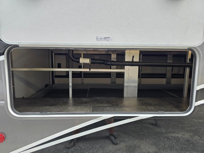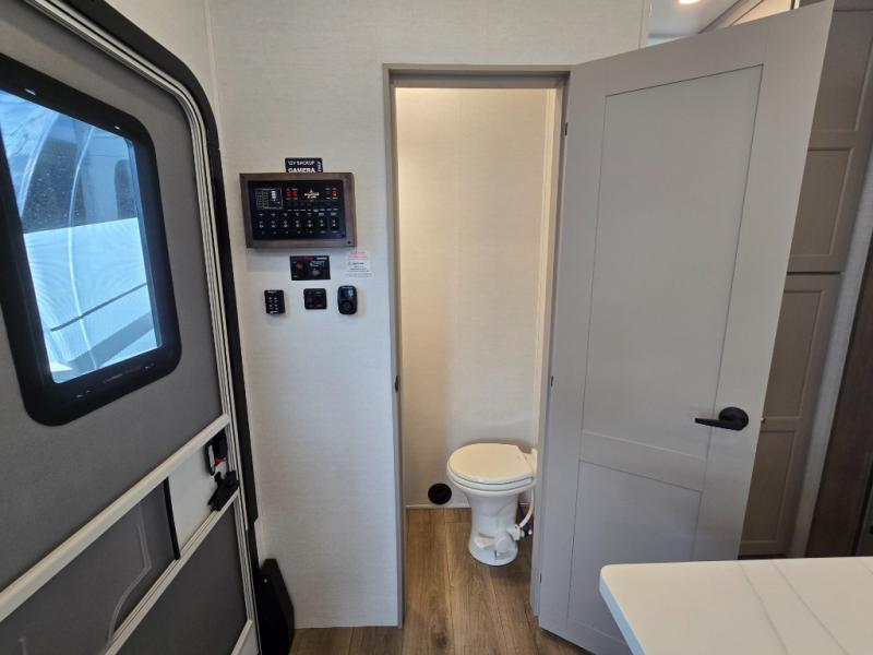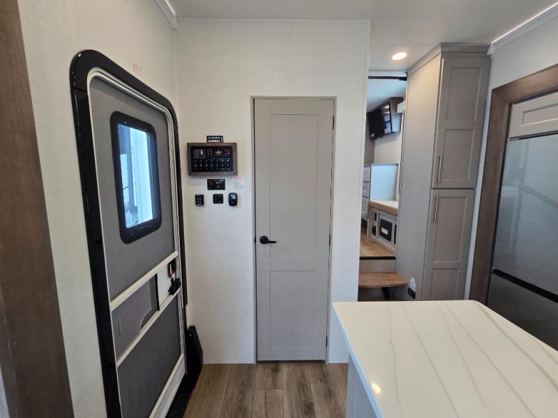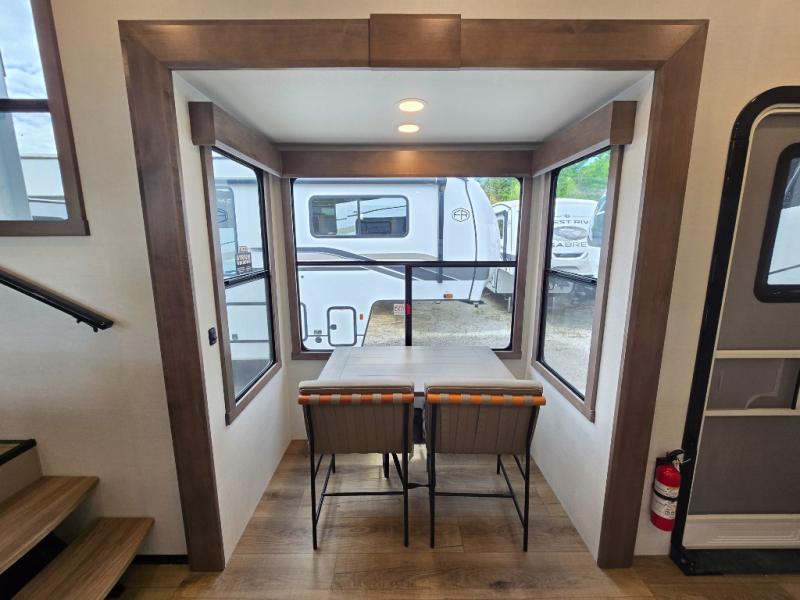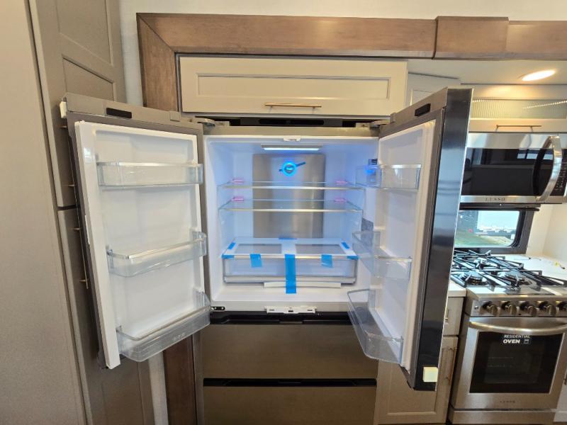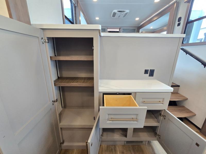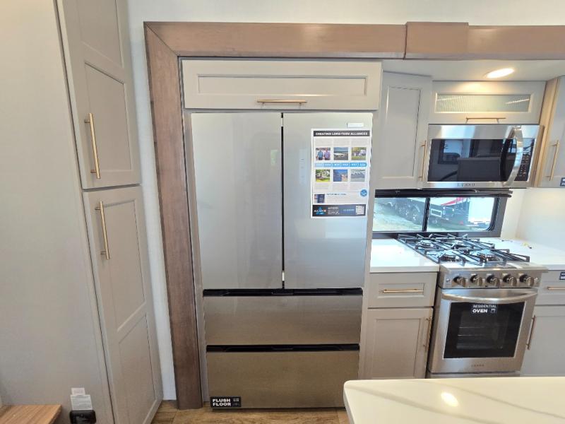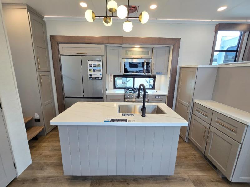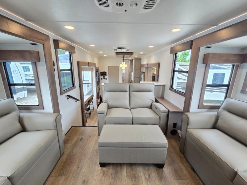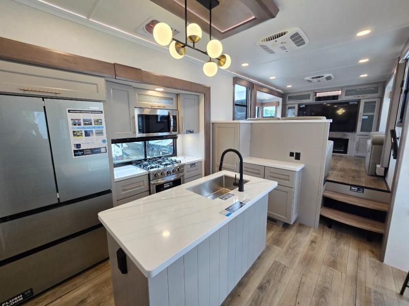 An active family will want this fifth wheel with its 48" x 115" exterior basement pull-out tray for kayaks or extra storage. Just above this area is the master suite with a rear bathroom that offers a residential shower, a porcelain toilet with soft close seat, plus a wardrobe and shelf storage. The king bed slide gives you more floor space, and you will have a seat, a flip-top dresser, and a Smart TV to watch movies in bed. The half bath is next to the main entry which is super convenient, and the middle kitchen is separate from the front living area. The cook will love the residential microwave, range and oven, plus the 19 cu. ft. 12 volt residential refrigerator. There is also a pantry and extra counter space on the kitchen island with a large sink. The views out of the atrium windows in the slide out, which includes the swivel table and desk, are a must see. And when you need to watch the big game, the 55" Smart TV with a pull-out fireplace storage are up front with the dual recliner love seat and two sleeper sofas.