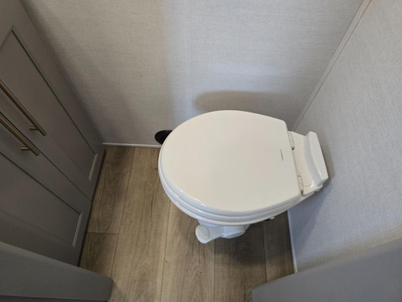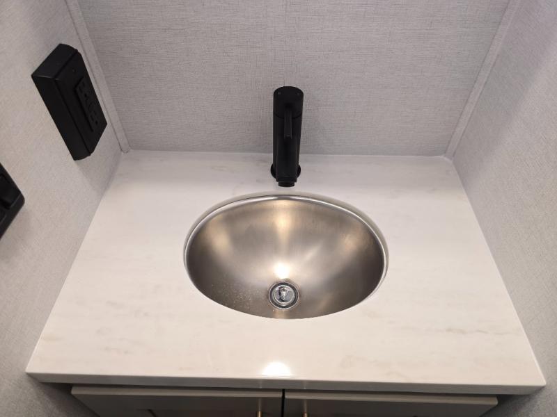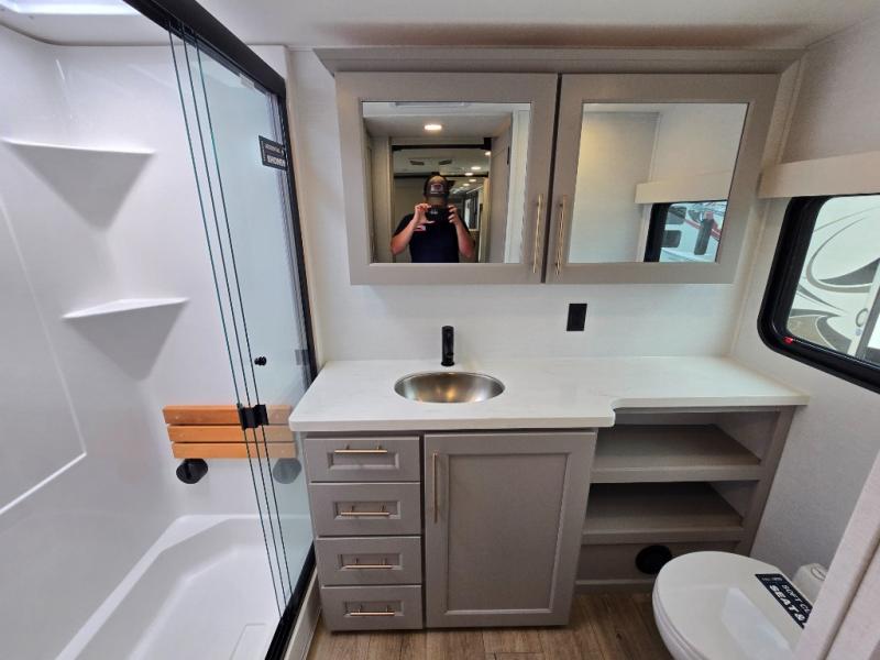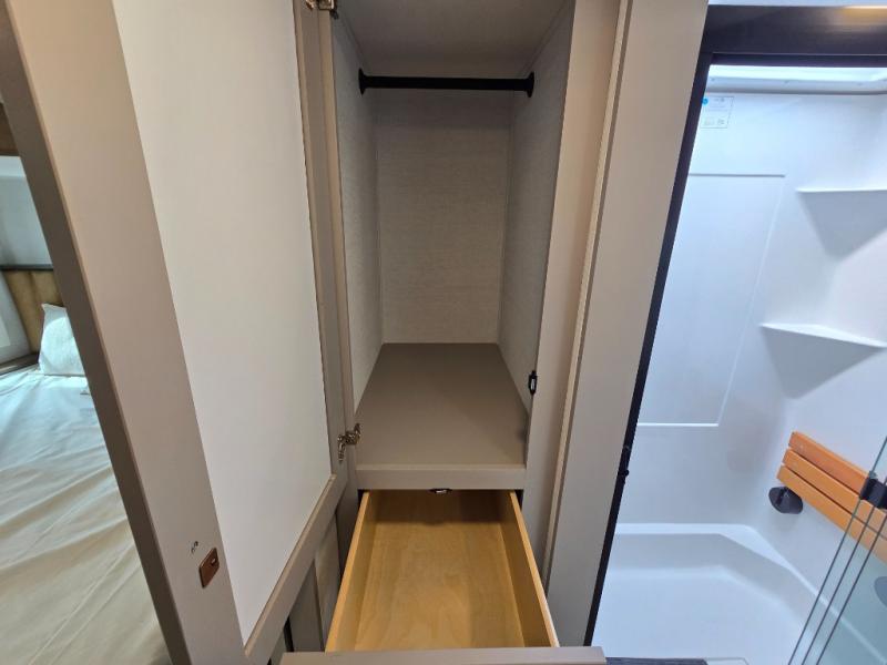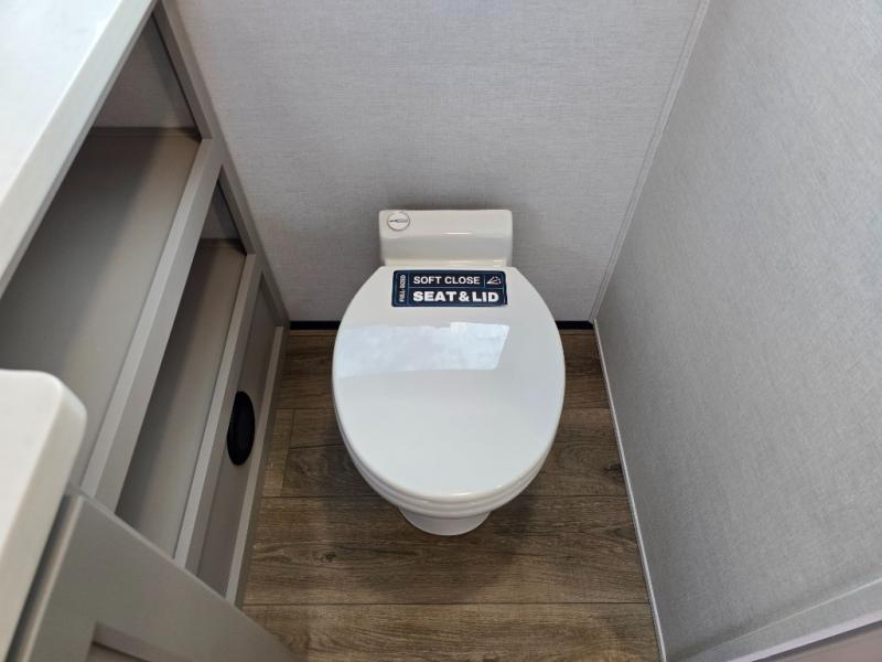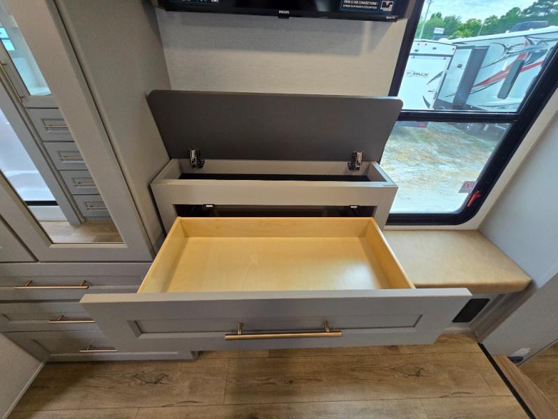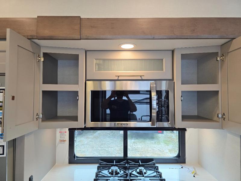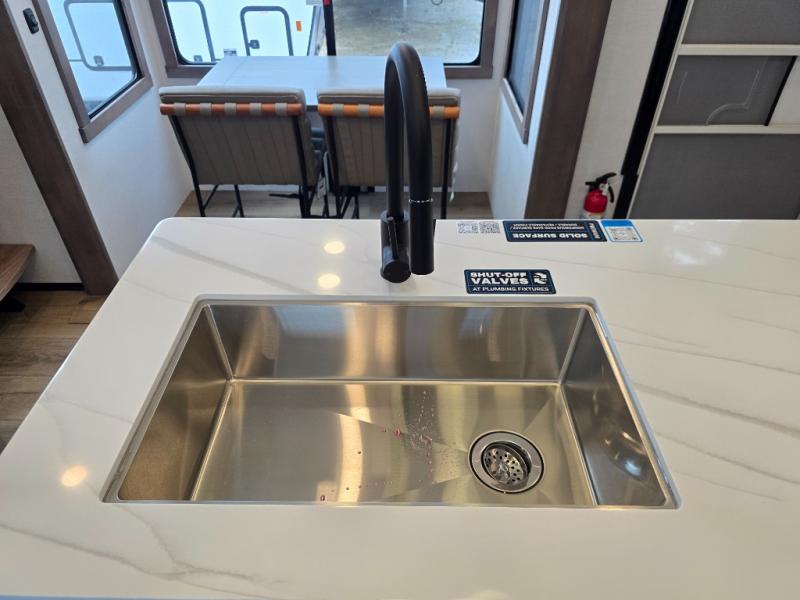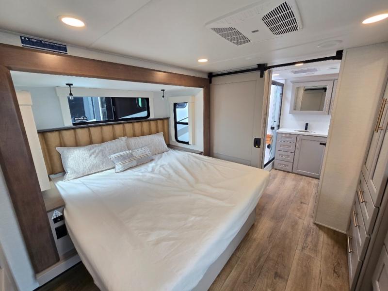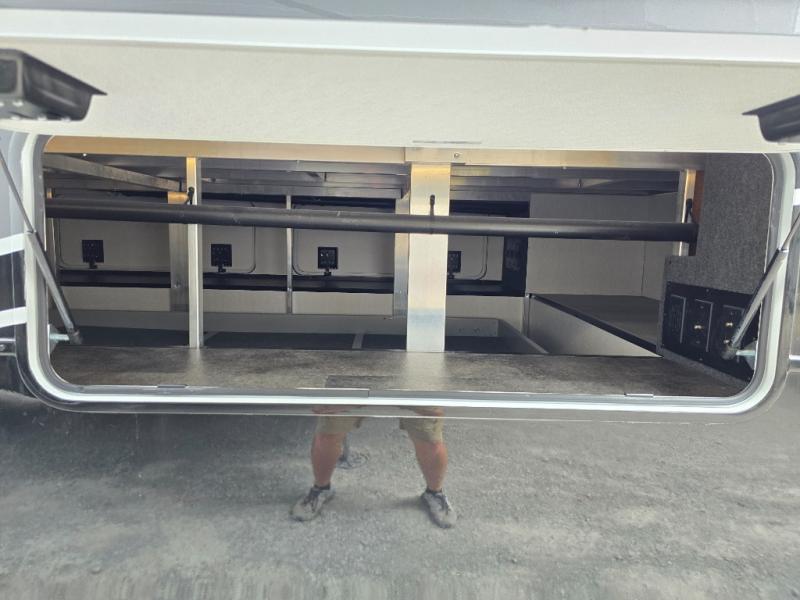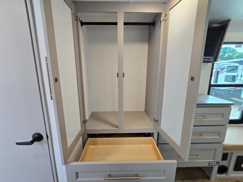An active family will want this fifth wheel with its 48" x 115" exterior basement pull-out tray for kayaks or extra storage. Just above this area is the master suite with a rear bathroom that offers a residential shower, a porcelain toilet with soft close seat, plus a wardrobe and shelf storage. The king bed slide gives you more floor space, and you will have a seat, a flip-top dresser, and a Smart TV to watch movies in bed. The half bath is next to the main entry which is super convenient, and the middle kitchen is separate from the front living area. The cook will love the residential microwave, range and oven, plus the 19 cu. ft. 12 volt residential refrigerator. There is also a pantry and extra counter space on the kitchen island with a large sink. The views out of the atrium windows in the slide out, which includes the swivel table and desk, are a must see. And when you need to watch the big game, the 55" Smart TV with a pull-out fireplace storage are up front with the dual recliner love seat and two sleeper sofas.