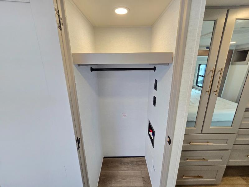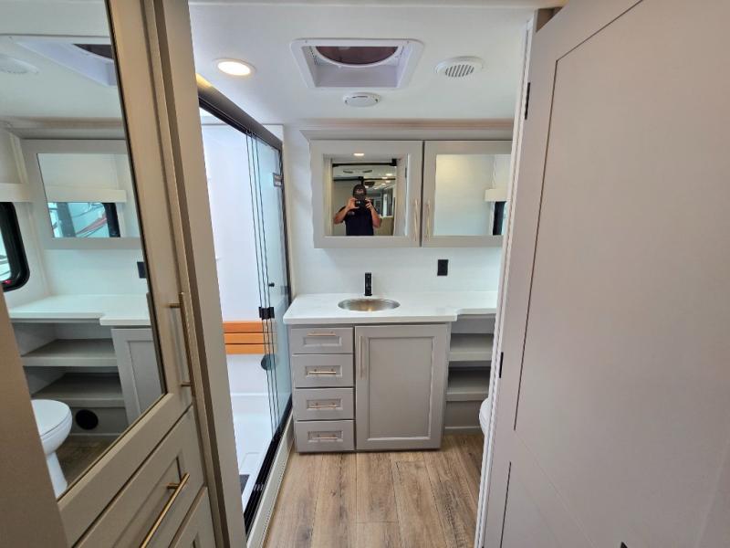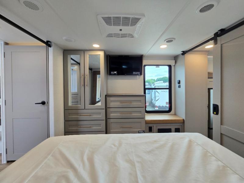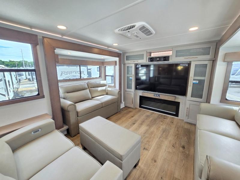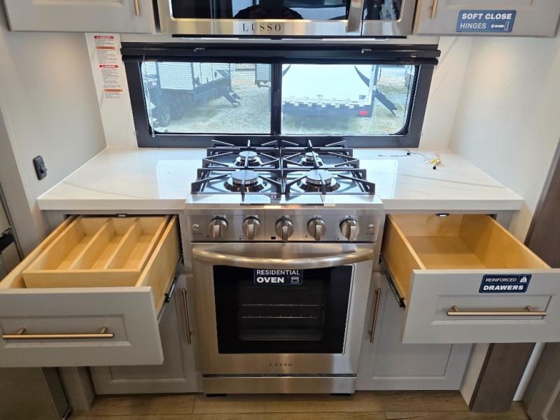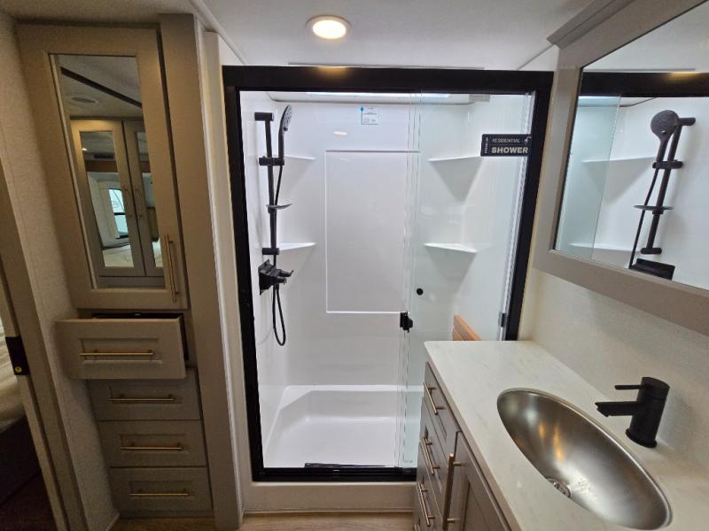 The Paradigm fifth wheels by Alliance RV are functional, high-quality, and luxurious for an unforgettable camping experience. There are three A/C units and a 40K BTU furnace to keep you comfortable year around, and you'll appreciate additional convenient amenities, like the all-in-one enclosed/heated utility center and the color coded and numbered wiring. A Helux Series coil spring pin box comes standard for hassle-free towing, along with Super-G 4,400 lb. rated tires and Dexter 7,000 lb. axles. You'll love the kitchen with its LG solid surface countertops and Lusso range, plus there is LED motion lighting in the pantry and a Maxx fan with a rain sensor to keep everything fresh when making dinner. Each model also includes an HD Smart TV in the living room and bedroom, plus a Winegard Air 360 antenna to keep you connected to the outside world. And of course there are a variety of options you can choose from to further customize your fifth wheel; dual pane windows, Super Solar Plus, slide out awning toppers, and generator prep or a generator to name a few!