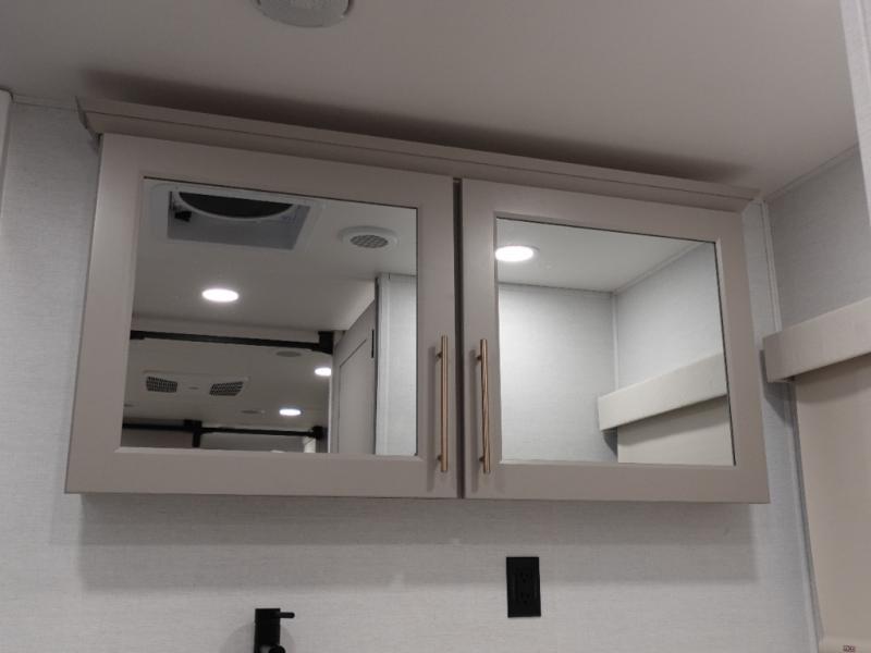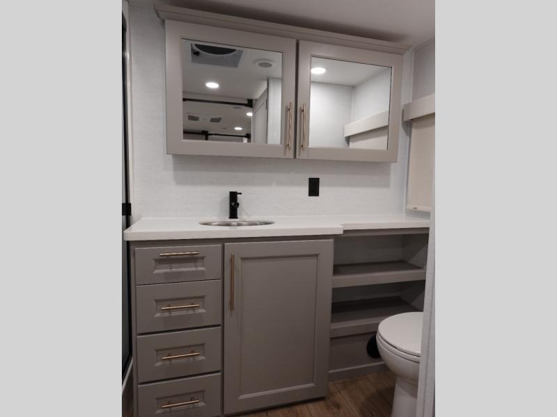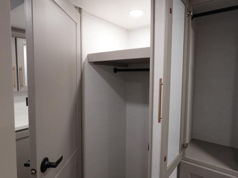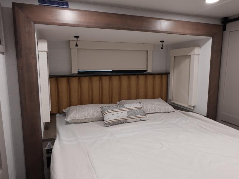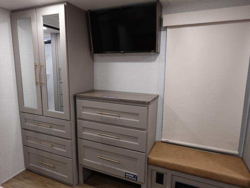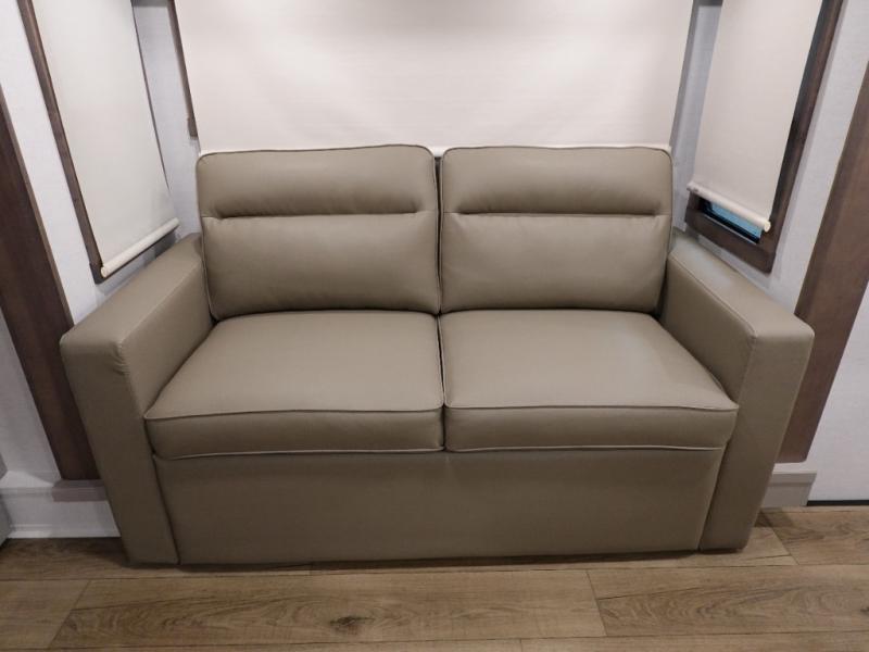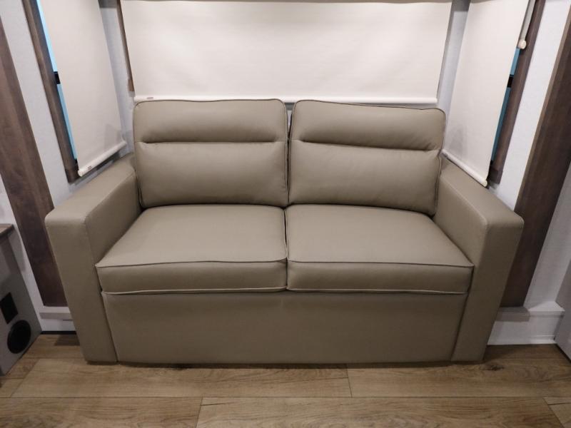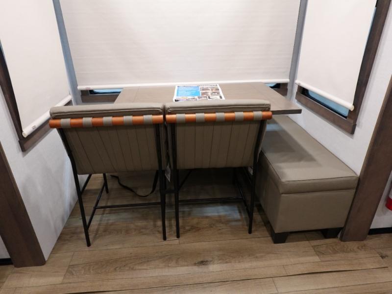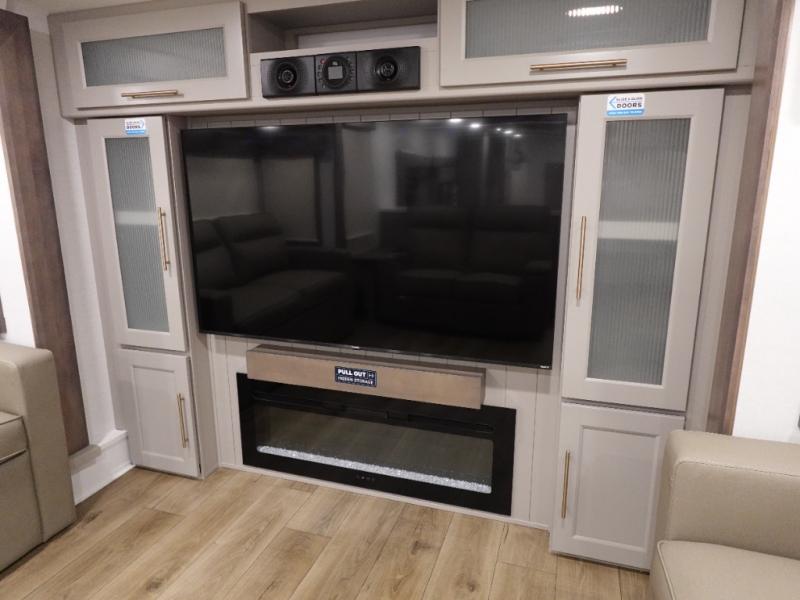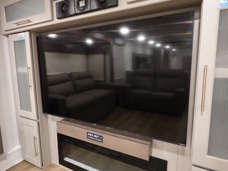 An active family will want this fifth wheel with its 48" x 115" exterior basement pull-out tray for kayaks or extra storage. Just above this area is the master suite with a rear bathroom that offers a residential shower, a porcelain toilet with soft close seat, plus a wardrobe and shelf storage. The king bed slide gives you more floor space, and you will have a seat, a flip-top dresser, and a Smart TV to watch movies in bed. The half bath is next to the main entry which is super convenient, and the middle kitchen is separate from the front living area. The cook will love the residential microwave, range and oven, plus the 19 cu. ft. 12 volt residential refrigerator. There is also a pantry and extra counter space on the kitchen island with a large sink. The views out of the atrium windows in the slide out, which includes the swivel table and desk, are a must see. And when you need to watch the big game, the 55" Smart TV with a pull-out fireplace storage are up front with the dual recliner love seat and two sleeper sofas.