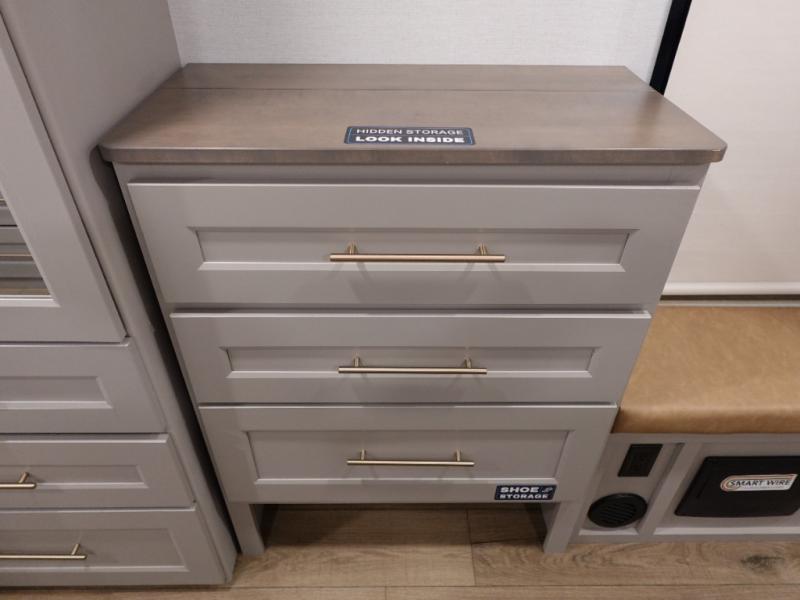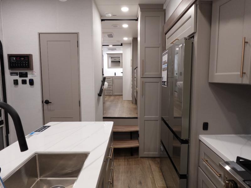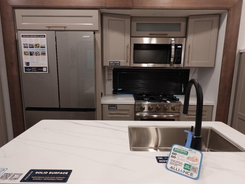 The Paradigm fifth wheels by Alliance RV are functional, high-quality, and luxurious for an unforgettable camping experience. There are three A/C units and a 40K BTU furnace to keep you comfortable year around, and you'll appreciate additional convenient amenities, like the all-in-one enclosed/heated utility center and the color coded and numbered wiring. A Helux Series coil spring pin box comes standard for hassle-free towing, along with Super-G 4,400 lb. rated tires and Dexter 7,000 lb. axles. You'll love the kitchen with its LG solid surface countertops and Lusso range, plus there is LED motion lighting in the pantry and a Maxx fan with a rain sensor to keep everything fresh when making dinner. Each model also includes an HD Smart TV in the living room and bedroom, plus a Winegard Air 360 antenna to keep you connected to the outside world.