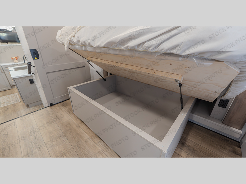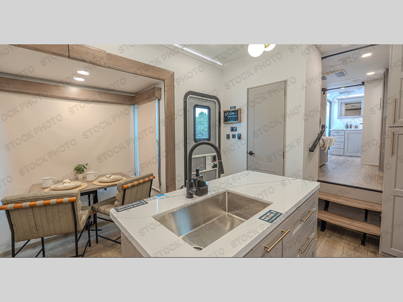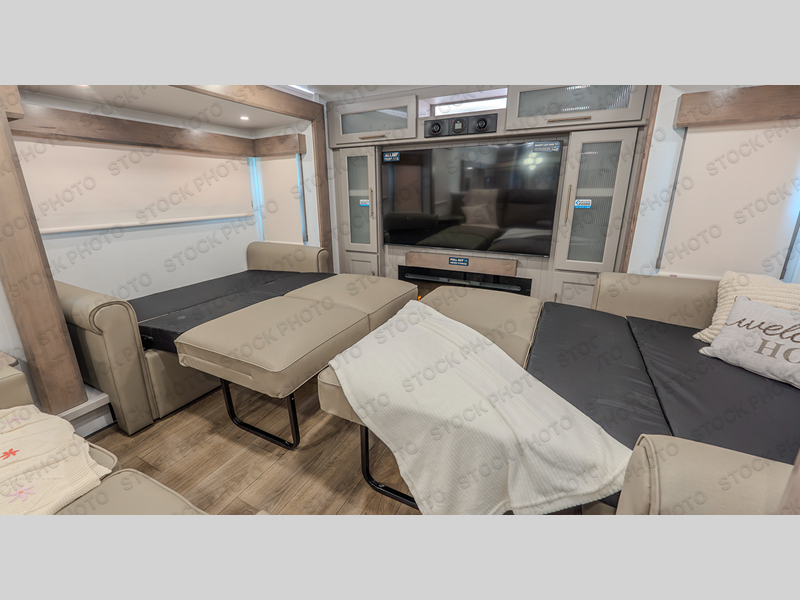 An active family will want this fifth wheel with its 48" x 115" exterior basement pull-out tray for kayaks or extra storage. Just above this area is the master suite with a rear bathroom that offers a residential shower, a porcelain toilet with soft close seat, plus a wardrobe and shelf storage. The king bed slide gives you more floor space, and you will have a seat, a flip-top dresser, and a Smart TV to watch movies in bed. The half bath is next to the main entry which is super convenient, and the middle kitchen is separate from the front living area. The cook will love the residential microwave, range and oven, plus the 19 cu. ft. 12 volt residential refrigerator. There is also a pantry and extra counter space on the kitchen island with a large sink. The views out of the atrium windows in the slide out, which includes the swivel table and desk, are a must see. And when you need to watch the big game, the 55" Smart TV with a pull-out fireplace storage are up front with the dual recliner love seat and two sleeper sofas.
