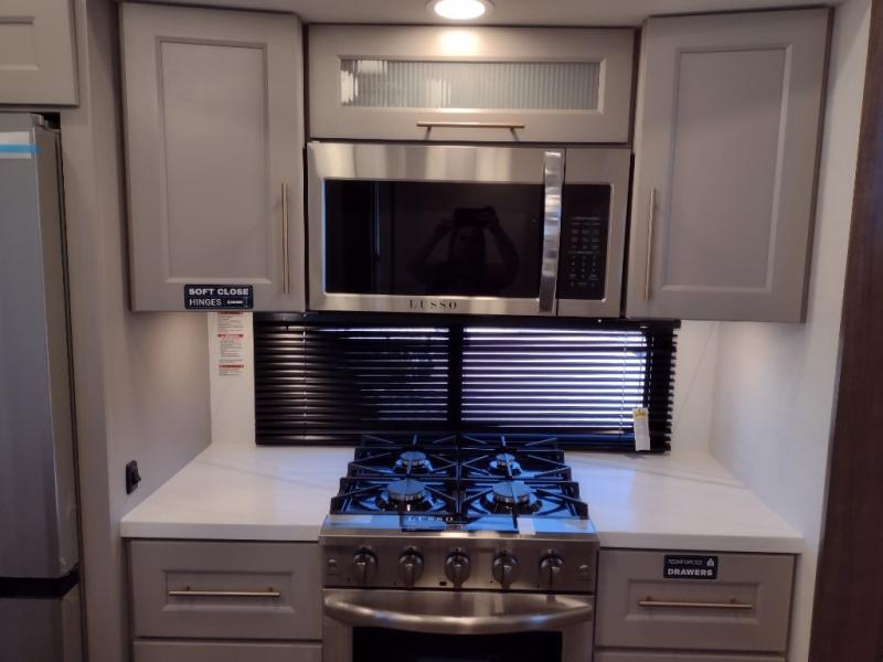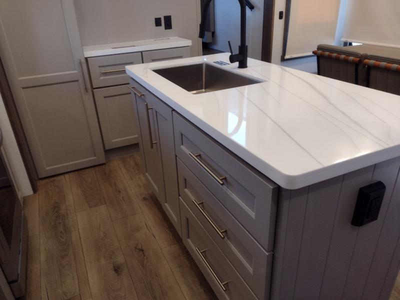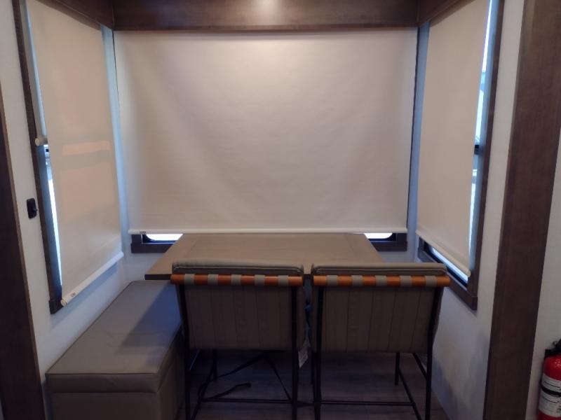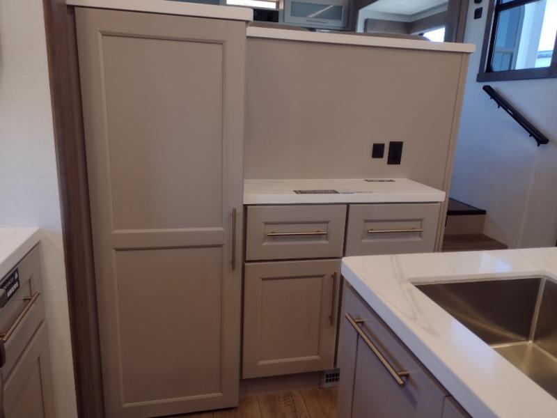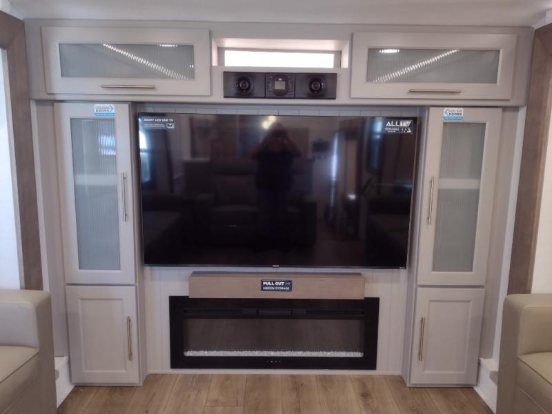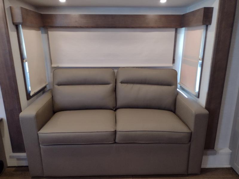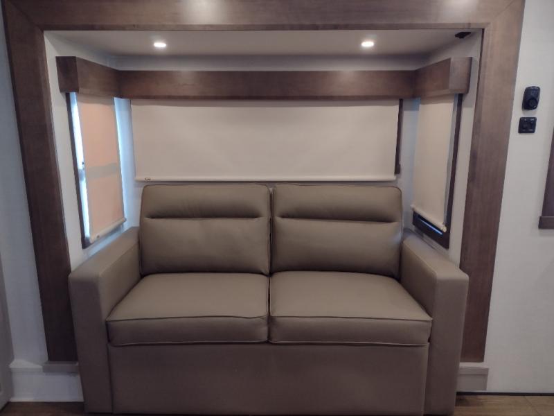 An active family will want this fifth wheel with its 48" x 115" exterior basement pull-out tray for kayaks or extra storage. Just above this area is the master suite with a rear bathroom that offers a residential shower, a porcelain toilet with soft close seat, plus a wardrobe and shelf storage. The king bed slide gives you more floor space, and you will have a seat, a flip-top dresser, and a Smart TV to watch movies in bed. The half bath is next to the main entry which is super convenient, and the middle kitchen is separate from the front living area. The cook will love the residential microwave, range and oven, plus the 19 cu. ft. 12 volt residential refrigerator. There is also a pantry and extra counter space on the kitchen island with a large sink. The views out of the atrium windows in the slide out, which includes the swivel table and desk, are a must see. And when you need to watch the big game, the 55" Smart TV with a pull-out fireplace storage are up front with the dual recliner love seat and two sleeper sofas.