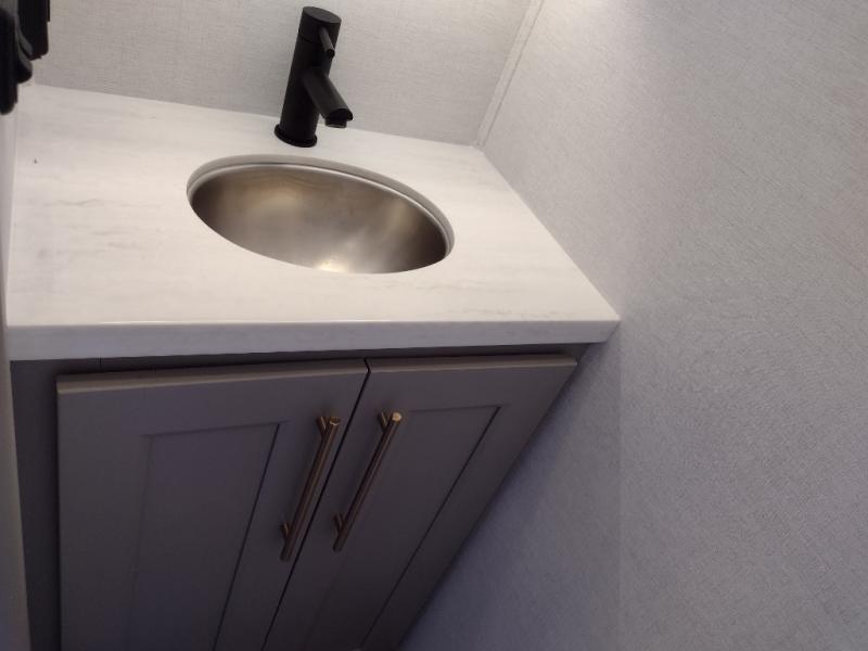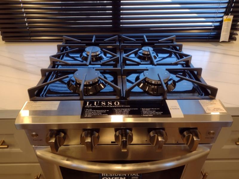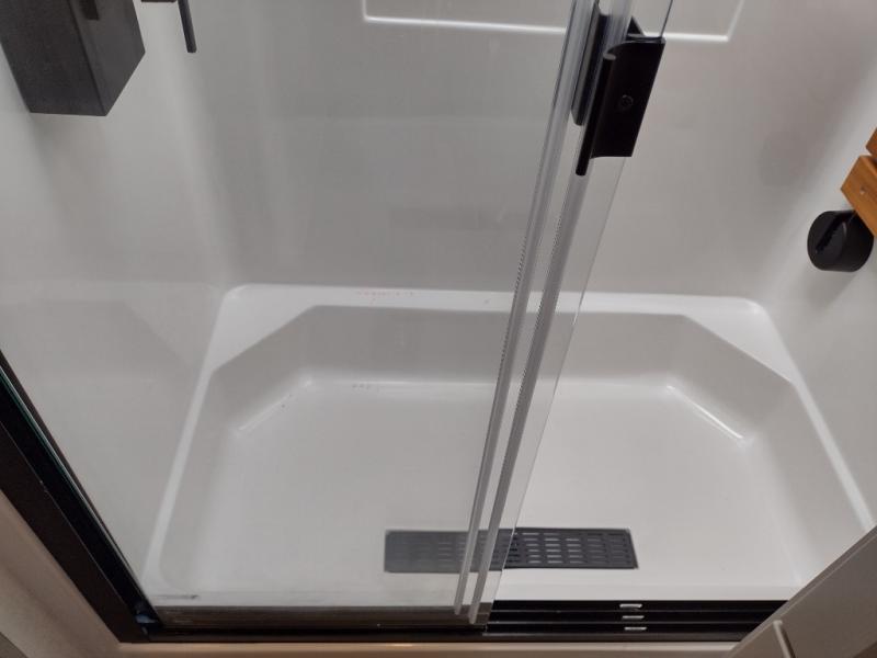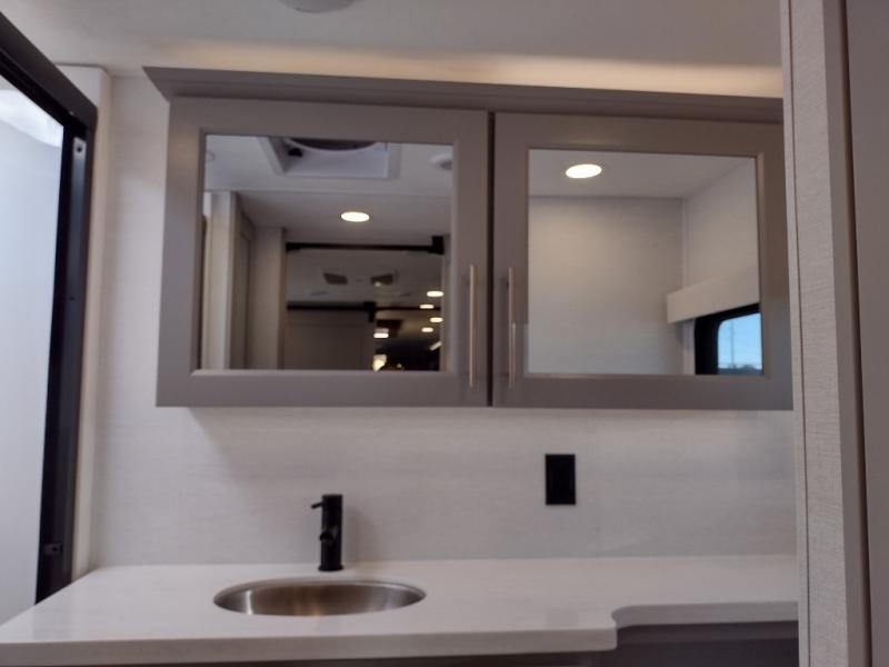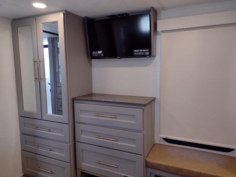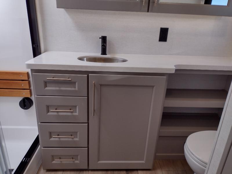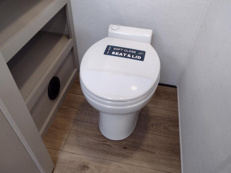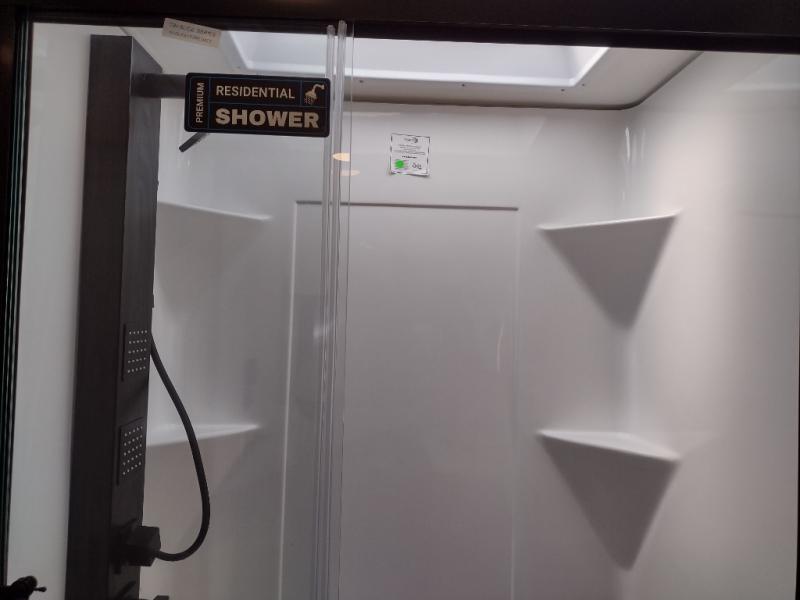 An active family will want this fifth wheel with its 48" x 115" exterior basement pull-out tray for kayaks or extra storage. Just above this area is the master suite with a rear bathroom that offers a residential shower, a porcelain toilet with soft close seat, plus a wardrobe and shelf storage. The king bed slide gives you more floor space, and you will have a seat, a flip-top dresser, and a Smart TV to watch movies in bed. The half bath is next to the main entry which is super convenient, and the middle kitchen is separate from the front living area. The cook will love the residential microwave, range and oven, plus the 19 cu. ft. 12 volt residential refrigerator. There is also a pantry and extra counter space on the kitchen island with a large sink. The views out of the atrium windows in the slide out, which includes the swivel table and desk, are a must see. And when you need to watch the big game, the 55" Smart TV with a pull-out fireplace storage are up front with the dual recliner love seat and two sleeper sofas.