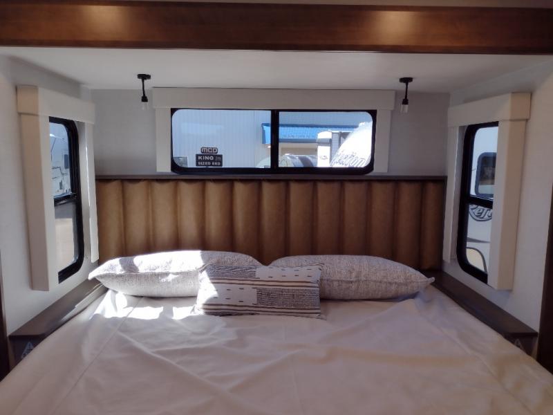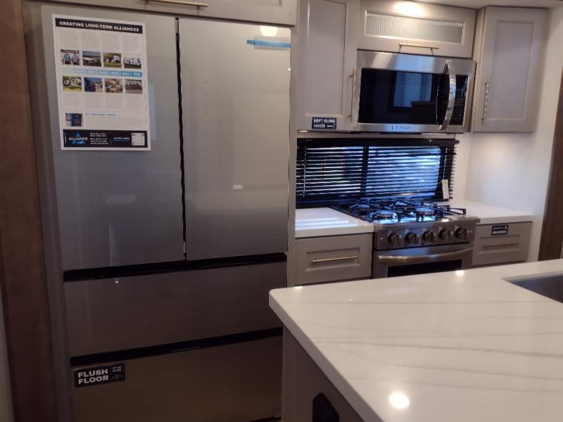The Paradigm fifth wheels by Alliance RV are functional, high-quality, and luxurious for an unforgettable camping experience. There are three A/C units and a 40K BTU furnace to keep you comfortable year around, and you'll appreciate additional convenient amenities, like the all-in-one enclosed/heated utility center and the color coded and numbered wiring. A Helux Series coil spring pin box comes standard for hassle-free towing, along with Super-G 4,400 lb. rated tires and Dexter 7,000 lb. axles. You'll love the kitchen with its LG solid surface countertops and Lusso range, plus there is LED motion lighting in the pantry and a Maxx fan with a rain sensor to keep everything fresh when making dinner. Each model also includes an HD Smart TV in the living room and bedroom, plus a Winegard Air 360 antenna to keep you connected to the outside world. And of course there are a variety of options you can choose from to further customize your fifth wheel; dual pane windows, Super Solar Plus, slide out awning toppers, and generator prep or a generator to name a few!