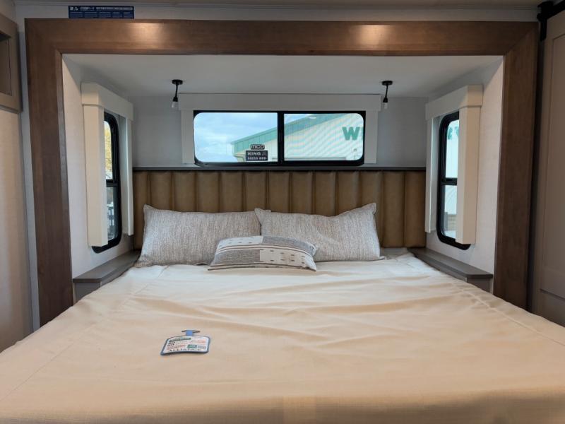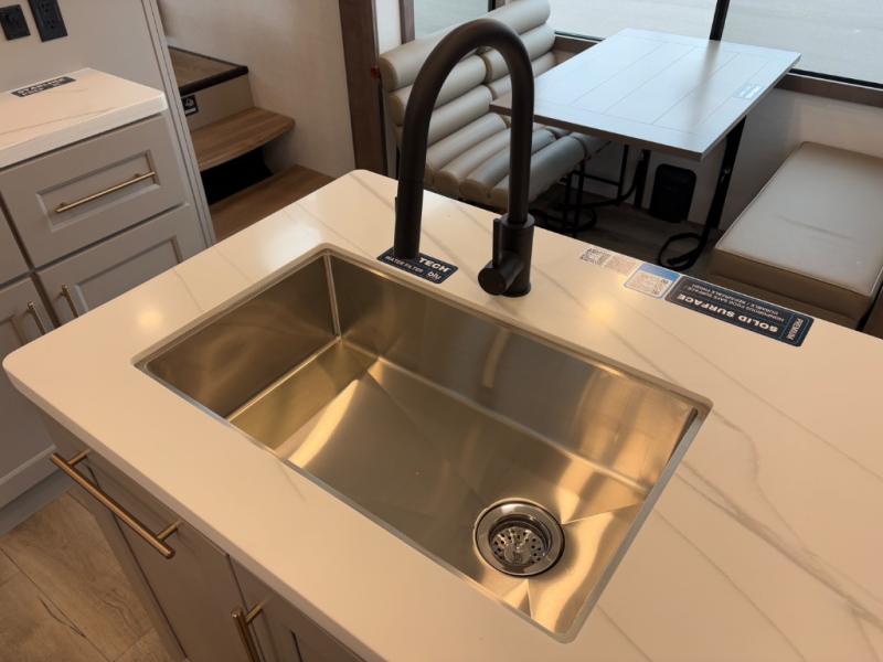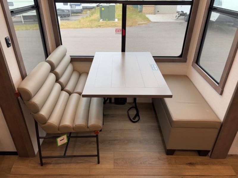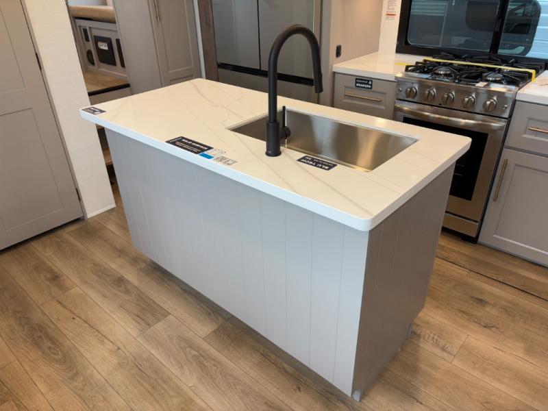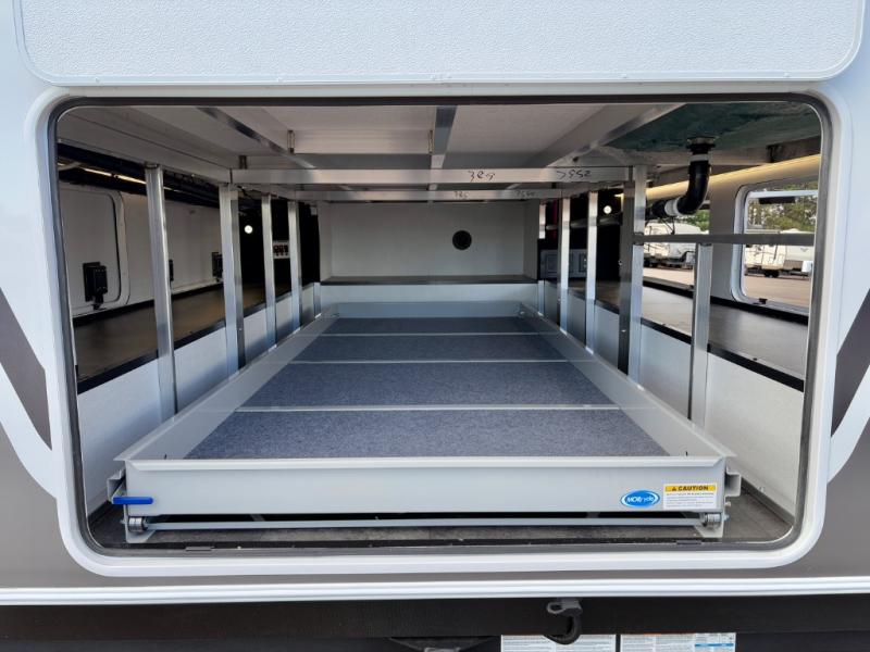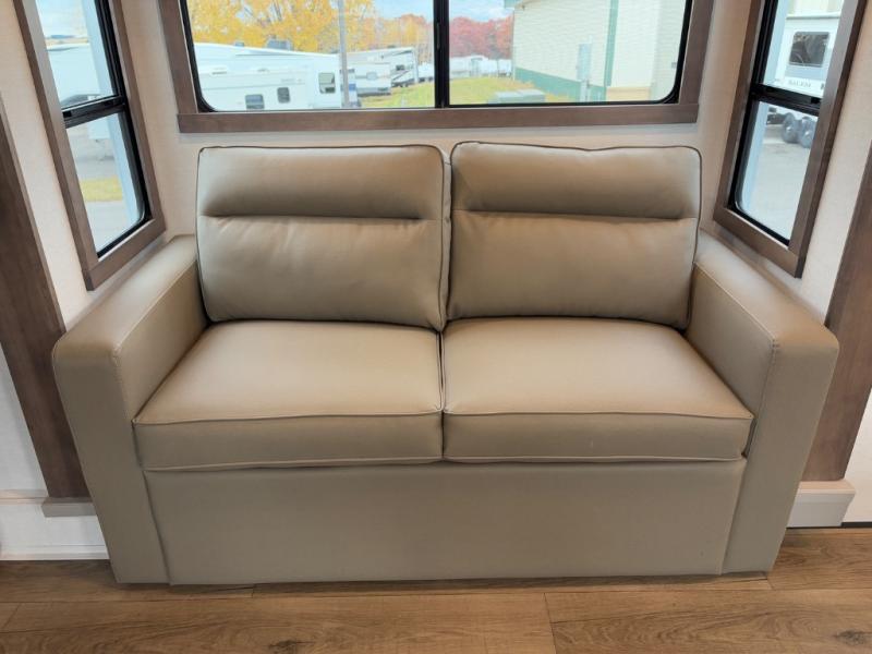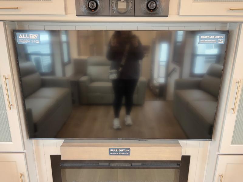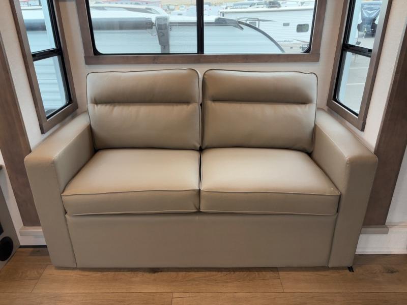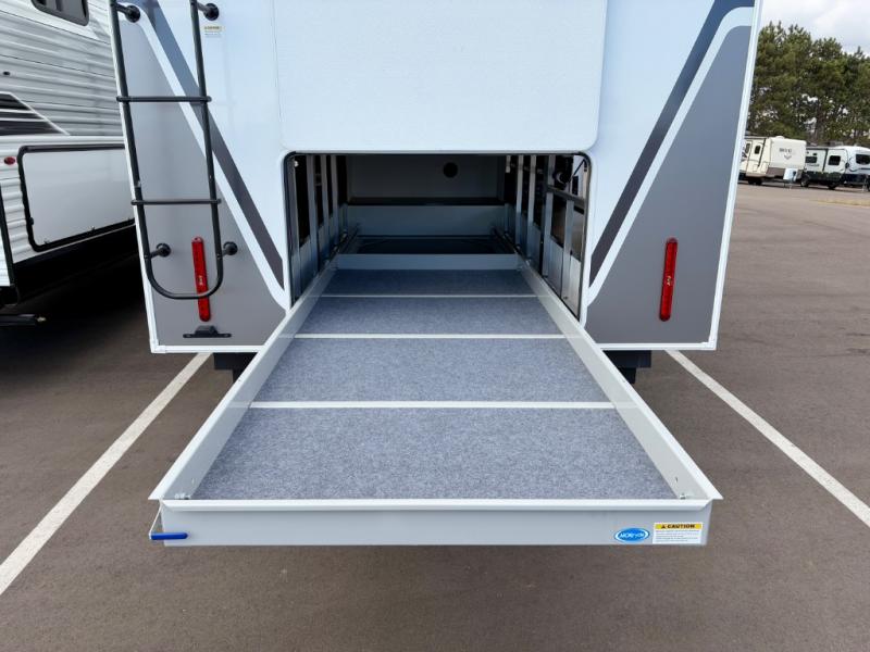 An active family will want this fifth wheel with its 48" x 115" exterior basement pull-out tray for kayaks or extra storage. Just above this area is the master suite with a rear bathroom that offers a residential shower, a porcelain toilet with soft close seat, plus a wardrobe and shelf storage. The king bed slide gives you more floor space, and you will have a seat, a flip-top dresser, and a Smart TV to watch movies in bed. The half bath is next to the main entry which is super convenient, and the middle kitchen is separate from the front living area. The cook will love the residential microwave, range and oven, plus the 19 cu. ft. 12 volt residential refrigerator. There is also a pantry and extra counter space on the kitchen island with a large sink. The views out of the atrium windows in the slide out, which includes the swivel table and desk, are a must see. And when you need to watch the big game, the 55" Smart TV with a pull-out fireplace storage are up front with the dual recliner love seat and two sleeper sofas.