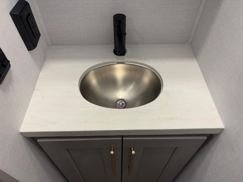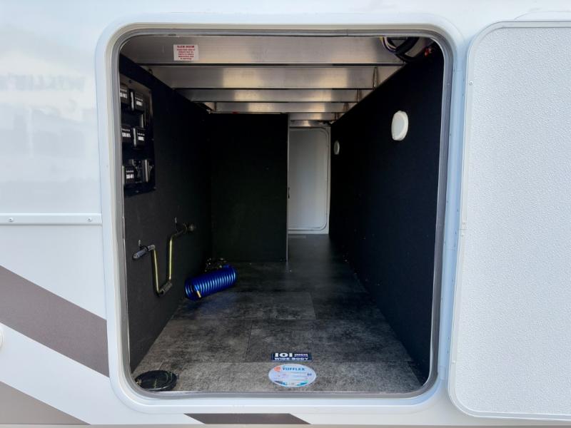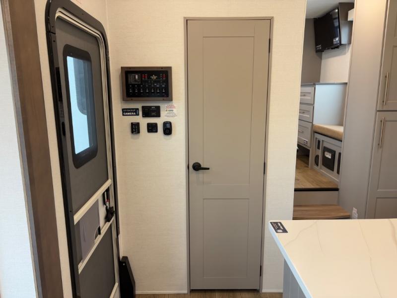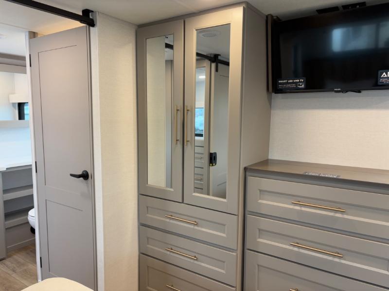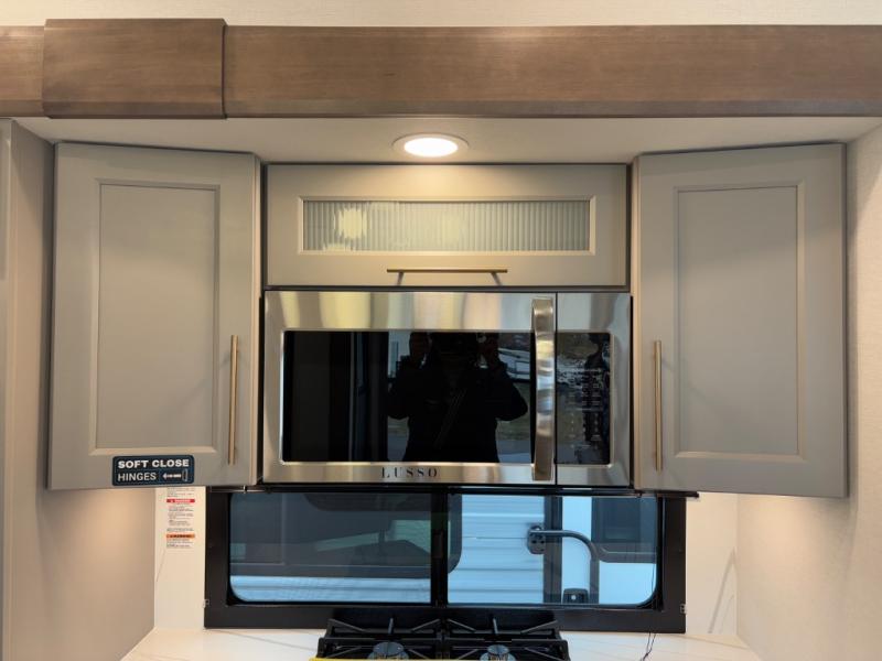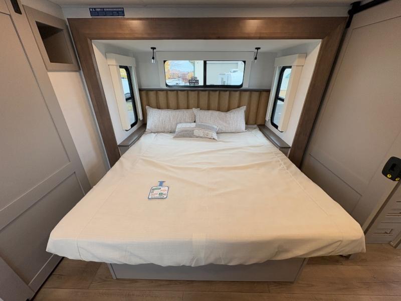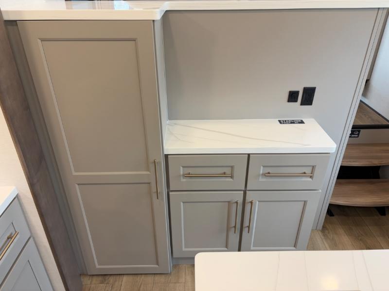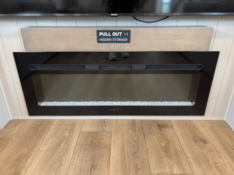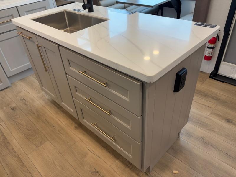 An active family will want this fifth wheel with its 48" x 115" exterior basement pull-out tray for kayaks or extra storage. Just above this area is the master suite with a rear bathroom that offers a residential shower, a porcelain toilet with soft close seat, plus a wardrobe and shelf storage. The king bed slide gives you more floor space, and you will have a seat, a flip-top dresser, and a Smart TV to watch movies in bed. The half bath is next to the main entry which is super convenient, and the middle kitchen is separate from the front living area. The cook will love the residential microwave, range and oven, plus the 19 cu. ft. 12 volt residential refrigerator. There is also a pantry and extra counter space on the kitchen island with a large sink. The views out of the atrium windows in the slide out, which includes the swivel table and desk, are a must see. And when you need to watch the big game, the 55" Smart TV with a pull-out fireplace storage are up front with the dual recliner love seat and two sleeper sofas.