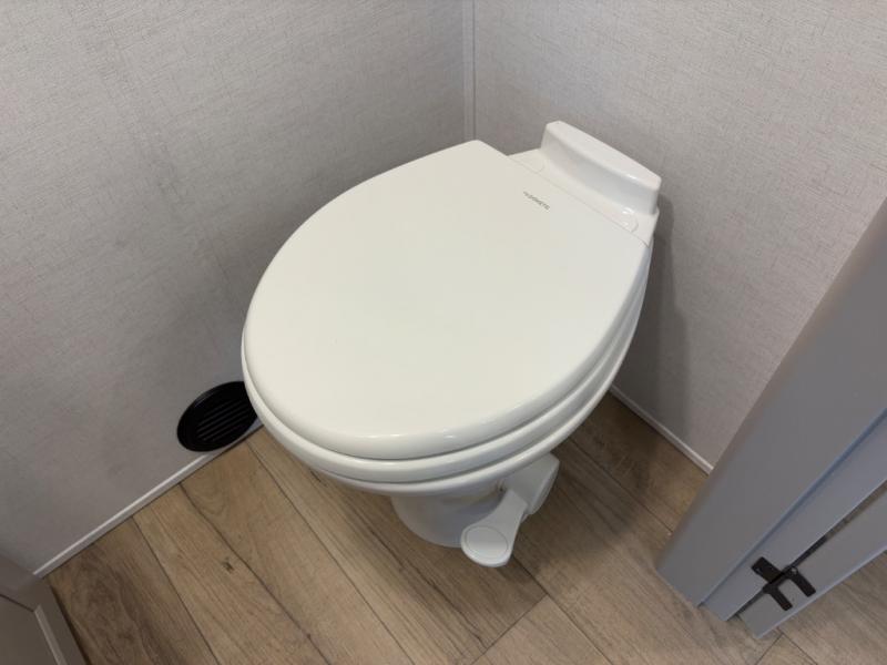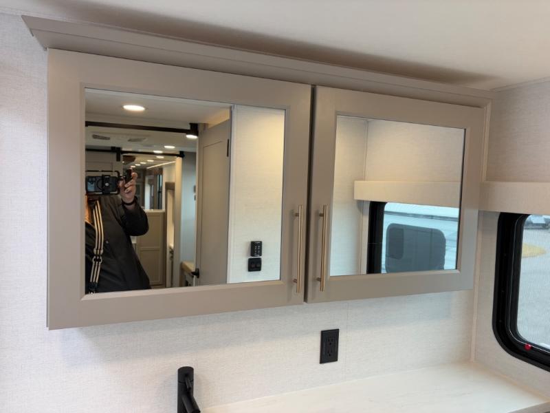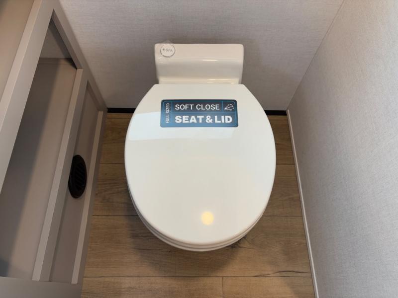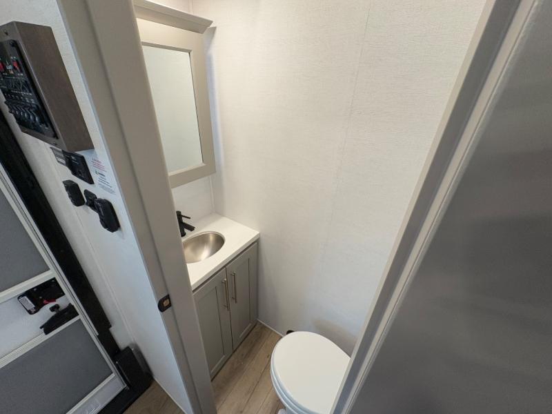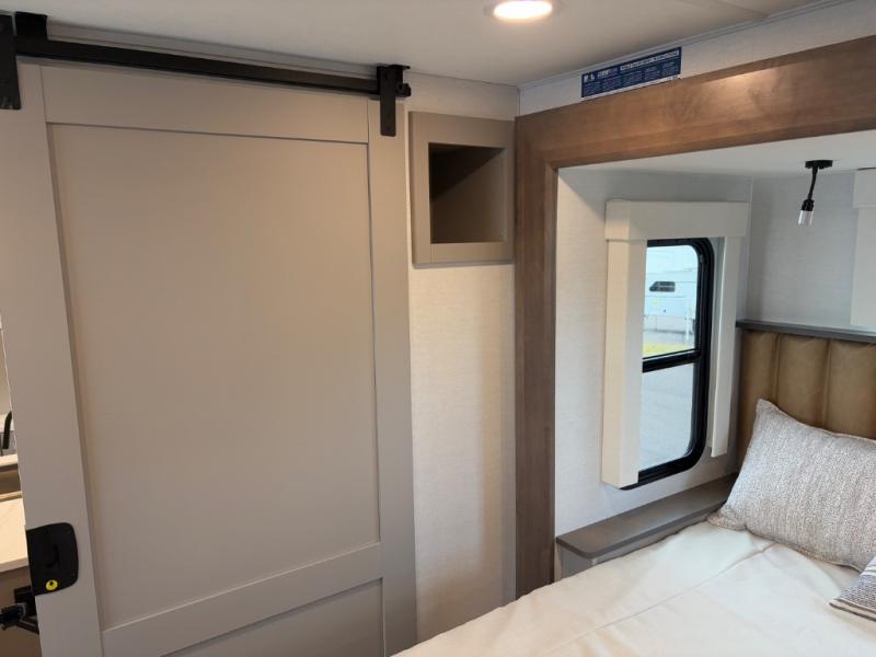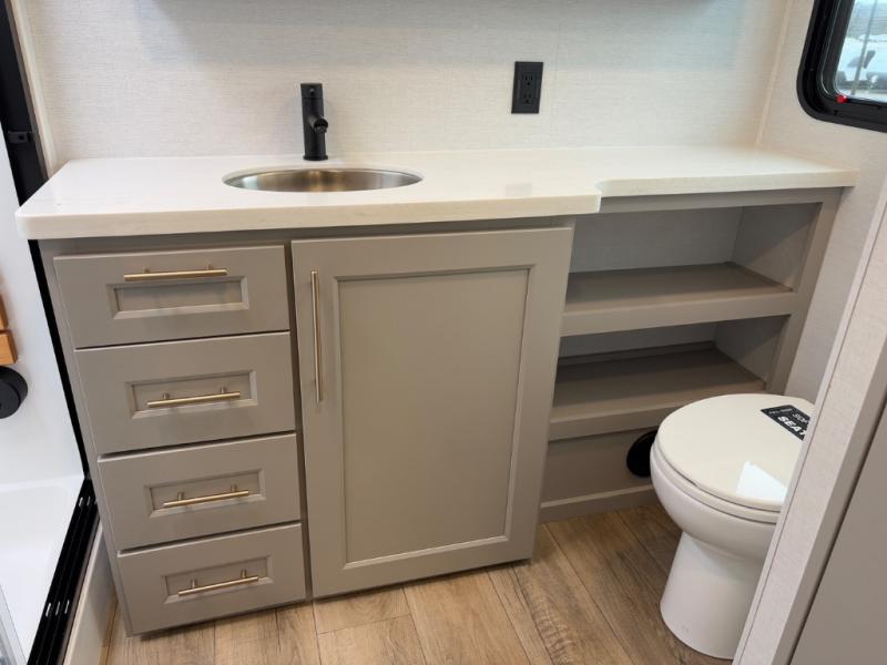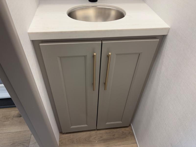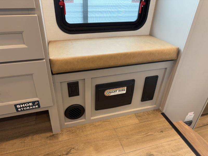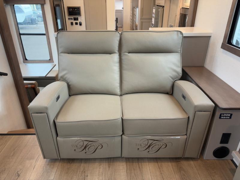 An active family will want this fifth wheel with its 48" x 115" exterior basement pull-out tray for kayaks or extra storage. Just above this area is the master suite with a rear bathroom that offers a residential shower, a porcelain toilet with soft close seat, plus a wardrobe and shelf storage. The king bed slide gives you more floor space, and you will have a seat, a flip-top dresser, and a Smart TV to watch movies in bed. The half bath is next to the main entry which is super convenient, and the middle kitchen is separate from the front living area. The cook will love the residential microwave, range and oven, plus the 19 cu. ft. 12 volt residential refrigerator. There is also a pantry and extra counter space on the kitchen island with a large sink. The views out of the atrium windows in the slide out, which includes the swivel table and desk, are a must see. And when you need to watch the big game, the 55" Smart TV with a pull-out fireplace storage are up front with the dual recliner love seat and two sleeper sofas.